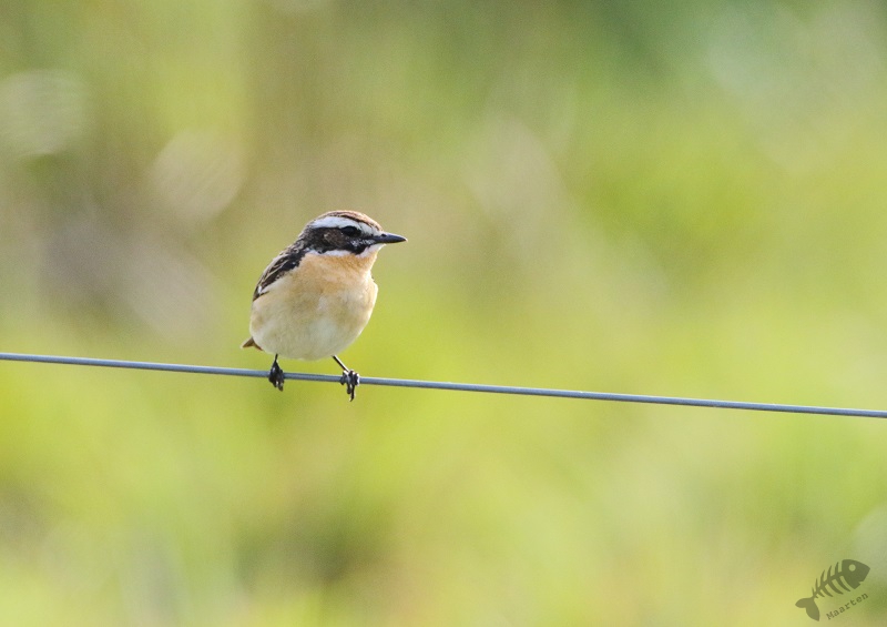 Tijdens een kort bezoek aan de schuilhut met zijn Boerenzwaluwen en op de achtergrond de zang van een Wielewaal, dronken we het eerste bakkie koffie en daarna zijn we verder gereden naar het fietspad. Op weg ernaartoe zat op de paaltjes en de draad de hele familie Tapuit weer: het begon met een vrouwtje Roodborsttapuit, daarna een Tapuit gevolgd door een Paapje (nu hier dus…), om af te sluiten met het mannetje van de Roodborsttapuit. Zo had ik de hele familie al compleet. Bij het fietspad zijn we gaan lopen om te zien of er weer Paapjes wilden zingen en misschien zat er wel weer een Adder… Maar nee. Paapjes zaten er niet. En ook geen Adders. Het gebied was een stuk kaler dan vorig jaar en droger en we moesten een stukje lopen voor we de eerste vogels zagen. Eerst was er een Grasmus en iets daarna zagen we een Koekoek in een soort Vliegden landen. Ik heb enkele filmpjes gemaakt en zo mooi kunnen zien hoe het eigenlijke “Koekoeken” gaat: ze neemt een hap lucht, krijgt daardoor een volle krop gevuld met lucht wat ze dan met een het welluidende “Koekoek” weer laat gaan. Het waaide alleen veel te hard om het geluid goed te horen en voor de foto’s werd het licht alweer veel te hard. We besloten het pad tot de Friese grens maar verder af te lopen, om te zien of daar misschien de Paapjes en Adders zouden zitten.