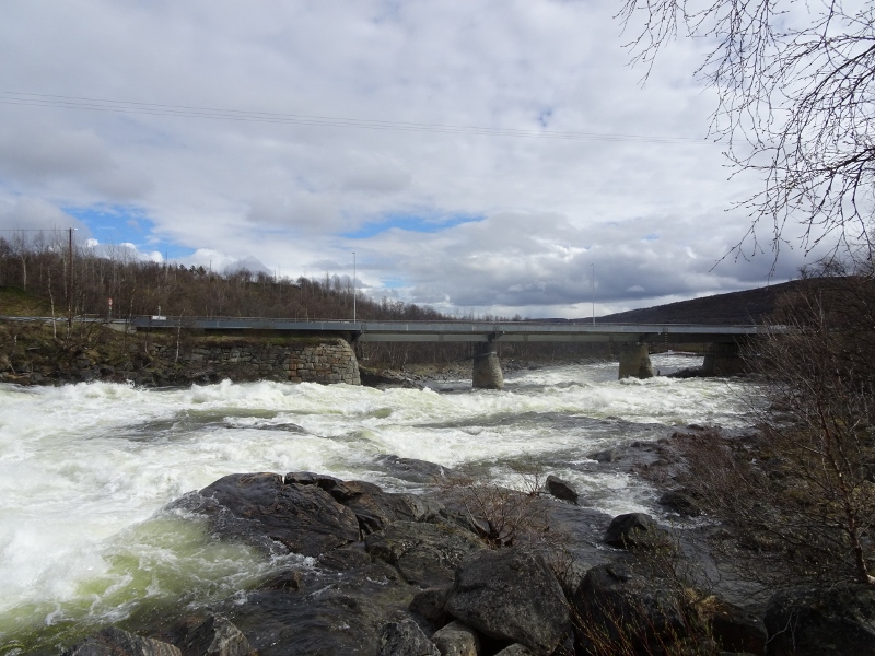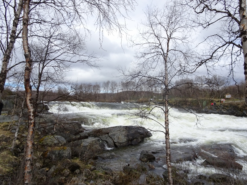 Het weer leek sub-optimaal, het was zwaar bewolkt, maar nog droog en ik schoot lekker op om net voor Neiden een eerste stop te maken. Vanaf dit punt had ik een mooi uitzicht over het Munkefjorden en terwijl ik bezig was daar foto’s van te maken, hoorde ik een eerste zang die ik niet thuis kon brengen. Dat was natuurlijk zo: de vogels die bij ons overwinteren zijn stil en ik ken van de meeste de zang niet. Dat zou nog wel eens lastig kunnen worden… Gelukkig liet de zanger zich na even zien en bleek het een Blauwborst te zijn, maar natuurlijk de roodgesternde variant! Vastleggen lukte niet, maar nu ik het geluid een keer gehoord had, zou het wel blijven hangen. Het leek een beetje op de zang van de witgesternde vogels van ons, wat klank betreft, maar dan een ander liedje. Ik hoopte van harte dat deze prachtige soort nog een keer voor de camera zou willen gaan zitten. Bij Neiden passeer je de Njávdánjohka en wel op het punt waar de rivier door de Skoltefossen waterval loopt. Dat was nog wel even de moeite waard om te stoppen. Massa’s smeltwater perst zich hier door een vernauwing wat een spectaculair gezicht én geluid geeft! Ik ontmoette er een Nederlands echtpaar wat al 3 maanden aan het rondtrekken was in hun camper en hoopte in oktober weer terug te zijn… Wat moet dat heerlijk zijn…