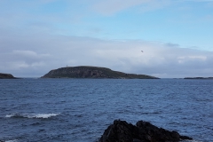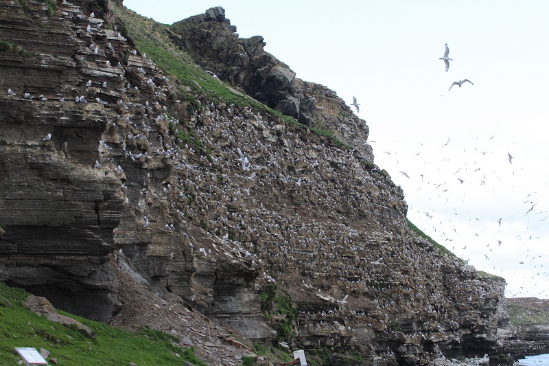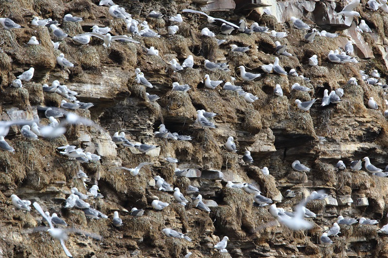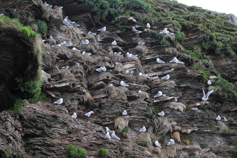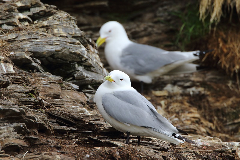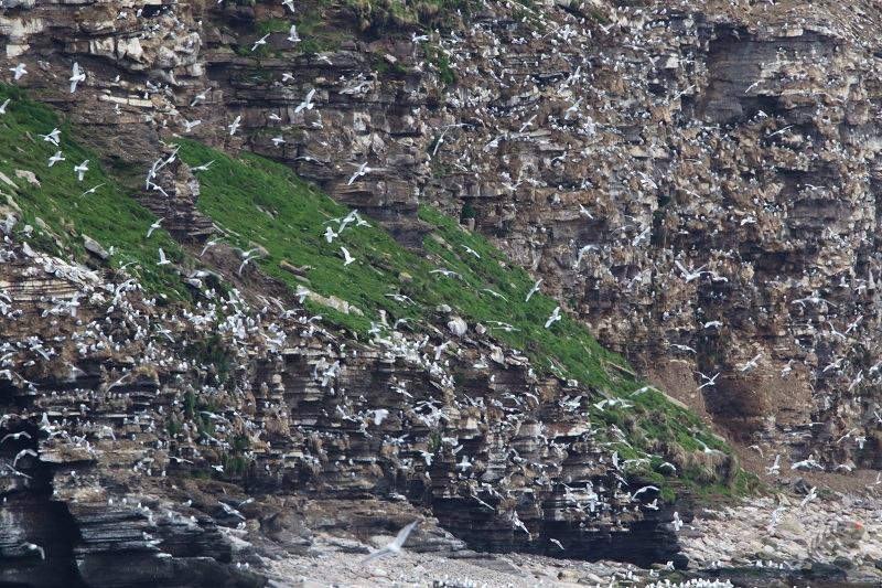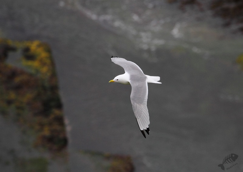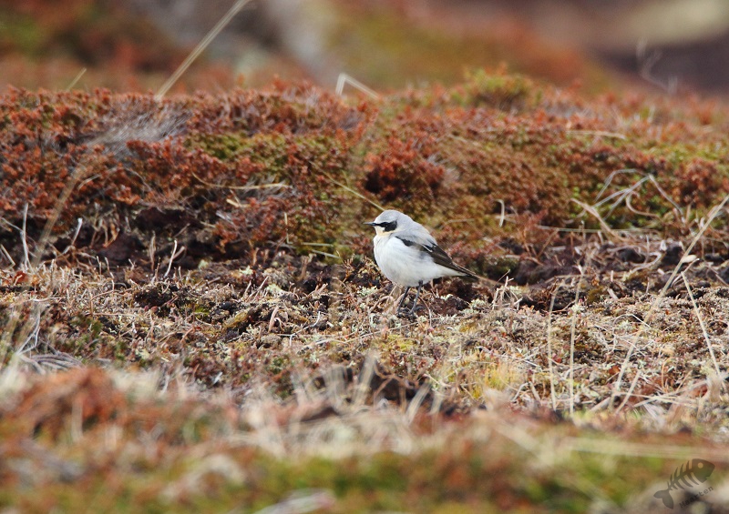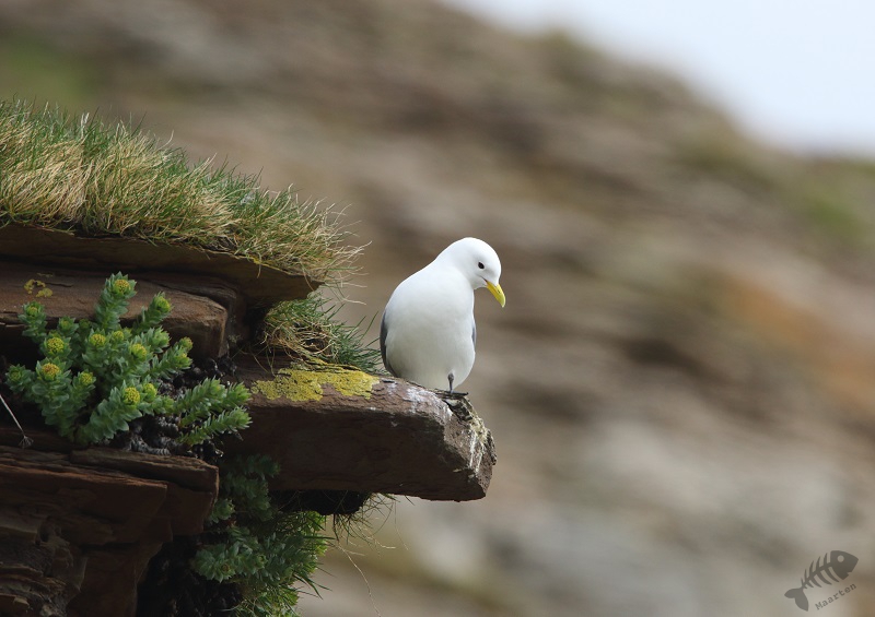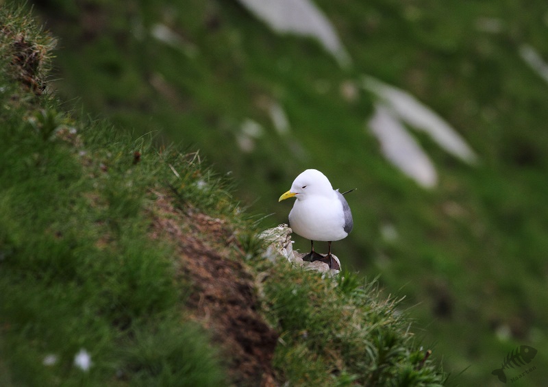 Vanaf Molla had ik een prachtig beeld over de kolonie en de enorme hoeveelheden Drieteenmeeuwen, wat een spektakel! (na terugkeer in Nederland las ik ergens dat het broedsucces van deze kolonie jammerlijk enorm laag was dit jaar…) Voordat ik de “rots/berg” ging beklimmen, werd ik opgehouden door weer een wenssoort. Een tweetal Tapuiten zat redelijk in de buurt en achter elkaar aan en 1 daarvan kon ik heel fraai vastleggen. Ook heb ik me nog even bezig gehouden met Drietenen die niet op de bovenste etages van de kolonie huisden wat, naar mijn idee, weer heel mooie plaatjes opleverde van deze meest geweldige Meeuw. Toen ben ik aan de klim de heuvel op begonnen. Het was pittig, maar wel te doen en eenmaal boven had je een heel mooi uitzicht over het Fjord en Ekkerøy. Ook hier zaten weer Tapuiten en kreeg ik de eerste Raven van deze reis in beeld. Vanaf deze top kreeg ik prachtig zicht op vliegende Drieteenmeeuwen en om deze mooi vast te leggen kan ik best even bezig zijn. Nadat ik het idee had dat het wel enigszins gelukt was, ben ik een aangegeven wandeling gaan lopen welke voerde naar de meest oostelijke punt van het eiland en daarna via het strand van Sandnes (de oostkant van het eiland) weer terug naar het beginpunt aan de westkant. Een rondje dus.