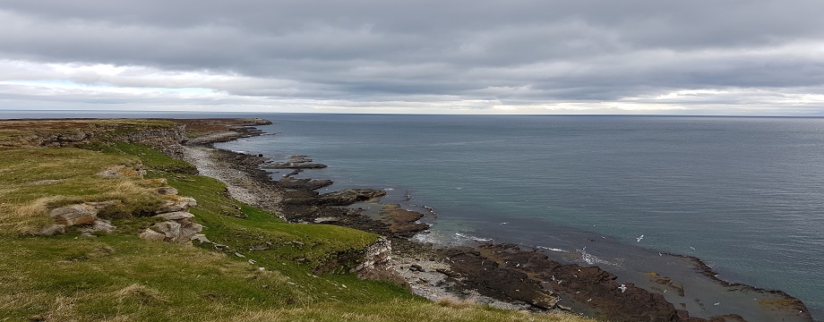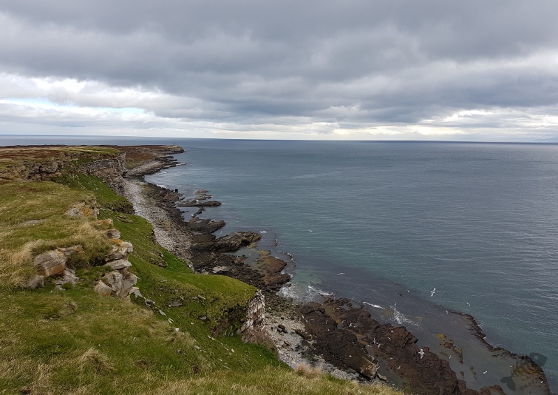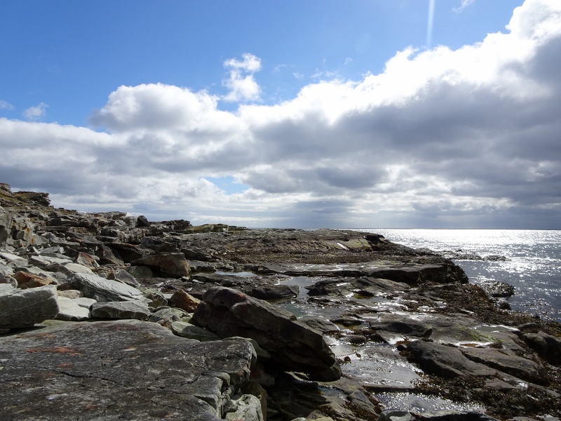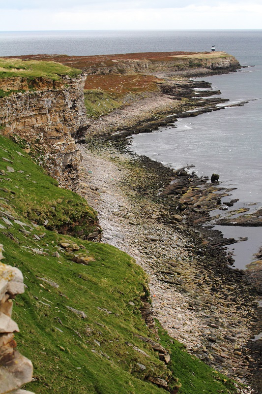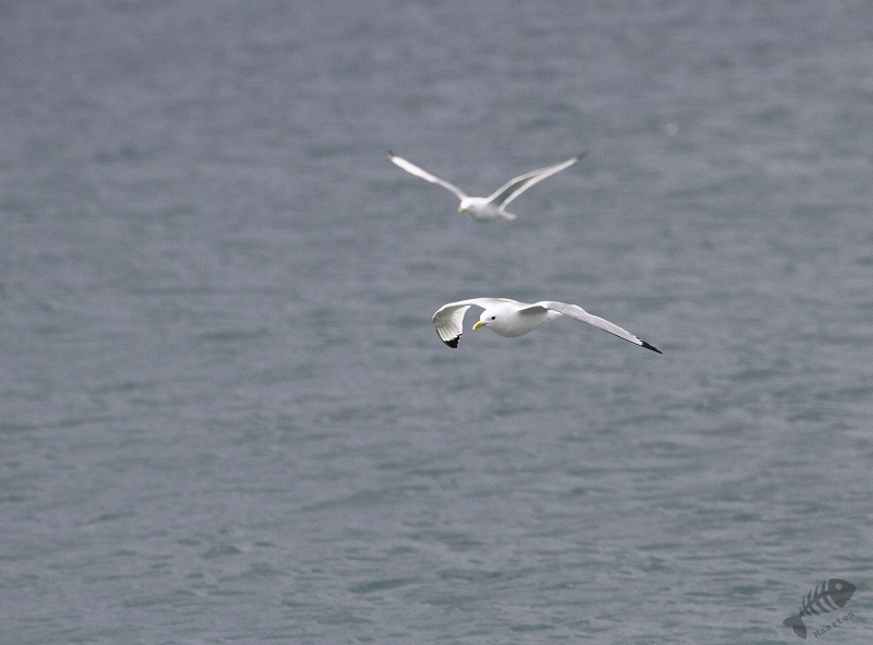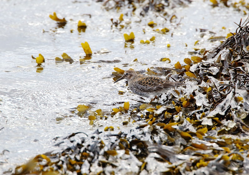 Daarna liep de tocht naar beneden om verder te gaan langs een rotsig “strand”. In het boek van Biotope stond beschreven dat je hier tussen de rotsen ook van allerlei vogels kon treffen, onder andere Strandleeuweriken, dus heel rustig, zeer goed om me heen kijkend ben ik weer verder gegaan. Tot mijn teleurstelling heb ik geen Strandleeuweriken gevonden en in het eerste gedeelte van dit “strand” zag ik eigenlijk helemaal niets. Aan de andere kant vlogen wel regelmatig Drieteenmeeuwen voorbij, maar mijn focus lag nu even ergens anders op en daarom bleef de camera even stil… Het weer werd er ook niet beter op, het waaide de hele dag al erg hard en met vlagen regende het, en dit alles zorgde er voor dat ik het tempo maar wat opgeschroefde tot ik bijna aan het einde van het strand kwam, daar waar de wandeltocht weer van het water wegliep, en ik ineens weer wat strandlopertjes vond. Een Bontbekpleviertje en een Rosse Grutto maken veel goed en zo kon ik het laatste stuk nog redelijk makkelijk afronden.