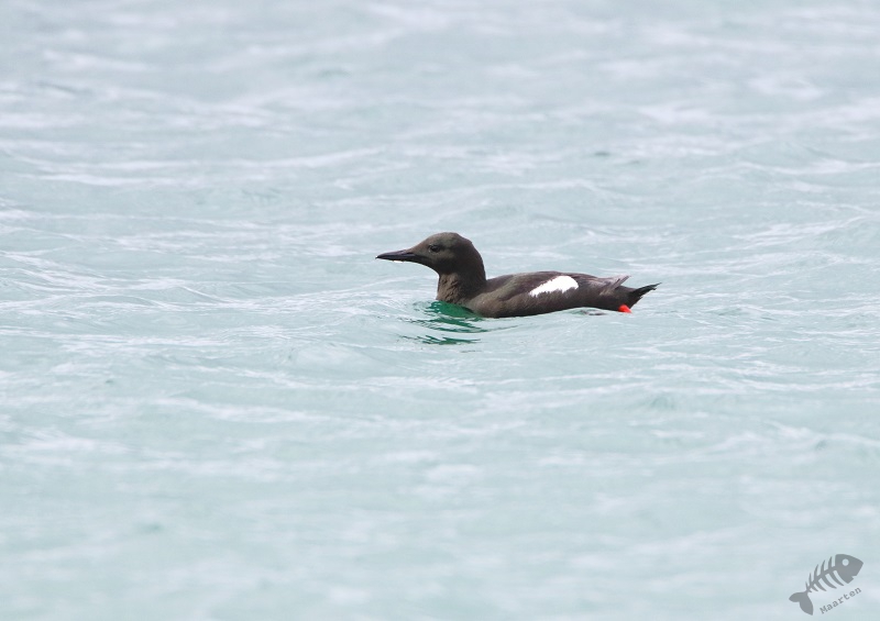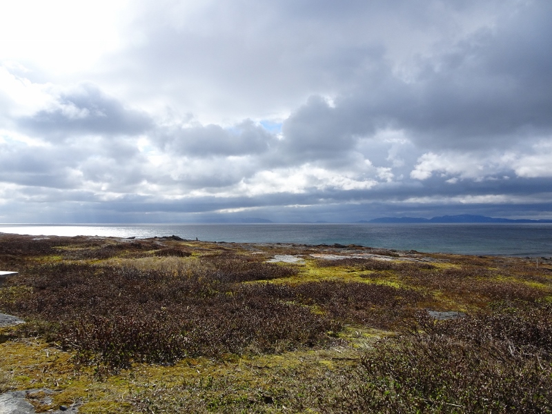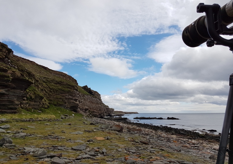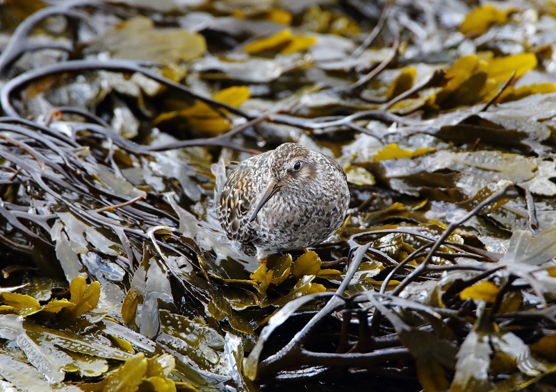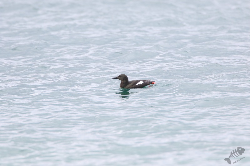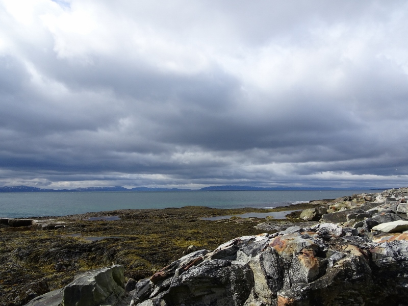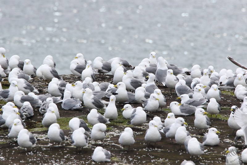 Op Ekkerøy aangekomen, bezocht ik eerst de Shelter van Biotope. Deze kijkt uit over Yttersida, maar er waren daar geen vogels te bekennen. Aan de Innersida daarentegen (aan de westkant van de corridor naar het eigenlijke eiland), vlogen 2 Zeearenden voorbij. Zo was het aantal al verdrievoudigd ten opzichte van mijn vorige bezoek! Ik heb daarna de auto geparkeerd en ben naar de zuidkant van het eiland gelopen, tussen Finnes en Molla, en ben daar langs het water gaan lopen richting de rotsen met de Drieteenmeeuw kolonie. Al snel zag ik één van de die-hards van Varanger: een Paarse Strandloper in zomerkleed. Dit is één van de weinige soorten die op het Schiereiland overwinteren en er dus het hele jaar te zien zijn. Even verderop zag ik er nog een aantal en ben ik er eens even goed voor gaan zitten om ze eens goed te bekijken en te fotograferen. Toen ik weer even uitkeek over het Fjord, zag ik ineens een Zwarte Zeekoet. Deze mooie soort had ik vorig jaar voor het eerst in Vardø gezien, op afstand, en nu zwommen er verschillende voor de kust iets dichterbij. Naarmate ik dichterbij Molla kwam met het uitzicht op de Drietenen, kwamen deze Meeuwen steeds meer in beeld. Ik zag er natuurlijk 10-tallen vliegen, maar ook een enorme club op een grote rots aan het water. Op een bepaald moment vloog een groot gedeelte op en bleek er een Zeearend vlak over te vliegen: Wauw!