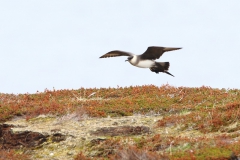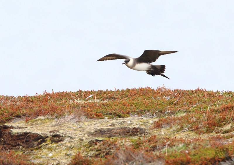 Nadat ik een stukje onderweg was, kreeg ik een volgende wenssoort in beeld. Vanuit de vogelboeken en verslagen van eerdere reizen naar dit gebied, wist ik dat ik de Kleine Jager zou kunnen verwachten. Maar ook de Kleinste Jager, en met heel veel geluk de Middelste, kun je vinden op Varanger. De vogel die ik op Ekkerøy trof was een Kleine Jager en hij was prachtig! Dit is zo’n échte Arctische soort in bescheiden kleurenstelling van met verschillene kleuren bruin, wat crème en wat zwart. Deze jager vloog voorbij, waarbij het me lukte 1 acceptabele foto te maken, waarna hij weer verdween.