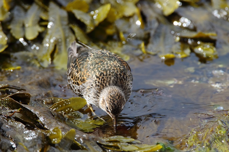 In Vardø vond ik eigenlijk niets en ik ben vrijwel direct weer teruggegaan. Waarschijnlijk op de helft tussen Kramvik en Skallelv liep er een paadje richting het water. Ik ben daar voorzichtig op gereden en zag op grote afstand een enorme “Raft” van Zee-eenden. Dit bleken Zwarte Zee-eenden te zijn en er vloog ook nog een groep Grote Zaagbekken voorbij. Wat een immense rijkdom vind je hier toch! Toen ik weer terug wilde rijden naar de hoofdweg zag ik iets verderop een donkere vogel zitten. Toen ik door mijn kijker keek, zag ik dat het er 2 waren en wel de donkere variant van de Kleine Jager! En terwijl ik bezig was me in allerlei bochten te wringen om ze enigszins in beeld te krijgen, kwam een Goudplevier even kijken wat ik toch allemaal aan het doen was: heerlijk! Het was inmiddels 18 uur geweest en ik moest nog een stuk rijden en zo langzamerhand iets eten, dus ben ik in een rechte lijn weer richting Jakobselv gegaan. Maar ja… Het weer was beduidend beter dan de avond ervoor (al waaide het nog steeds heel hard), ik zou langs Vadsø komen en het zou toch wel heel jammer zijn om onder deze omstandigheden niet een poging te wagen de Grauwe Franjepootjes beter vast te leggen. Dus ben ik in Vadsø weer van de hoofdweg afgegaan en naar Vadsøya gereden en direct naar het meertje gelopen. Maar het meertje was leeg! Toen ik iets beter keek zag ik wel een koppel Wilde Zwanen (prachtig!), maar geen Franjepootjes. Ik begreep het niet en was al bang dat ik voor niets deze de-tour had gemaakt. Op de weg terug naar de auto heb ik het water tussen Vadsø en Vadsøya nog even gescand en daar zag ik ze ineens, aan de oever! een hele groep Grauwe Franjepoten die tussen het wier aan het foerageren was. Omdat ik niet zeker wist of ik wel dichterbij mocht/kon komen, heb ik eerst wat foto’s van grote afstand (en hoogte) gemaakt. Toen ik verschillende wandelaars over het strand zag lopen, bedacht ik dat ik dat vast ook zou mogen en ben afgedaald naar het strand en steeds een beetje dichter naar het groepjes vogels gelopen. Zo stuitte ik ook nog op Bontbekpleviertjes en een Bonte Strandloper en een groep rustende Zaagbekken vermengd met Eiders. Om deze niet te storen in hun rust ben ik gestopt en ben ik van een redelijke afstand me gaan focussen op de Grauwe Franjepoten. En ondanks de wat grotere afstand dan gisteren, ben ik toch weer heel blij met de resultaten van deze prachtige vogels!