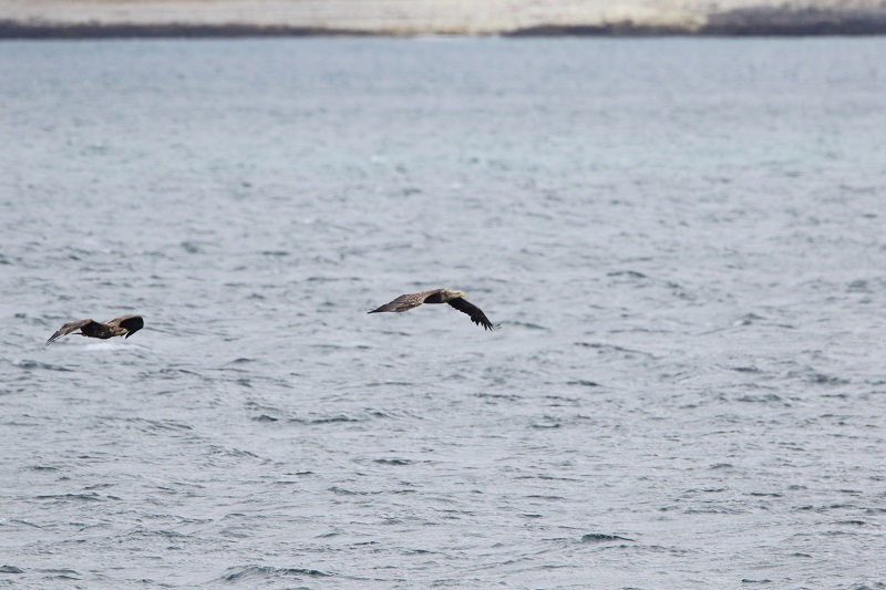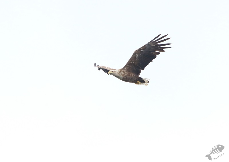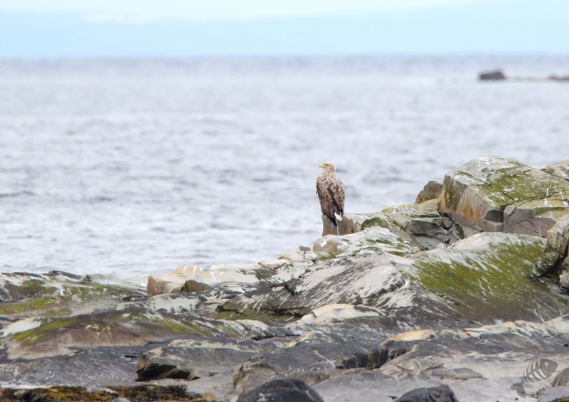 Ik was wat moe aan de reis begonnen en de korte nacht in Oslo en de lange eerste dag op het Schiereiland hadden dat niet per se beter gemaakt. Zodoende ben ik eigenlijk veel te laat opgestaan en pas nadat ik m’n lunch klaar had kon ik op weg en kreeg ik pas iets voor 9 uur de eerste mogelijkheid om foto’s te maken. Maar goed, dat was wel weer van een wenssoort… Tijdens mijn vorige verblijf hadden Siren en Jan-Eilif al verteld dat zij soms naar hun huis in Vadsø reden, of naar hun buitenhuis bij Skallelv, en onderweg misschien wel een tiental Zeearenden zagen. Ik had er toen in totaal 1 gezien boven Hornøya, wat toch niet helemaal hetzelfde is… Maar deze dag keerde het tij en werd mijn eerste foto er ééntje van een prachtige Zeearend langs de kust! Een échte noorderling is de Bonte Kraai en ook deze verscheen even in beeld terwijl ik met de Zeearend bezig was. Zo had ik al 2 leuke soorten aan het begin van de dag.