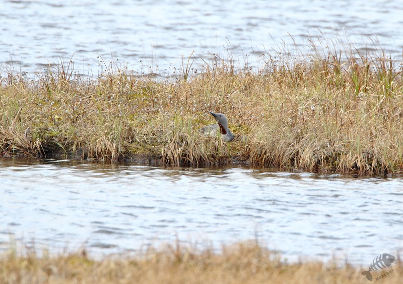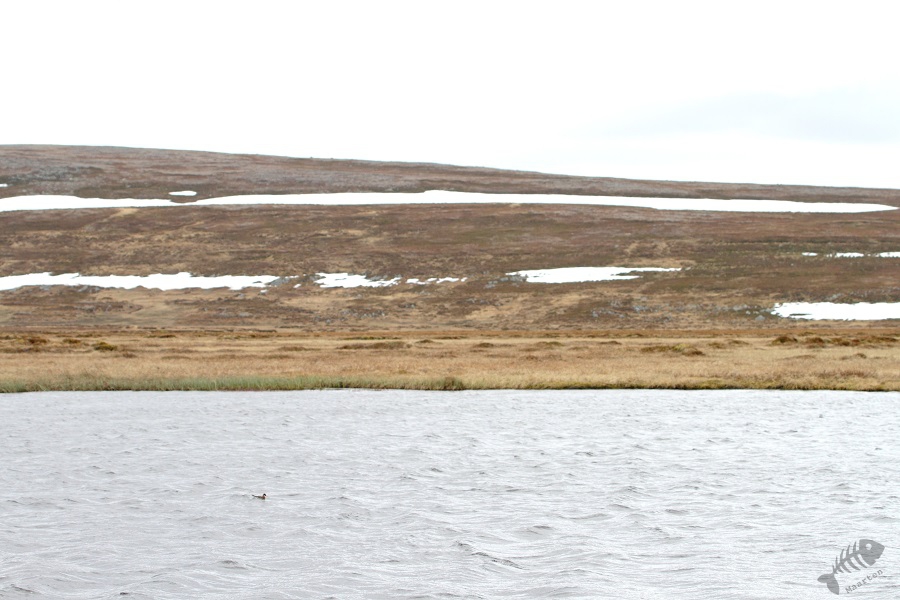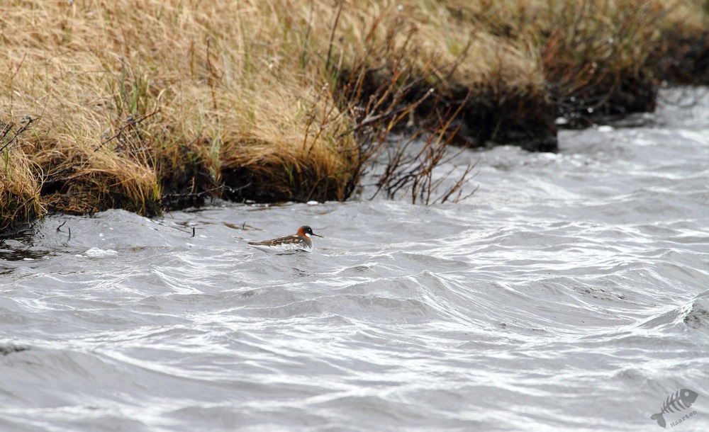 Ik ben weer half wadend richting de de hut geploeterd, onderwijl nog een blurry foto van een Bonte Strandloper gemaakt, en kwam iets anders uit dan ik waar ik op de heenweg gestart was. De luid blatende Watersnip hielp misschien niet om koers te houden, maar ook de opgewonden geluiden uit weer een ander meertje deden dat zeker niet. Op dit watertje bleek een koppeltje Grauwe Franjepoten te zitten en daar kun je er eigenlijk geen genoeg van zien! Ik ben een beetje aan de rand van het water gaan zitten en kreeg zo de kans om nog net weer wat mooiere plaatjes te maken dan op Vardøya. Eén van de Kemphanen van het begin leek me te zijn achtervolgd en streek neer naast het meertje. Ook kreeg ik nog een Kleine Jager in m’n zoeker, maar het mooist vond ik m’n vondst van een Roodkeelduiker, waarschijnlijk broedend. Het was bij weer een ander watertje en op grote afstand. Het dier zat op een soort eilandje aan de rand van het water en was zelfs redelijk verscholen. Deze vogel wilde ik zeker niet verstoren en ik ben op afstand gebleven en heb zelfs zo nog heel aardige foto kunnen maken. En zo leek allemaal goed te komen! Het werd wel zo’n beetje tijd om verder te gaan en ben ik het heuveltje weer opgeklommen. Het zicht op de broedende vogel bleek van hier zelfs nog iets beter en zo heb ik hier de laatste foto’s van gemaakt voordat ik weer verder ben gegaan. Toen ik nog even bij de hut ging kijken bleek dat het niet helemaal goed was wat ik gedaan had: in deze tijd van het jaar mag je het gebied niet betreden en alleen vanaf de hut observeren… Oeps… Toch had ik niet het idee dat ik veel vogels verontrust had en zo kon ik gerust mijn trip van deze dag vervolgen.