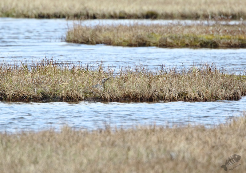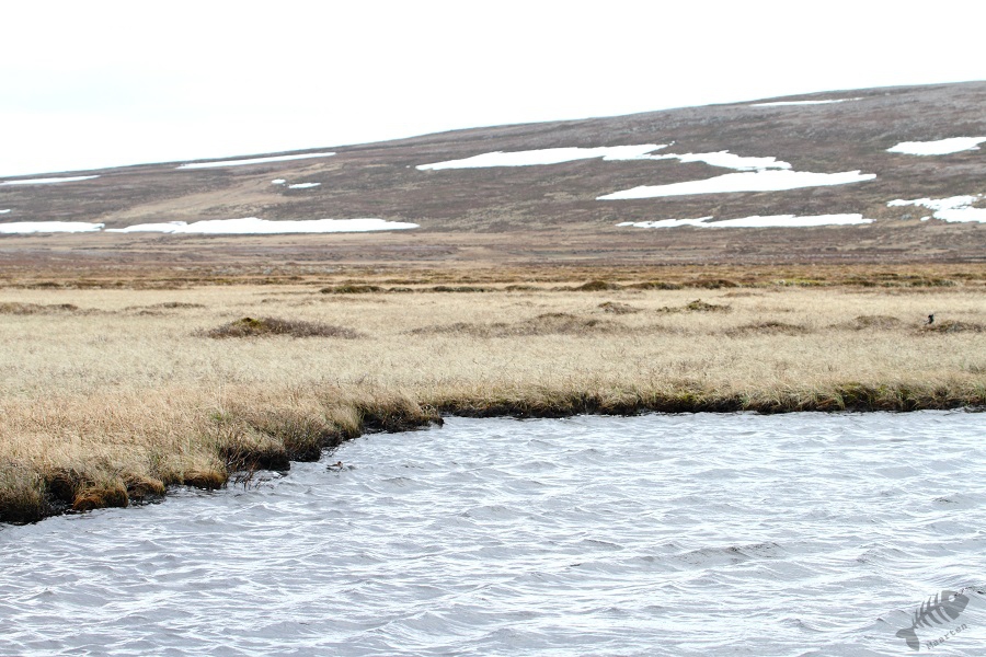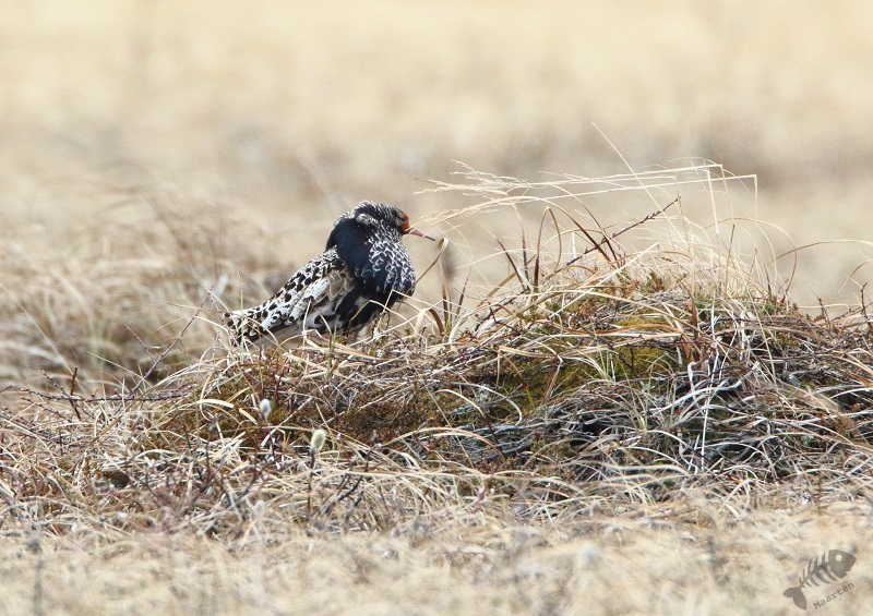 Toen ik na ruim een uur aankwam bij de splitsing richting Vardø óf de Fv341 ben ik voor het eerst, linksaf, deze weg opgereden om al vrij snel een afslag te nemen naar Smelror. In het boek stond beschreven dat in de velden in dit gebied verschillende interessante soorten te zien zouden zijn, zoals de Temmincks Strandloper of de Watersnip. Geen van deze 2 liet zich zien, maar de dag startte zo’n beetje als gisteren met een Zeearend aan het water. Gisteren pakte dat lekker uit, dus wie wat wat het nu zou brengen… Ik heb ook nog wat foto’s gemaakt van Vardø van deze kant, want zo had ik het eiland nog niet eerder gezien. Ik ben daarna de weg weer opgegaan om naar mijn eerste échte stop te gaan: Barvika. Dit is een drassig gebied, bestaand uit Barvikmyra en Grøhøgdmyra (myra betekent moeras) en is omringd door heuvels. Ook hier staat een shelter van Biotope, de Barvika Gapahuk. Na aankomst heb ik eerst het gebied overkeken vanaf de hoogte waar de hut staat. Er lagen wat meertjes verspreid en van grote afstand kon ik zien dat op 1 van die meertjes een Roodkeelduiker zwom! Weer een soort waarop ik gehoopt had voor deze reis (en ook aangegeven was in het boek voor deze plek…). Het was alleen op een te grote afstand en foto’s maken was uitgesloten. Toen ik het gebied verder bekeek, vond ik een soort van mogelijkheid bij het meertje te komen. In al mijn naïviteit dacht ik door het open terrein te kunnen lopen zonder iets te verontrusten of te verjagen. (Sub)Arctische dieren zijn ten slotte geen mensen gewend en daarom helemaal niet schuchter… Ik ben de heuvel afgedaald en ben richting het meertje gelopen, tot ik ineens een groepje vogels op de rand van een plateau zag. Het bleek een club mannelijke Kemphanen te zijn die nog zeer fraai waren uitgedost. Er zaten zeker 4 verschillend gekleurde heren bij en ik kreeg de gelegenheid ze uitgebreid te portretteren. Nadat ik ze allemaal vastgelegd had, ben ik eerst weer stukje teruggegaan om ze niet te verstoren en daarna weer richting het inmiddels bekende meertje. Toen ik een stukje het gebied ingelopen was, begreep ik heel goed waarom het het achtervoegsel “myra” heeft. Behoorlijk stukken zakte ik tot halverwege m’n knieën in het water waarna ik probeerde van het ene wat hoger gelegen stukje op het andere te springen, wat mijn onopvallende nadering niet helemaal ten goede kwam…