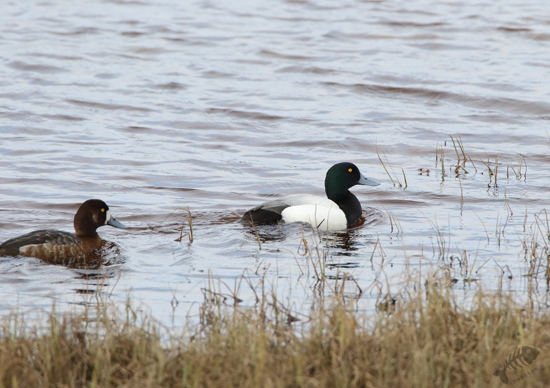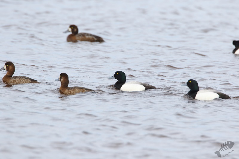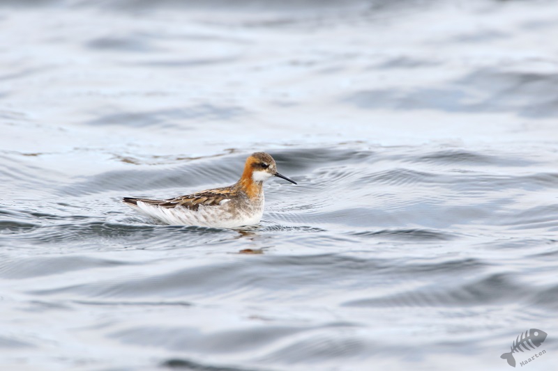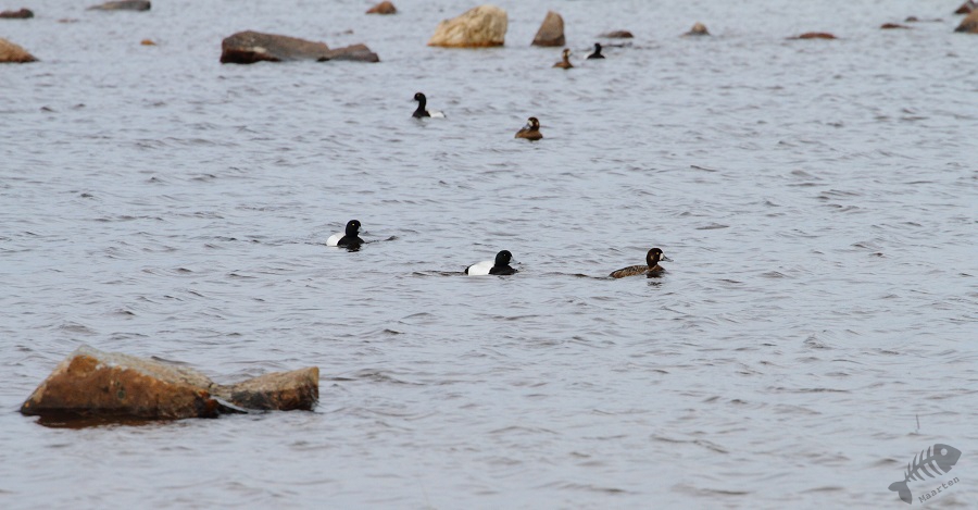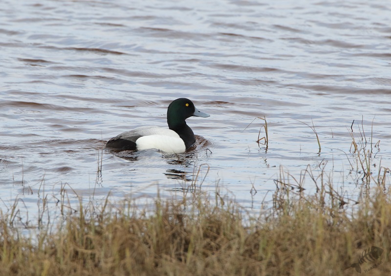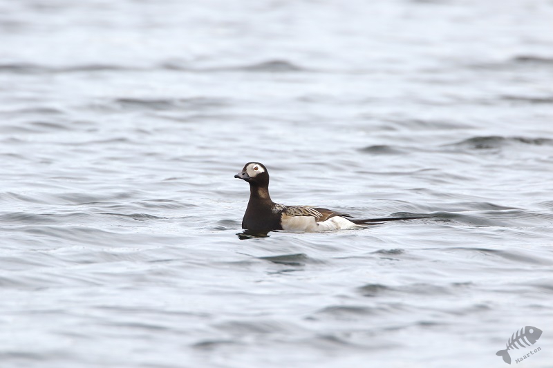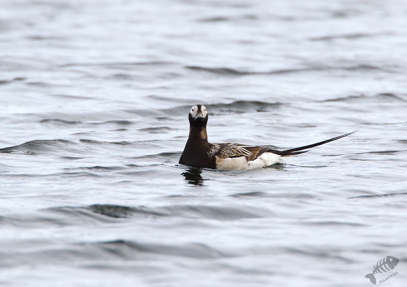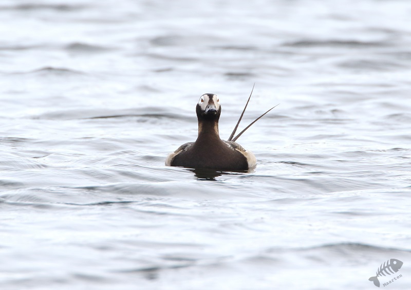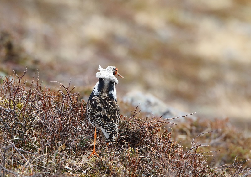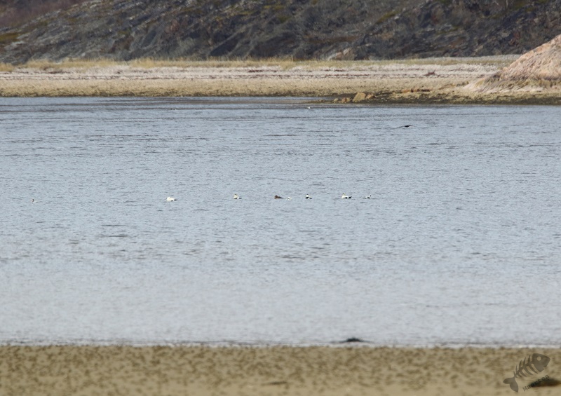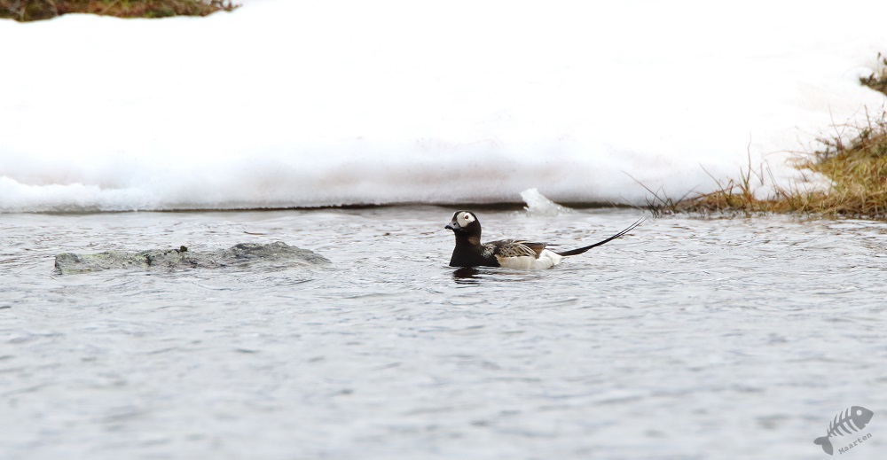 Na een kleine 10 minuten zag ik Gednje al liggen. Ik had het idee met piepende banden linksaf te stuiven en rechtstreeks door te rijden naar Kongsfjord, maar dat liep een beetje anders… Net voor de splitsing lag aan de rechterkant van de weg een meertje waar ik een Eend op zag zwemmen. Ik ben langs de weg gestopt, uitgestapt en heb m’n spullen opgesteld om te kijken of ik hem er mooi op zou kunnen krijgen. Toen ik net zat, vloog er ineens een Kemphaan voorbij en landde niet ver van me. Dus snel eerst een foto van deze prachtige man gemaakt en toen alles gericht op de Eend. Het bleek een IJseend te zijn en hij zat aan de overkant van het water. Het meertje was niet groot, maar eigenlijk wel nét te groot voor mooi. Toen hij ook nog op de kant ging zitten, dacht ik dat m’n kansen wel bekeken waren. Gelukkig werd m’n aandacht gevangen door een koppeltje Grauwe Franjepootjes die eigenlijk vlak voor me langs kwamen zwemmen. Toen zij weer uit beeld waren verdwenen, bleek de IJseend van de kant te zijn gekomen en meer naar het midden van het water aan het zwemmen te zijn. Terwijl hij zo rondzwom, begon hij baltsgeluiden en bewegingen te maken.
