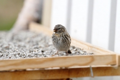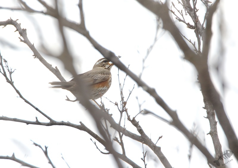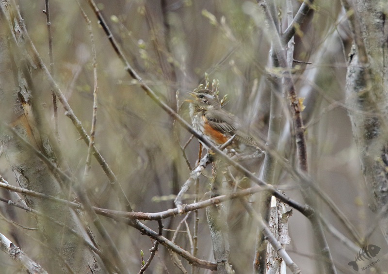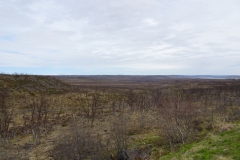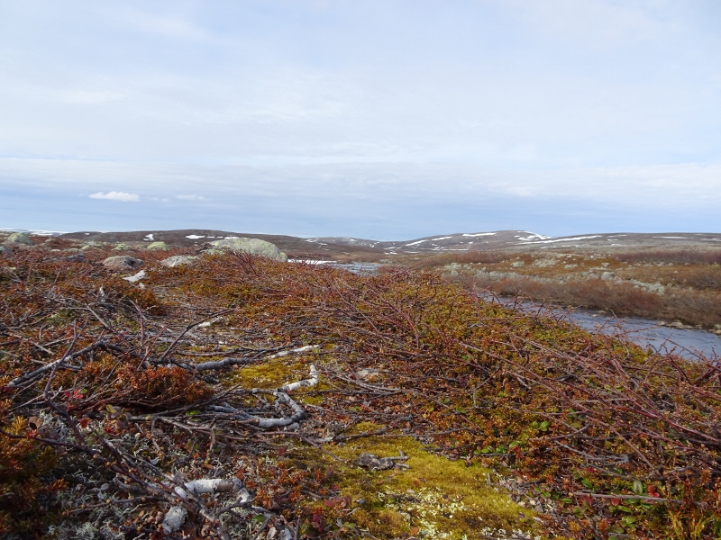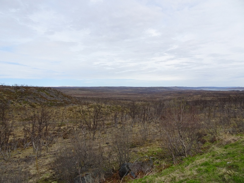 Ik had weer een erg slow-start en heb (te) lang met Siren zitten praten terwijl ik foto’s bij de birdfeeder aan het maken was. Zodoende vertrok ik pas om iets over 10en en was mijn eerste stop na ongeveer 2 km. Aan de Vestre Jakobselv staat ook een Biotope schuilhut en omdat ik nu eens deze kant opreed, leek me dat een goede reden om er te gaan kijken naar de rivier. Vogels zaten er helaas niet zo veel. Volgens het boek zou er op de zandbanken best het één en ander kunnen rondscharrelen, maar nu leek dit niet het geval. Gezien mijn late start misschien ook niet zo erg, dus ben ik weer snel verder gegaan richting Varangerbotn. Op de rotonde hier, kun je naar het zuiden, weer richting Kirkenes, naar het westen, Tana Bru and beyond, of naar het pompstation… Mijn richting was rechtdoor naar het westen, naar Tana Bru, en zo reed ik het onbekende tegemoet toen ik de rotonde voorbij was. Niet eens heel ver buiten Varangerbotn veranderde het landschap enorm. Het was uitgestrekt met lage, knokige Berken en flauwe heuvels. De lente leek nog niet heel erg begonnen, wat het weer van de eerste 2 dagen al deed vermoeden, maar ook aan de kleuren van dit gebied kon je het wel zien. Een film in 50 tinten bruin zou hier met gemak opgenomen kunnen worden… Toen ik stopte om te proberen het landschap zo goed mogelijk vast te leggen, werd ik weer erg afgeleid door de zang van een Blauwborst. Natuurlijk zag ik hem niet, net als de eerste dag, maar ik kon wel weer even van zijn zang genieten. En als altijd hoorde ik er zachtjes de Fitisjes doorheen.