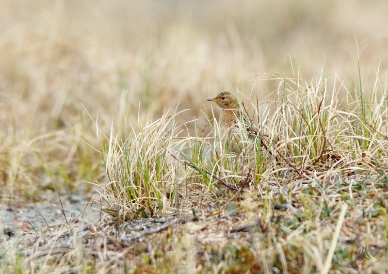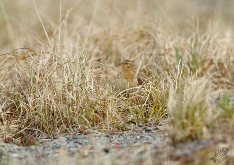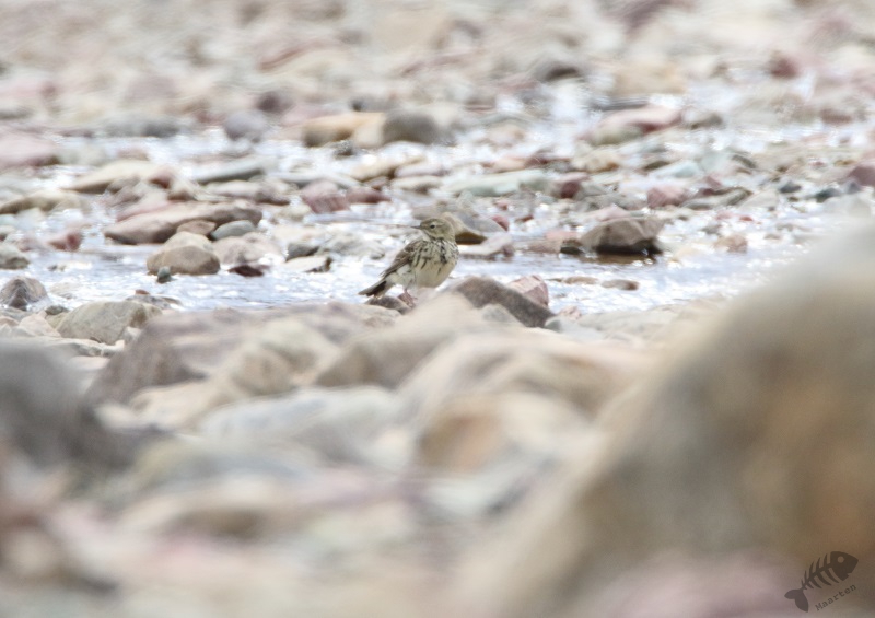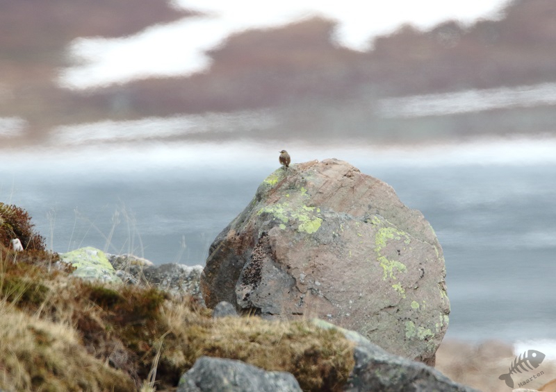 Er waren geen bomen, alleen gras, een soort mos en lage kruipwilgen. Maar natuurlijk waren er ook vogels in deze vijandige omgeving. Als eerste hoorde ik boven me een melancholische roep waarvan ik ook al niet kon bedenken wat het zou kunnen zijn. Gelukkig, anders kan zoiets behoorlijk gaan frustreren, vond ik de maker van het geluid hoog in de lucht en bleek het een Goudplevier te zijn. Het geluid paste helemaal in het landschap en maakte het daarmee een heel eind af. Terwijl ik zo omhoog aan het staren was, vloog er ook nog een Kleine Jager voorbij. Deze maakte het plaatje wel zo’n beetje compleet. Aan de oever van het meer zag ik ook een vogeltje scharrelen wat mij een Oeverpieper leek, maar zoals ik al eerder ergens geschreven heb: Piepers zijn lastig uit elkaar te houden… Of toch…: in de buurt van de plek waar ik bezig was de Pieper te fotograferen, zag ik in mijn ooghoek iets bewegen. Toen ik mijn camera erop richtte, zag ik wel direct wat het was: een Roodkeelpieper! Deze is niet heel moeilijk te onderscheiden, dus dat durfde ik meteen hardop uit te roepen en dat ik daarmee weer een nieuwe soort had. Een oude getrouwe (al heb ik ze in Nederland maar nauwelijks redelijk vast kunnen leggen) zat er ook. In de buurt, maar op afstand blijvend, vloog een Tapuit rond. Niet de eerste die ik hier verwachtte. Ik zag ook nog een Jager die er anders uitzag dan de eerste die ik zag. Volgens mij was dit de Kleinste Jager en als klopt kon ik op deze plek nummer 2 nieuw bijschrijven! Toen er een camper verscheen met een wat overenthousiaste fotograaf die maar niet leek te begrijpen dat als je een vogel wil vastleggen, je er niet achteraan moet sluipen; ze zien je toch wel en gaan er vandoor… Zo ook de Tapuit en Roodkeelpieper. Voor mij waren de mogelijkheden daarmee ook verdwenen en ik ben weer verder gegaan.