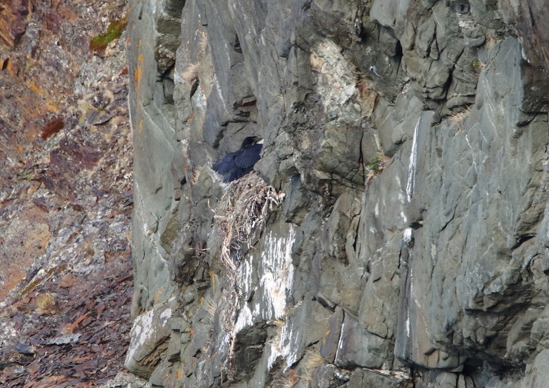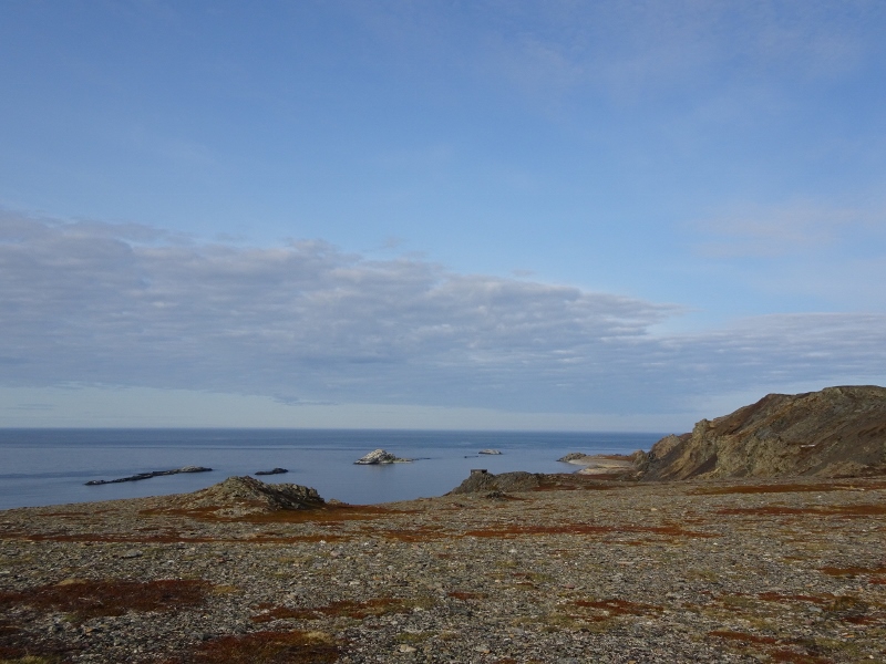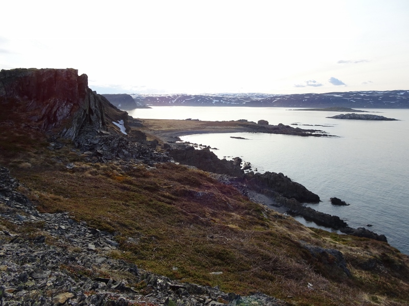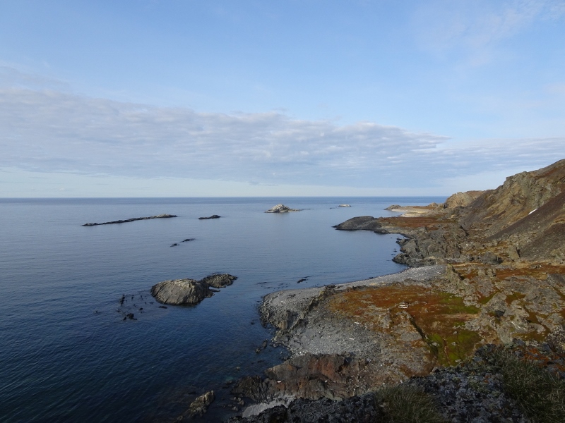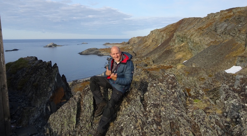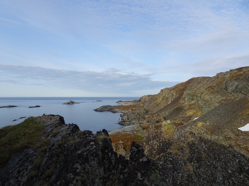 Omdat ik nog wat tijd had voor het diner, ben ik weer op stap gegaan. Eerst heb ik me even vermaakt met enkele vogels op een oude pier. Hierop zaten Visdiefjes (eerst dacht ik weer aan Noordse Sternen…) en Zwarte Zeekoeten, altijd leuk. Daarna ben ik een heuvel opgelopen met 2 doelen: op de eerste plaats zou deze omgeving een Giervalk bolwerk zijn en deze zouden vanuit mijn 2de doel, weer een Biotope Shelter, spectaculair gelegen overhangend op een klif, te zien moeten zijn. Het was best warm en de klim stevig, zeker met alle spullen die mee omhoog moesten. De schuilhut heb ik gevonden, de Giervalk helaas niet. Het uitzicht over de Barentszzee was wel adembenemend en ik heb er een hele tijd staan genieten. Op wat kleine eilandjes tegenover de hut zat een kolonie Aalscholvers die op een bepaald moment lastiggevallen werd door een Zeearend. Verder heb ik me nog kunnen vermaken met een groepje Raven die waarschijnlijk in een gat in de rots aan het broeden waren, of wilden broeden. Na ongeveer een uur ben ik weer teruggelopen naar m’n Gjestehus. Ik had nog heel even tijd om bij de Visdieven en Koeten te kijken, maar daarna was het mooi geweest en kon ik aan tafel. Ik heb heerlijk rendierstoofschotel met spruitjes gegeten en kreeg tijdens het eten gezelschap van een oudere dame die in haar ééntje vanuit zuid Noorwegen naar hier was gekomen met de auto, omdat ze vond dat ze dat een keer gedaan moest hebben. Ze zou vanuit Varanger weer met de Hurtigruten naar het zuiden varen. Het was een gezellig diner, maar aangezien ik de volgende dag vroeg op moest (4 uur), heb ik het maar niet te laat gemaakt.