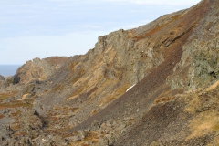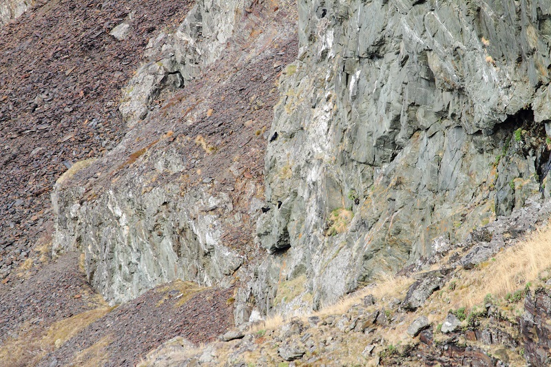 Het landschap veranderde dus en werd steeds mooier. Besneeuwde heuveltoppen in de verte tegen een nagenoeg blauwe lucht… Op een punt waar er iets ruimte was tussen de weg en de naastgelegen rotsen, ben ik even gestopt om foto’s te maken. Er stond ook een busje met vermoedelijk Spaanse vogelaars, en ik hoorde iemand zeggen dat ze moesten opletten of ze de de Ring Ouzel konden horen. En dat was ook zo: er zouden in deze rotsen Beflijsters kunnen zitten. We hoorden er geen, maar toen zij weer vertrokken waren was het overweldigend stil… Wat een heerlijk geluid! Een paartje Raven verstoorde de rust, maar dat vond ik geen probleem. Alles beter dan de geluiden die wij mensen maken… De rest van de rit was wisselend en omdat ik even niet oplette, of het eigenlijk nog niet verwachtte, reed ik enthousiast de afslag voorbij naar Høyholmen. Pas na enkele kilometers kreeg ik de gelegenheid te draaien en ben ik rustig teruggereden om er niet weer voorbij te rijden.
