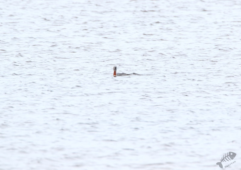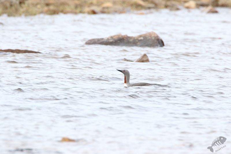 Wat ontzettend gaaf! Het geluid was echt zo’n geluid wat je in de Arctische gebieden verwacht en bij het maken van het geluid gooide hij zijn kop op zijn rug en dat een aantal keer achter elkaar. Hij zwom ook steeds dichterbij en daardoor kon ik hem eens echt goed bekijken. Ik vond ze in de winter al mooi, maar, zoals ik ook al bij Barvika had gezien, in deze tijd zijn ze minstens even prachtig. Toen ik dacht dat het maar genoeg moest zijn en ik weer verder moest, ben ik zeker weer zo’n 50 meter opgeschoten. Direct na de splitsing lag ook weer een meertje aan de rechterkant van de weg en hier zwommen verschillende vogels rond. Om te beginnen een hele groep Toppers. Ook zij zaten nu een stuk dichterbij dan in Barvika en ook deze mooie Eendjes kon ik nu dus een stuk beter bekijken. En toen we dan toch met dezelfde vogels bezig waren als in Barvika… Er zwom ook een Roodkeelduiker rond. In eerste instantie zat hij ver weg en zwom hij naar links weg en kreeg ik hem nauwelijks mooier in beeld. Dit meertje bleek, achteraf op de kaart, een verbreding van een riviertje te zijn die in het Geatnjajávri meer ontspringt. Misschien dat daarom de Duiker niet helemaal verdween, want op een bepaald moment zwom hij weer terug naar het meertje en ontdekte ik een beetje een patroon in zijn duiken. Toen hij weer onderging, ben ik een stuk lager op de oever gaan zitten, op het punt waarvan ik dacht (en hoopte) dat de Duiker daar weer boven zou komen. En het werkte! Hij kwam behoorlijk dichtbij en zo kreeg ik eindelijk ook van deze prachtvogel m’n gedroomde plaatjes. De rode keel is misschien mooi maar de tekening in zwart/wit, bijvoorbeeld in zijn nek, zijn helemaal schitterend. En dan dat grijs… Na een tijdje kreeg ik ineens weer het besef dat ik nog verder moest en ben, met pijn in m’n hart, weer doorgereden. Gednje was niet per se de mooiste plek, maar de vogels die er zaten…