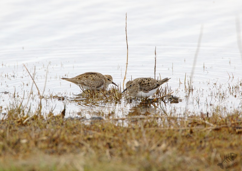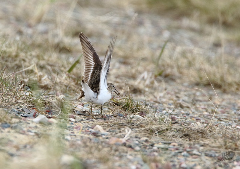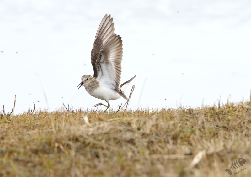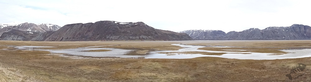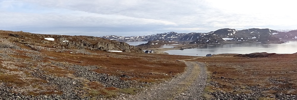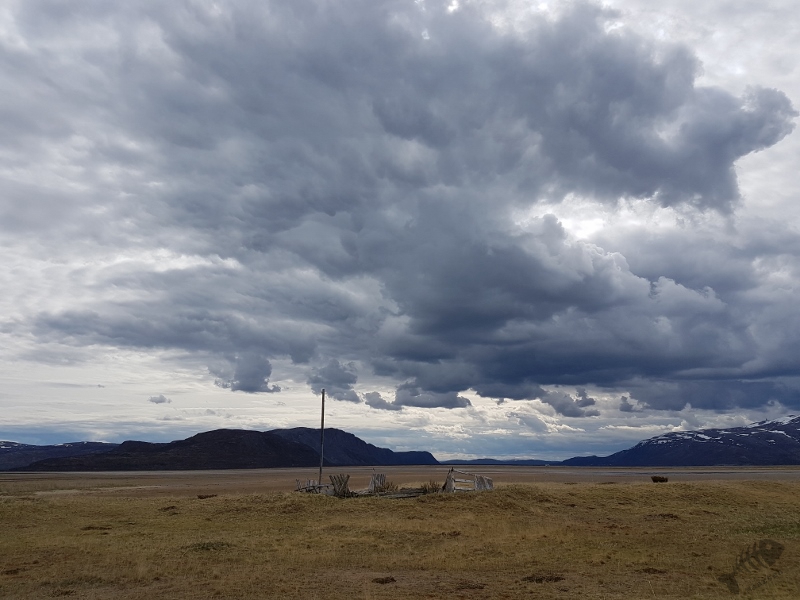 Høyholmen is eilandje in de Tanadelta en kun je bereiken door een soort van corridor van zo’n 1,5 km waar aan 2 kanten moeras ligt. In deze moerassen kun je verschillende steltlopertjes verwachten en allerlei andere vogels en in in het water bij Høyholmen zelf kunnen Zeehonden en onder andere Zaagbekken zitten. Het eerste stuk van de weg leek een beetje op een verdort grasland, maar het uitzicht verderop was fantastisch! Ik keek uit over een vlakte omringt door besneeuwde bergen met het water van de Tanadelta in de verte. Halverwege de weg ben ik gestopt om in eerste instantie naar de stilte te luisteren. Maar al snel werd die stilte doorbroken door een nogal opgewonden geluid als van een Krekel aan een PartyPil. Maar ik had gelezen over de vogels die dit geluid in deze contreien maken en ik zag al snel een, hevig met z’n vleugels wapperende, Temmincks Strandloper. Er zaten 2 vogels niet ver van me vandaan en 1 daarvan probeerde enorm indruk te maken op de ander. Ik heb niet gezien of het enig effect had, maar voor de moeite zou hij beloond moeten worden. Ik heb niet heel veel andere vogels kunnen ontdekken, en ik geloof zelfs dat ik de Bontbekjes niet gefotografeerd heb omdat ik te druk ben geweest met de Temmincks Strandlopertjes. Maar ja: dat was wel weer een nieuwe soort in een prachtig habitat. Aan het eind van de weg, vanwaar je een mooi uitzicht over het water hebt, was een soort picknick plek en heb ik wat gegeten. Er leken geen Zeehonden te zitten en de enige vogels op het water waren enkele Eiders héél in de verte. Het was inmiddels een eindje in de middag en ik moest nog een heel stuk naar Kongsfjord, dus ben ik weer verder gegaan, nadat ik nog een paar plaatjes van de omgeving had gemaakt.