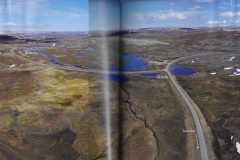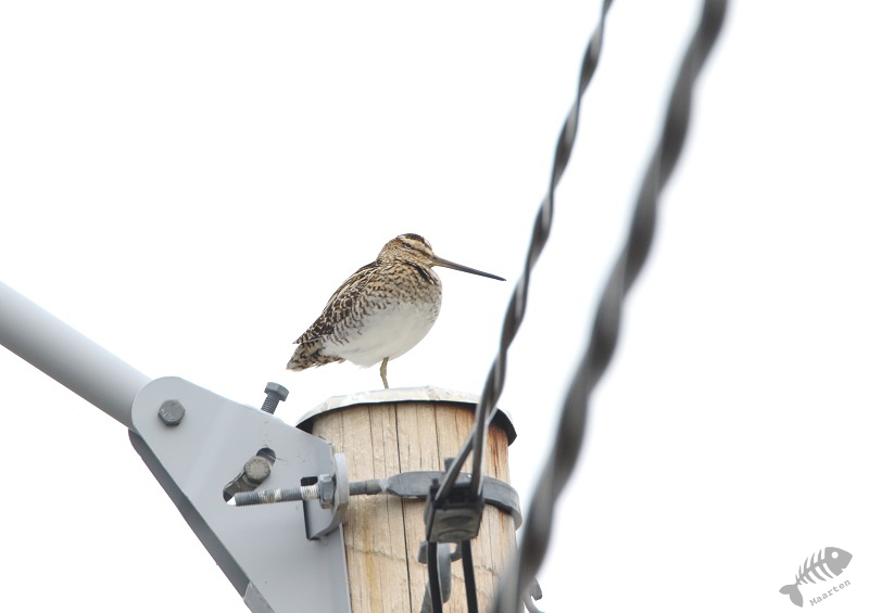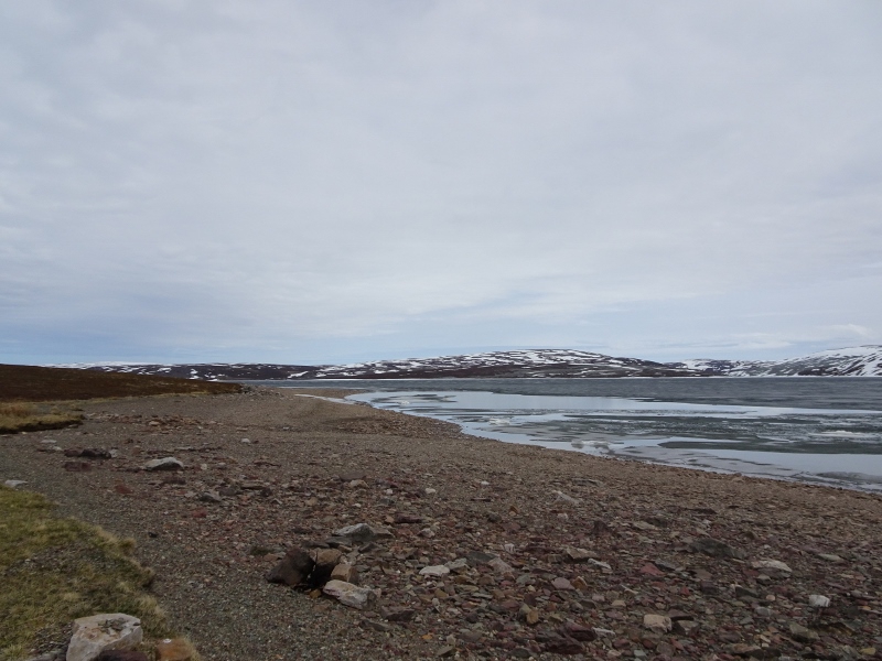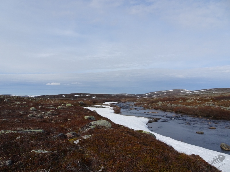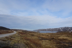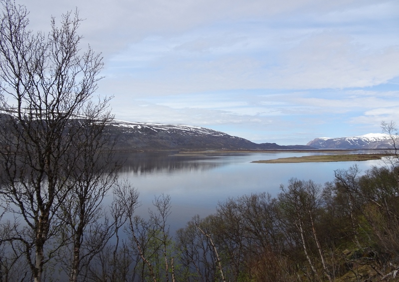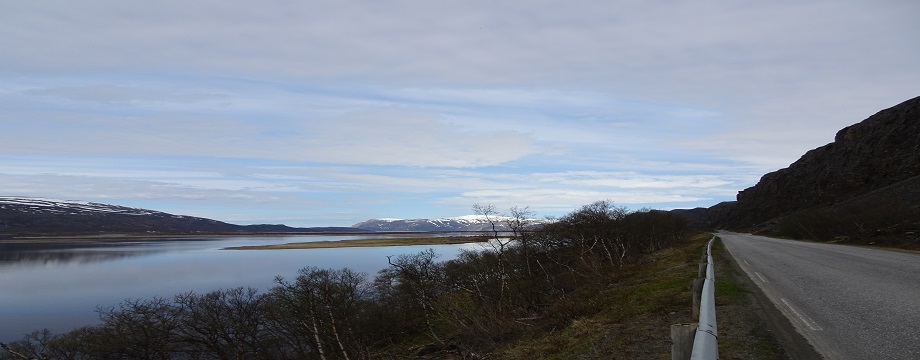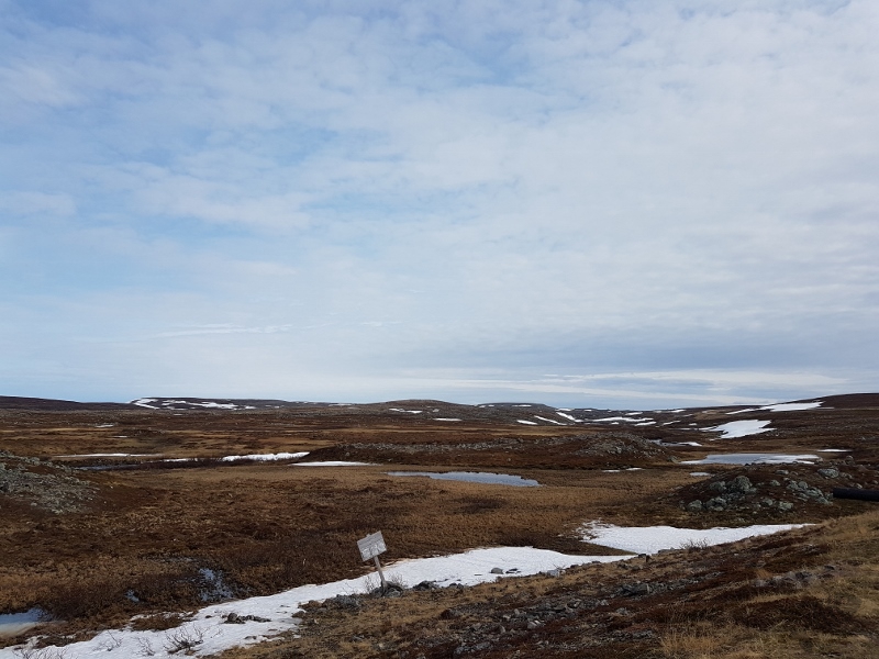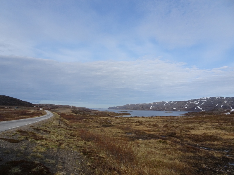 Van Høyholmen reed ik richting Austertana waar de omgeving weer wat agrarischer werd, tussen de heuvels en lage bosjes. Er stonden ook weer elektriciteitspalen, dus ik moest weer opletten, en op een bepaald moment, stopte heel even m’n adem. Op zo’n mast zat een vogel, dus ik meteen op de rem en met de verrekijker bekeken. Hij had een wat lange snavel voor een Sperweruil en ook de kleuren klopte niet helemaal, wat dus ook wel klopte omdat het een Watersnip was. Natuurlijk heel leuk om te zien, zeker in weer eens een andere omgeving, maar toch… Vlak bij de Snip zat een Koperwiek voluit te zingen. Het duurde even voor ik hem in beeld kreeg (ze zitten, zoals ik tijdens deze trip heb gemerkt, vaak verscholen te zingen, in tegenstelling tot hun zuidelijke familieleden als Merel en Zanglijster), maar het lukte en ik heb zelfs een filmpje gemaakt waarin de zang écht duidelijk te horen is. Toen toch bleek dat het niet beter zou worden dan dit, ben ik weer verder gegaan en na ongeveer 5 km klom de weg omhoog en veranderde het landschap weer. De bomen verdwenen en al vrij snel liep de weg over de grens van de kale hoogvlakte. Aan de overkant van een soort brug over een meer, het Geatnjajávri, was een parkeerplaats en ik ben er gestopt om deze nieuwe omgeving eens rustig te bekijken en bewonderen. Het meer was nog grotendeels bevroren en ook hier lag nog veel sneeuw op de omringende heuvels.