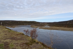 Toen ik er weer zo’n 5 km op had zitten, zag ik een mooie plek om de auto neer te zetten en eens een stukje te gaan lopen. Het bleek een plek voor vissers te zijn en ik kon er bij de rivier, de Getnjejohka, komen die ik sinds Gednje aan het volgen was.