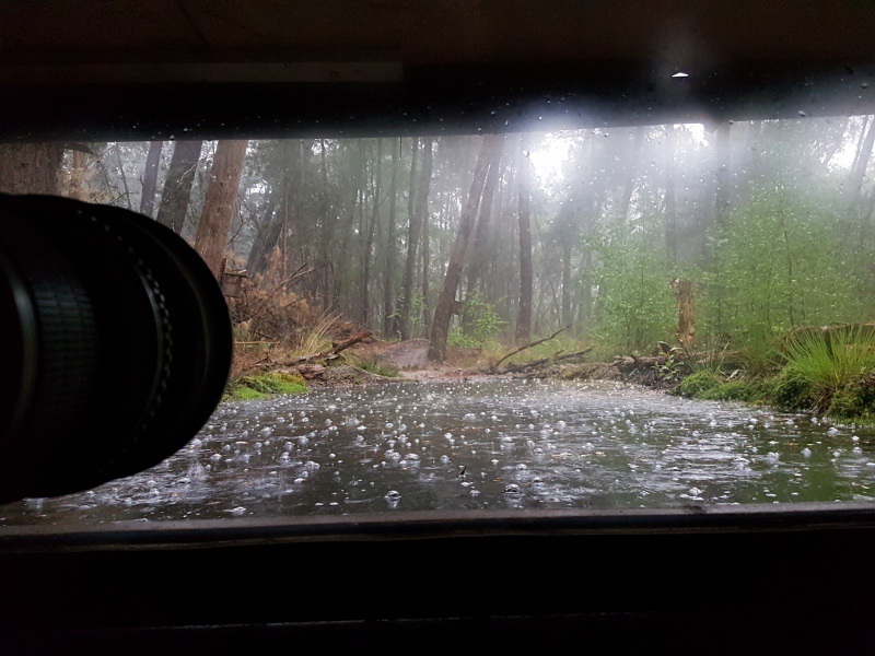Ik was mooi op tijd bij de plek waar ik de auto moest parkeren (voordeel van deze tijd: het is niet druk op de weg) en ik begon vol goede moed aan een wandelingetje van zo’n 15 minuten. Ik vond niet echt de plekken die op de foto’s, welke bij de instructies zaten, te zien waren, maar dacht op een gegeven moment dat ik er wel moest zijn. Mede omdat ik bij een soort grens was aangekomen. Ik heb even zitten wachten, waarbij ik 3 reeën voorbij zag lopen, maar na zo’n 10 minuten was ik toch bang dat er iets niet klopte. Het was inmiddels 7 uur geweest, het tijdstip waarop we hadden afgesproken, en Glenn was nergens te zien. Ik heb hem toen gebeld en hij gaf aan er bijna te zijn, maar..: dat was niet bij mij. Ik ben weer teruggelopen richting de auto en zag Glenn toen ook nergens. Ik heb hem toen weer geprobeerd te bellen, maar had geen ontvangst, waarop ik iets ben gaan rijden met de auto in de hoop Glenn te vinden, of in ieder geval ontvangst… Uiteindelijk had ik weer even contact en belde Glenn mij. We hebben toen afgesproken dat ik in de buurt van de parkeerplek zou wachten en hij naar me toe zou komen. Na nog eens 10 minuten wachten, hadden we elkaar eindelijk gevonden. De auto had ik in eerste instantie op de goede plek staan en heb hem daar weer teruggezet. De spullen konden bij Glenn in de auto, wat het lopen aanzienlijk verlichtte, en ik ben weer gaan lopen. Het was hetzelfde pad wat ik eerder gelopen had, maar om er zeker van te zijn dat het nu niet meer verkeerd zou gaan, maakte Glenn op een aantal punten van takken pijlen om de richting aan te geven. Het bleek dat ik de eerste keer te ver was gelopen en ik zag Glenn met de auto dus al snel staan. Ik was daar ook wel heel blij mee, want het was ondertussen behoorlijk gaan regenen (waar ik niet op gekleed was), en samen met Glenn ben ik toen het laatste stukje naar de hut gelopen. Bij de hut aangekomen hebben we nog even gesproken over de bizarre situatie zoals die er nu is, heeft Glenn wat voer (inclusief duif) neergelegd en heeft hij de hut van binnen nog wat gekuist. Na afscheid te hebben genomen, heb ik plaatsgenomen in de hut en kon ik eindelijk weer eens gaan fotograferen.