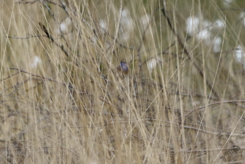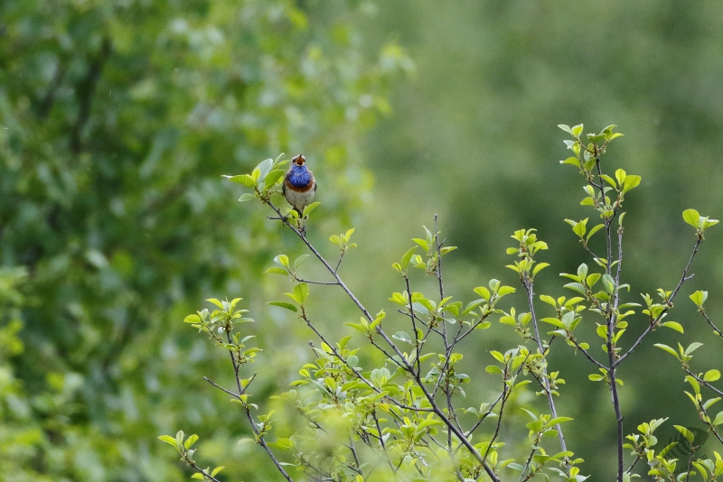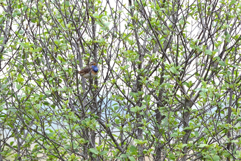 Ik ben weer teruggelopen over het houtpaadje en stopte op het moment dat ik een welbekende prachtige zang hoorde: een Blauwborst had aan de overkant van het water z’n territorium en wilde dat goed laten weten! Vanaf verschillende zangposities zat hij volop te zingen en ik kreeg gelegenheid om hem, wat verscholen in een wilgenboompje, vast te leggen. Ik werd kortstondig van hem afgeleid toen er een Koekoek voorbij kwam vliegen en niet eens zo heel ver in een ander wilgenboompje ging zitten. Zo’n kans laat ik niet voorbij gaan en ik heb de focus toen even op hem gelegd. Toen hij weer vertrokken was, heb ik de camera weer gedraaid en me weer geconcentreerd op de Blauwborst. Ik heb hem nog uitgebreid op verschillende zangposten volop zingend kunnen vastleggen, zelfs een filmpje kunnen maken, en bedacht dat het tijd werd het gebied achter het bezoekerscentrum nog even te gaan bezoeken.
