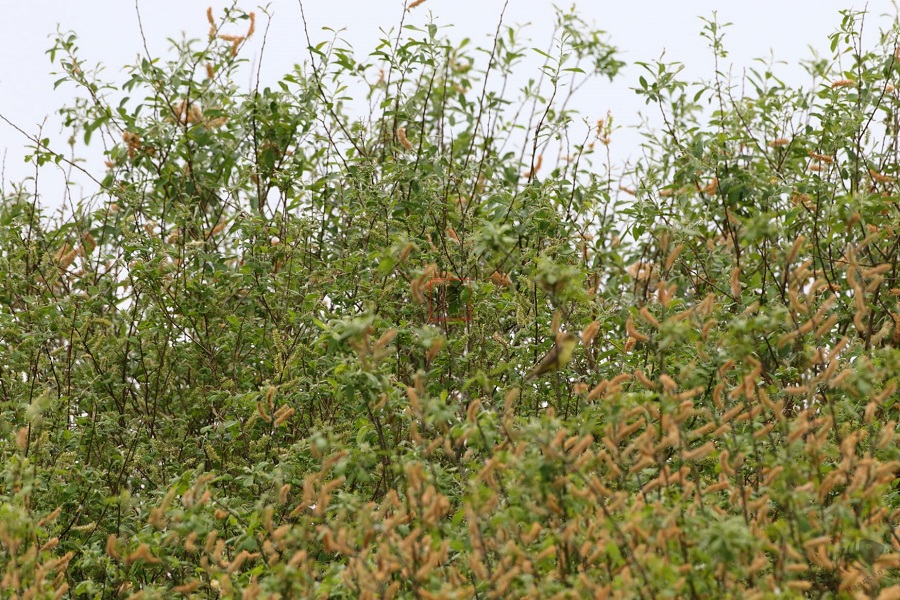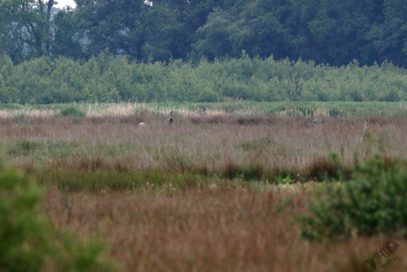 Toen het weer droog was ben ik het rondje gaan lopen en ook hier kwam ik 2 mensen tegen. Het waren enthousiaste vogelaars, waarvan er ééntje les gaf op de bosbouw en cultuurtechnische hogeschool Larenstein waar ik zo’n 30 jaar geleden ook aan gestuurd heb. Het kan zijn dat ik les van hem heb gehad, maar zeker weten doe ik het niet meer. Onder het praten werd de omgeving goed gescand en werd er een groep Kraanvogels heel in de verte gevonden. Het leken er zeker zo’n 10 te zijn, wat natuurlijk prachtig was om te zien! De 2 vogelaars gingen verder en ik volgde wat later (heb de Grauwe Klauwier die ook aanwezig zou moeten zijn nooit gevonden…) en werd nog opgehouden door een voorbij vliegende Koekoek en een Fitisje. Langs het fietspad in het struweel hoorde ik ook weer een Spotvogel. Ik heb minstens een kwartier gezocht, maar kreeg hem weer niet te vinden. Hij leek ook wel ver weg te zitten, maar toch… Teleurgesteld verder het fietspad afgelopen en daar hoorde ik weer een Spotvogel. Het was in ieder geval wel een genot om er zo veel te horen. Dat was al best een tijdje geleden. Ook bij deze vogel het statief neergezet in de hoop nu wel een glimp op te kunnen vangen en bij hem bleek dat 3 maal inderdaad scheepsrecht kan zijn. Hij zat ver weg en soms kon ik gewoon niet zien waar ik op moest richten omdat hij niet opviel tussen de bladeren, maar uiteindelijk heb ik hem toch mooi kunnen vastleggen. Eindelijk weer een keertje!