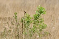 De tijd begon toch wel een klein beetje te dringen en ik heb de ronde afgerond en nog even gestopt bij het poeltje aan het begin van het pad. Ook hier zaten Huiszwaluwen, waar ik gisteren mijn vogeldagen mee begonnen was, en deze dieren hadden wat meer geluk met het vinden van nestmateriaal. aan de oevers van het plasje konden ze voldoende modder vinden en kon ik eindelijk de foto’s maken waarop ik gisteren al gehoopt had. Ook kwam er een Roodborsttapuitje in een rietstengel zitten wat een mooi plaatje was en daarmee ben ik weer naar de auto gelopen. Ik ben de weg nog afgereden naar het einde om te kijken of er Boomvalken zaten, maar deze heb ik helaas niet gezien (ik heb trouwens ook geen Libellen gezien…). Daarop de auto omgedraaid en richting huis gegaan. Je kunt het Veen nooit zomaar verlaten en ik werd dan ook weer opgehouden door een Spotvogel in een bosje. Ook deze imitator kreeg ik niet in beeld, maar wel verscheen er een Grasmus aan de andere kant van de auto en deze wilde dan nog wel even een afscheidsliedje zingen. En daar heb ik het bij gelaten.