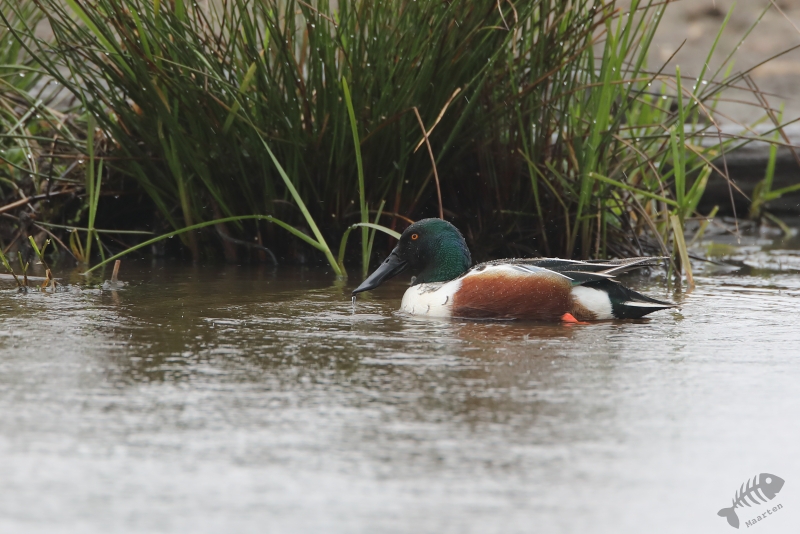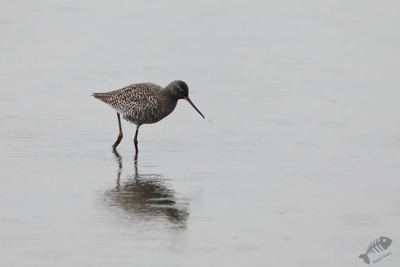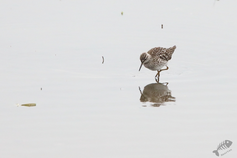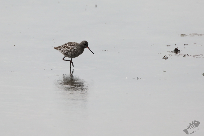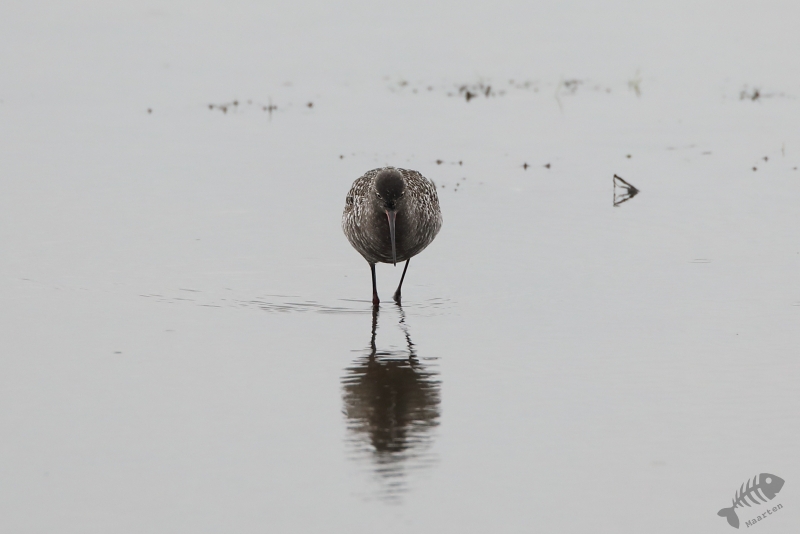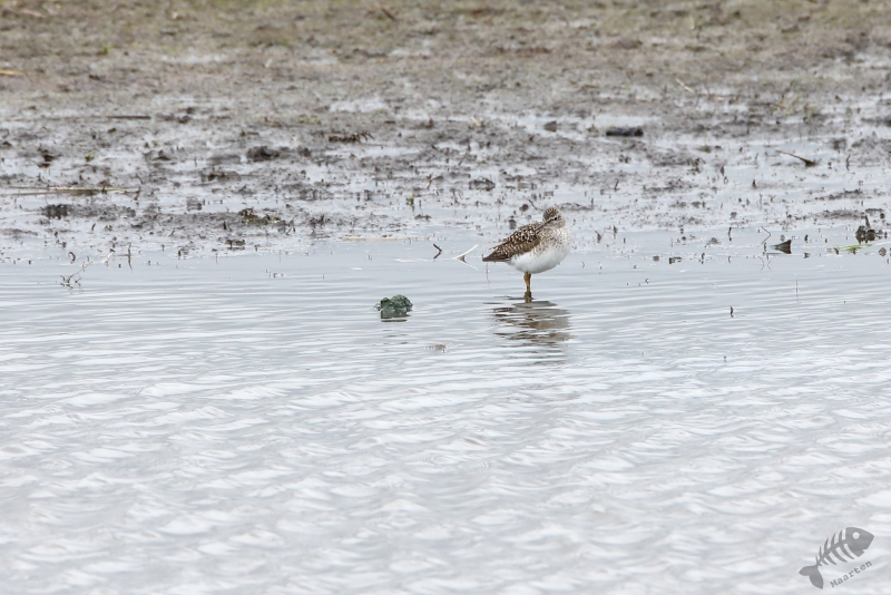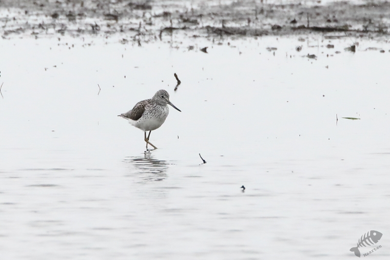 Uiteindelijk kwam ik bij de watertjes aan waar het allemaal om te doen was. Van afstand had ik al gezien dat er inderdaad wat waaders rondwaadde en dus kon ik opzoek gaan naar de verschillende Ruiters. Als eerste wist ik een Ruiter vast te leggen waarvan ik het idee had dat het een Bosruiter was (ook deze waren eerder waargenomen). Tot mijn schande moet ik bekennen dat ik thuis, bij het zien van de foto’s op een groter scherm, pas zag dat het een Groenpootruiter was. Ik kwam er mede achter doordat ik toch ook de Bosruiter had weten vast te leggen en ik ze dus goed kon vergelijken. Maar het meest blij werd ik misschien toch wel van de 2 Zwarte Ruiters die er inderdaad ook bleken te zitten. Ik ben bang dat het sombere weer ze geen recht doen, maar aan de andere kant was hun prachtige rugtekening nu wel heel mooi te zien!