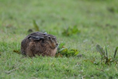 Met de auto ben ik vervolgens het binnendijkse gebied afgereden waar ik als eerste een totaal verkleumde Haas vond. Wat een intrieste aanblik! Maar ook de aanwezige Grutto’s en Spreeuwen leken het weer behoorlijk zat te zijn. Om alvast richting huis te gaan, ben ik naar de west-polder gereden om het Nekkeveld af te speuren. Ik vond hier een Lepelaar, die aardig in de buurt bleef, maar ook een Kleine Plevier liet zich heel mooi zien, al keek hij ook licht chagrijnig. Het meest blij op dit stuk werd ik op de weg terug van een Veldleeuwerik die heel mooi bleef zitten.