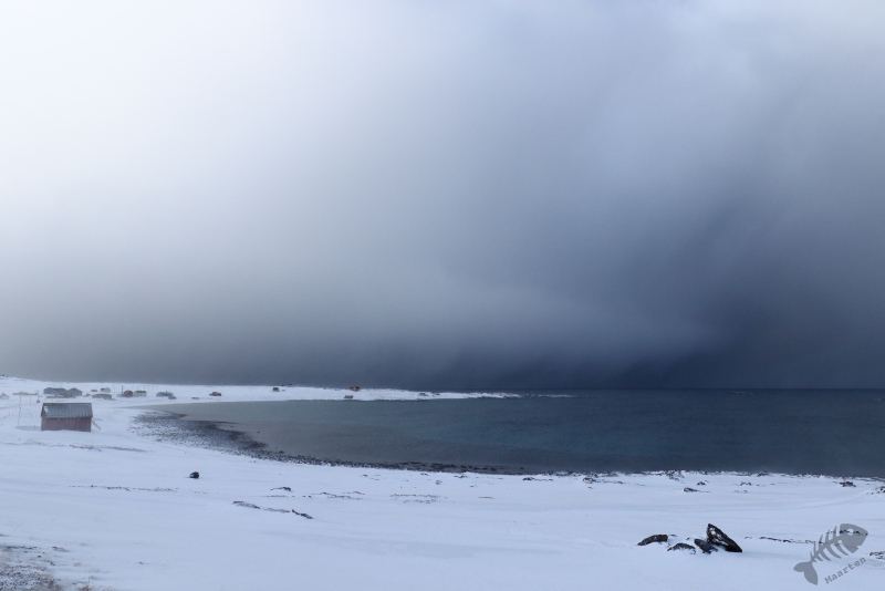 De eerste volle dag op Varanger. Ik had niet per se een uitgesproken plan per dag, maar had 1 ding op mijn verlanglijstje staan: naar Båtsfjord om in de drijvende schuilhut Koningseiders te gaan fotograferen. Het enige wat dit idee wat gecompliceerder maakt, zijn natuurlijk de weersomstandigheden. Het was dus belangrijk het weer te volgen en dan de beste gelegenheid direct aan te grijpen. Nadeel van deze tactiek was alleen het volgende: de hut moet je reserveren en je moet er ’s ochtends heel vroeg in gaan. Ik kon dus niet ad hoc naar Båtsfjord vetrekken op het moment dat het weer het toeliet en mooie plaatjes maken… Het leek toch een lastige wens te zijn om in vervulling te laten gaan.