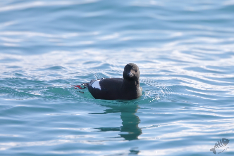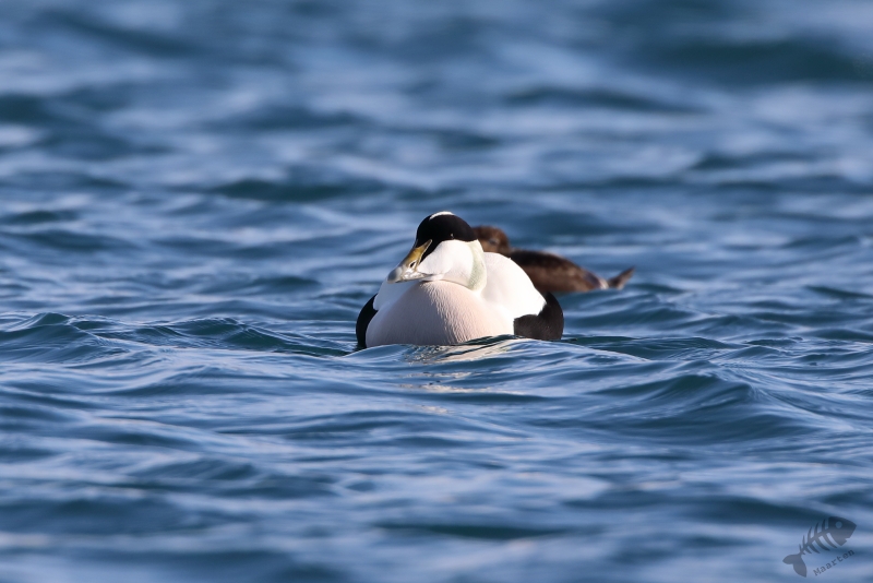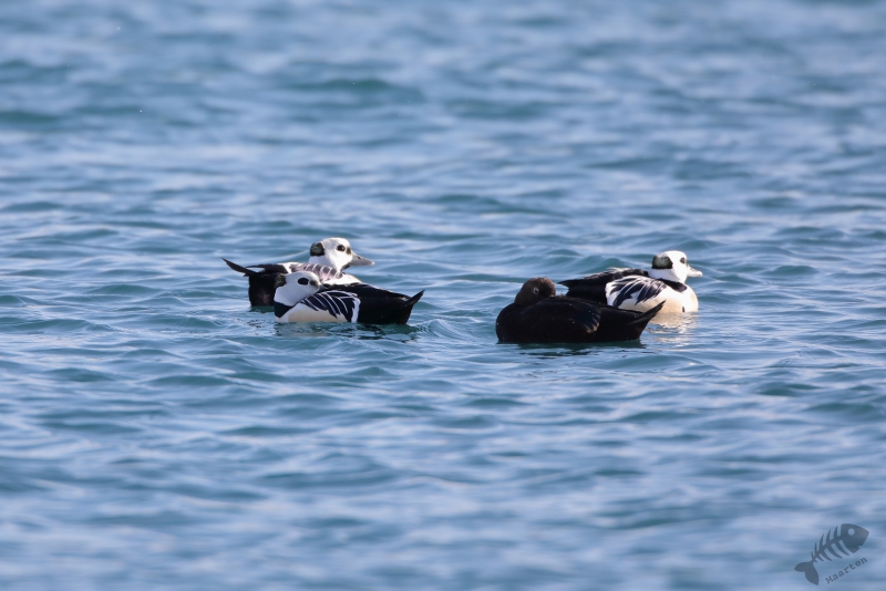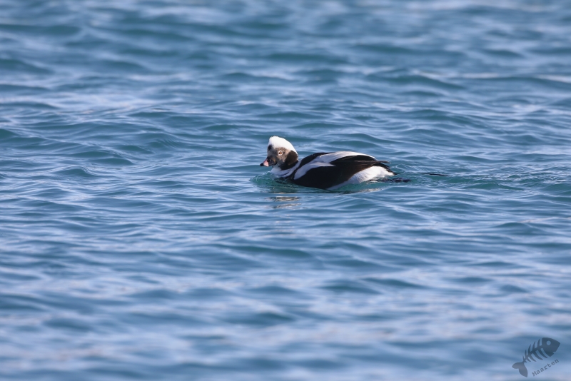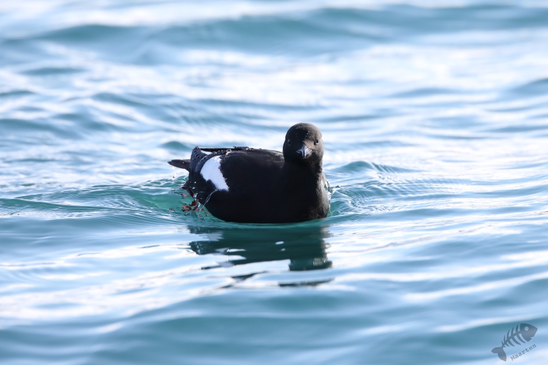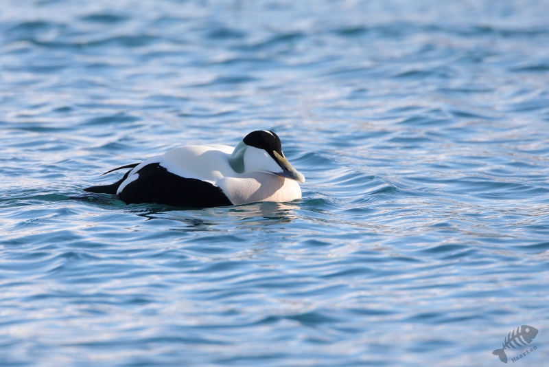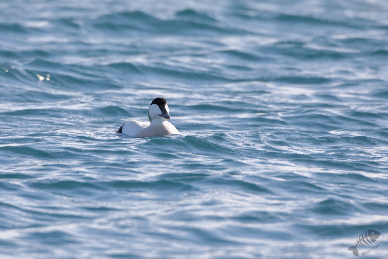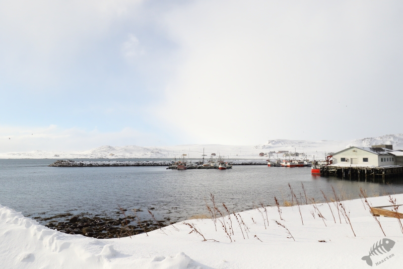 Daarna ben ik in de auto gestapt en ben naar Vadsø gereden. In de haven waar ik in 2017 heel mooi IJseendjes en Stellers Eiders had kunnen fotograferen, heb ik de eerste stop gemaakt. Deze 2 soorten zaten er weer, samen met Eiders en de nodige Zilvermeeuwen. Ik ben eerst de pier opgelopen waar de schuilhut van Biotope aan het uiteinde op staat en heb vanaf daar deze verschillende soorten al aardig kunnen vastleggen. Om toch nog wat dichterbij de vogels te kunnen komen, ben ik naar de pier gelopen waar de vissersboten aangemeerd liggen. De afstand tot de vogels is vanaf daar al een stukje kleiner, maar aan het uiteinde kon ik een lager aanlegsteigertje “oplopen” en ben daar, een beetje verscholen achter een boot, gaan zitten. Het standpunt vanaf dit punt was heel mooi, omdat ik net boven het water zat en de vogels kwamen inderdaad weer nét iets dichterbij. Zo kon ik al aardig de beoogde foto’s maken. Als verrassing kwam er heel dichtbij een Zwarte Zeekoet voorbij zwemmen die ik heel fraai kon fotograferen. Buiten deze mooie Koet, bleef alles op behoorlijke afstand en besloot ik verder te rijden richting Kiberg.