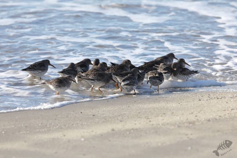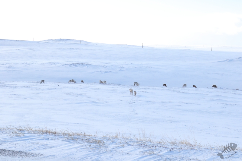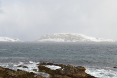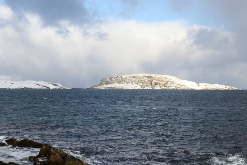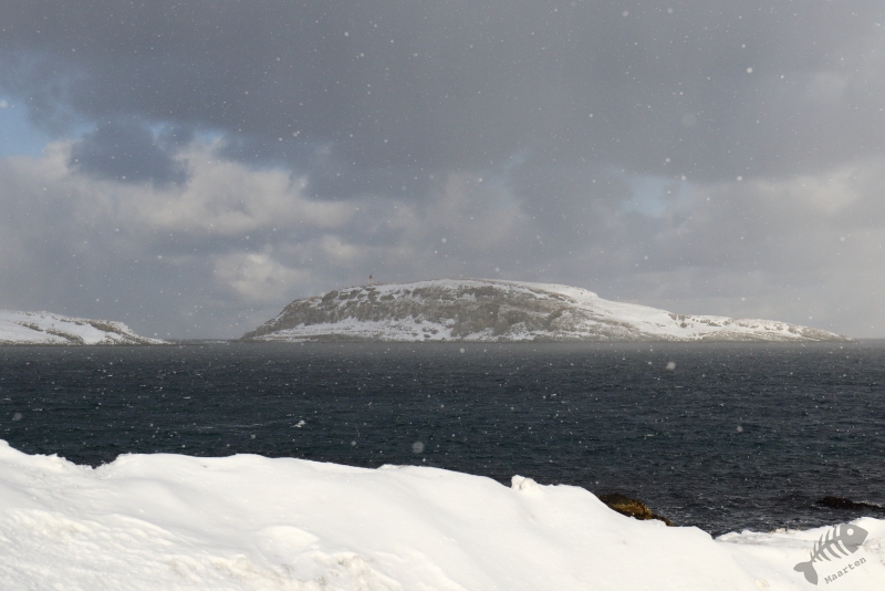 Zonder al te veel sneeuwstormen wist ik Vardø te bereiken en heb ik eerst de haven afgescand. Daar leek het rustig en toen ben ik maar doorgereden naar Hasselnes vanwaar je een mooi uitzicht hebt over de Barentszzee en Hornøya. Op het moment dat ik daar aankwam en probeerde de deur van de auto te openen, werd deze bijna direct weer dicht geblazen. Een werkelijk niet normaal harde wind stond op deze punt van het eiland, maar het lukte toch uit de auto te komen en m’n spullen neer te zetten. Op het water tussen Hasselnes en Hornøya was niet heel veel te zien (niet op de laatste plaats omdat ik mijn verrekijken nauwelijks stil kon houden), maar de tegen de wind in zwoegende Drieteen- en Zilvermeeuwen, maakten het toch leuk om daar te staan en te proberen deze prachtdieren vast te leggen. Het was een uitdaging, aangezien m’n camera stond te trillen op het statief, maar het is toch gelukt een paar aardige plaatjes te maken. Op het moment dat ik het idee had “lekker uitgewaaid te zijn”, ben ik de rit naar de westkant van het schiereiland weer begonnen. Ik had het idee dat ik mooi tussen 2 sneeuwstormen de gunstige kant van het schiereiland kon bereiken, wat deels klopte (maar niet helemaal dus…: wat is het toch een uitdaging om in deze omstandigheden auto te rijden…), maar wist de meer zonnige zuidkant van het schiereiland weer veilig te bereiken. Ik ben alleen nog bij Golnes gestopt omdat ik iets over de rotsen aan het water zag lopen. Dit bleken Paarse Strandlopers te zijn en ik heb nog even wat tijd genomen om deze bikkels vast te leggen. Omdat van daaraf het uitzicht op Ekkerøy heel mooi was met het licht van de ondergaande zon erop, heb ik ook nog even de groothoek op de camera geschroeft en heb wat sfeerplaatjes van de omgeving gemaakt. Wat is het toch heerlijk hier te kunnen zijn…!