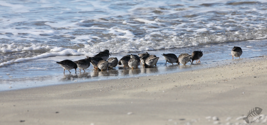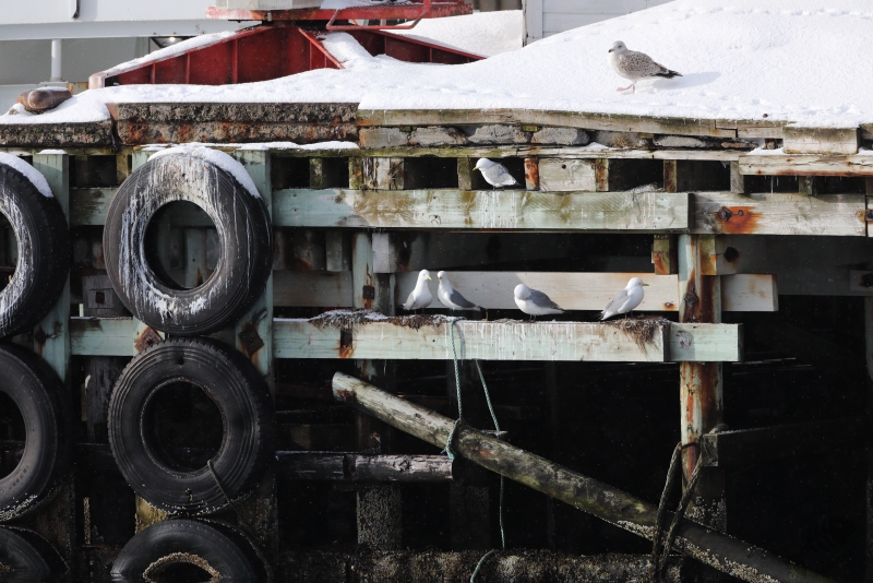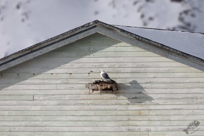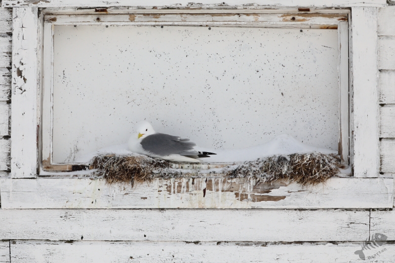 Uiteindelijk kwam ik bij Kiberg aan en kon direct aan de slag met een groepje Paarse Strandlopers op het strand. Blijkbaar hadden ze een voedselrijk stukje gevonden, want ze verdrongen zich op een heel klein stukje strand van zo’n vierkante meter. In de haven bleek het rustig te zijn, nou ja, rustig: een kleine kolonie Drieteenmeeuwen had zich gevestigd op een aantal gebouwen en de palen van de steigers in de haven. En waar een kolonie Drietenen is, is een hoop geluid! Het “Kittieweek, kittieweek” was overal te horen, wat me weer helemaal het gevoel gaf terug in Noorwegen te zijn: wat een heerlijk geluid! Na verschillende Meeuwen vastgelegd te hebben en een groepje IJseenden, wat maar niet dichterbij wilde komen, vanuit de verte gefotografeerd te hebben, besloot ik toch nog maar verder door te rijden naar Vardø. Misschien zaten de Koningseiders hier wel weer, net als in 2017, en anders was er vast nog wel wat anders te zien…