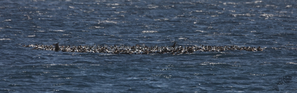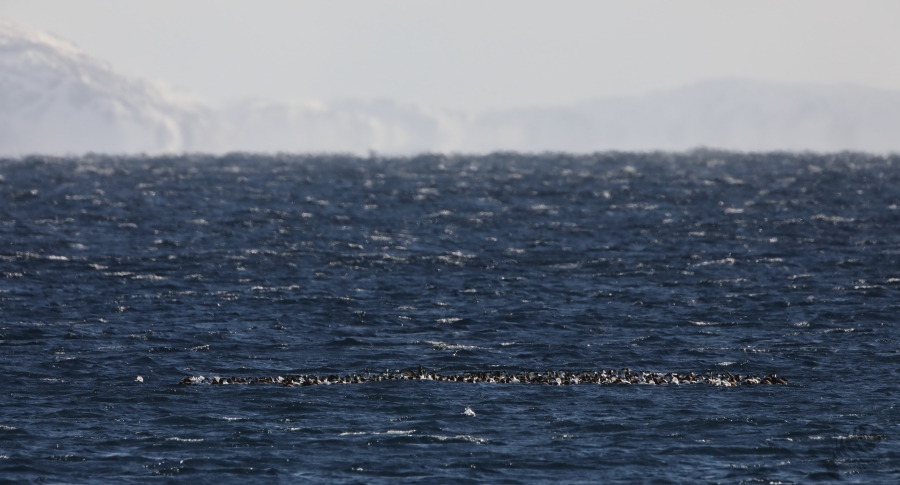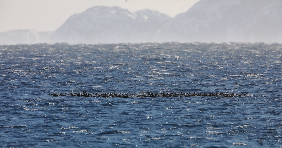 In het boek van Biotope, wat ik voor elk vertrek naar Varanger opnieuw even raadpleeg, schreef Tormod Amundsen over Eiders die in enorme groepen in het fjord of op de zee bij Vardø rondzwommen: “rafts” genoemd. Terwijl ik naar het oosten reed zag ik in het fjord een grote, donkere “vlek” en gelukkig had ik ergens gelegenheid even te stoppen. Het bleek zo’n “raft” van Eiders te zijn. Een groep van een paar honderd vogels dreef behoorlijk ver van de kust in het fjord, zich op deze manier beschermend tegen de elementen. Ik kon een aantal aardige plaatjes maken, met de imposante bergen van de overkant op de achtergrond, een heel mooi beeld.