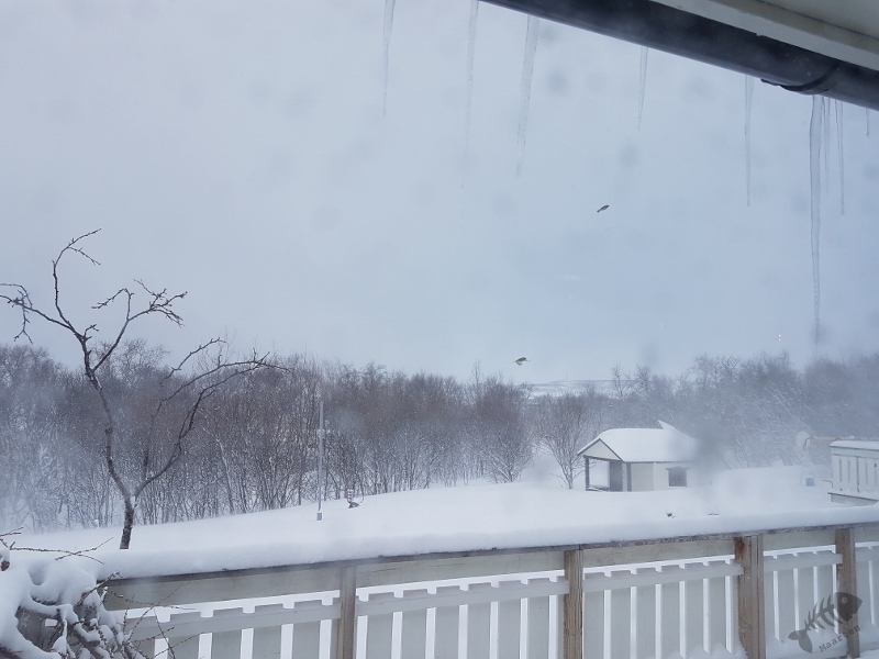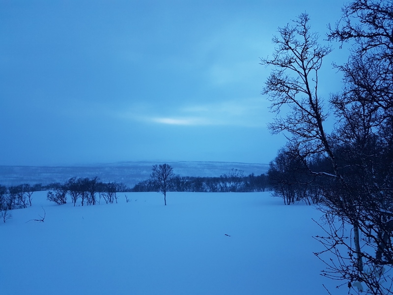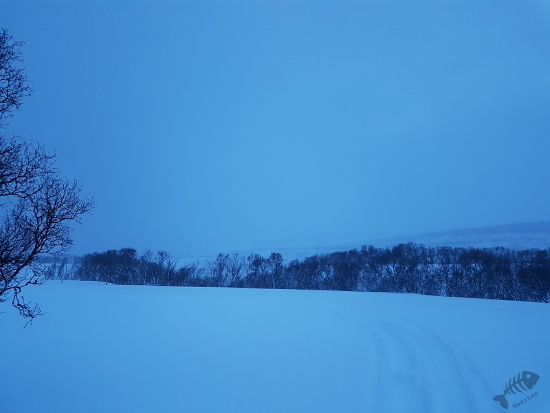 Een uur of 6 ’s avonds werd het eindelijk droog. Omdat ik de hele dag binnen had gezeten, vond ik het wel even lekker om voor het eten nog een wandelingetje te maken. Ik ben de weg die langs Varangertunet loopt een stukje omhoog gelopen. Het was heerlijk fris, nog behoorlijk licht en dus zalig om buiten te zijn. Lastig lopen was het wel een beetje: daar waar de auto’s gereden hadden was het spekglad (wat je met de auto met spijkerbanden dan weer niet merkt) en van de losse sneeuw kon ik niet zien hoe diep het was, dus daar heb ik me een aantal keer behoorlijk in vergist. Wel grappig om te zien dat sneeuwscooters dan ineens een gemeengoed zijn: op en langs de weg reden er regelmatig voorbij, waarbij de meest onmogelijke paden genomen werden.