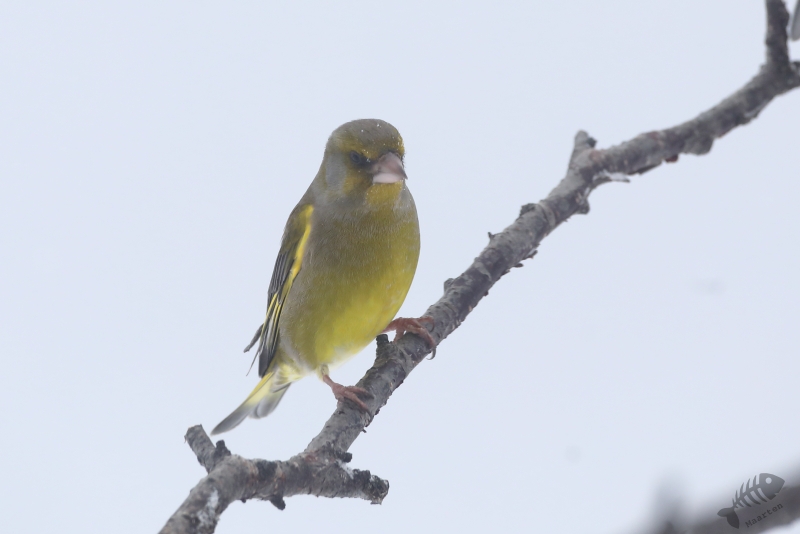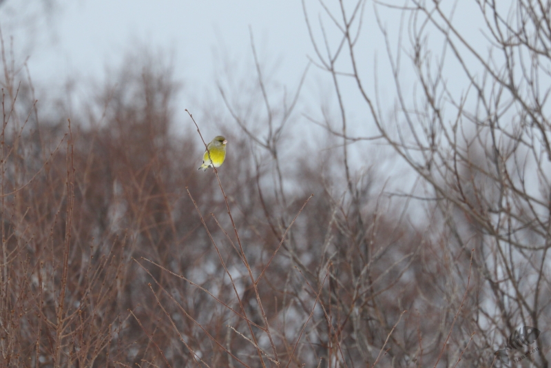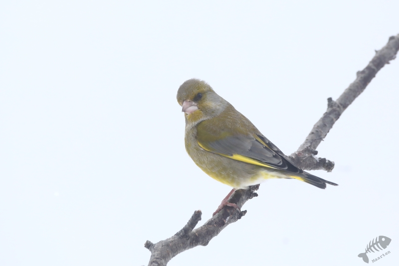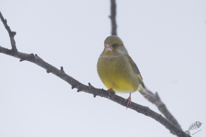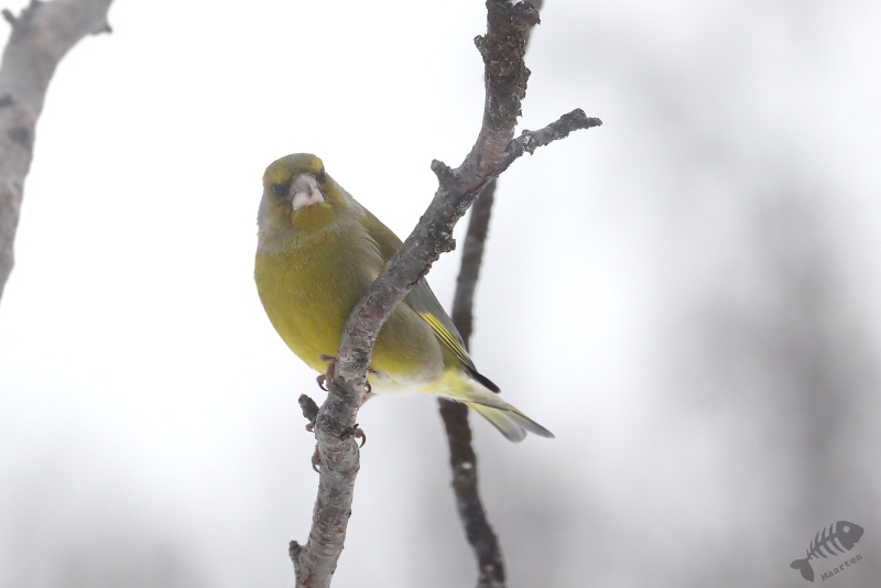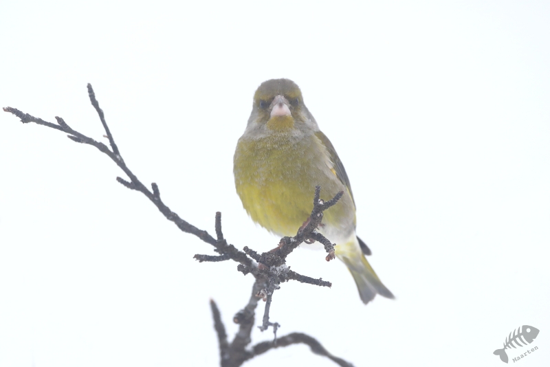 Ik heb af en aan aan de tafel voor de birdfeeder gezeten en dus heel wat foto’s gemaakt. Wat later in de middag viel m’n oog op een Groenling wat verderop in de boompjes. Het geel van de vogel was zó intens dat het bijna leek alsof hij licht gaf.