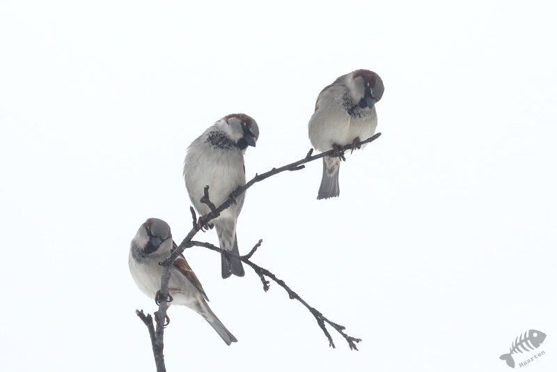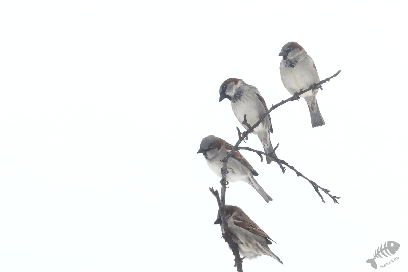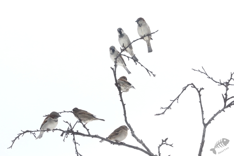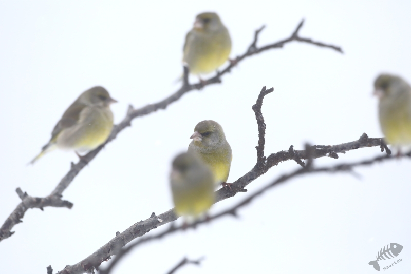 Ik heb alles gedaan zoals hierboven beschreven. Terwijl ik bezig was met de foto’s, had ik m’n camera naast me liggen om alles wat op de feeder kwam te fotograferen. En dat waren toch nog 6 leuke soorten. In het wat grauwe uitzicht vielen de meeste soorten heel goed op. Met name de Groenlingen waren goed vertegenwoordigd, maar ook de Huismussen lieten zich veelvuldig zien. Ik heb me dan ook aardig losgeklikt op deze soorten, maar het is dan toch wel heel leuk wanneer er af en toe een andere soort tussenpiept zoals de Barmsijs, Matkop of Sijsje.
