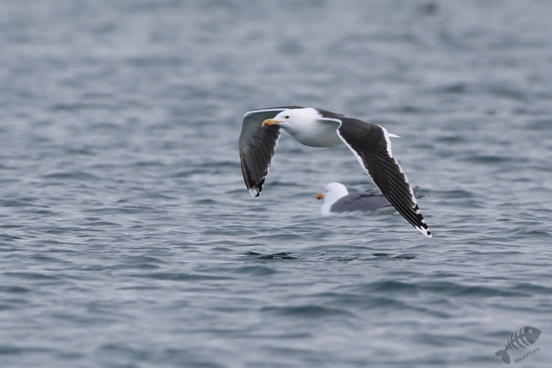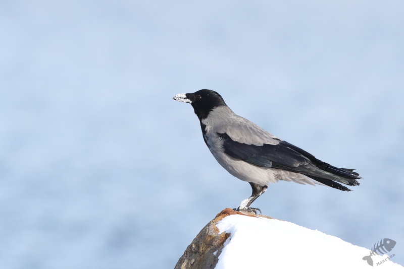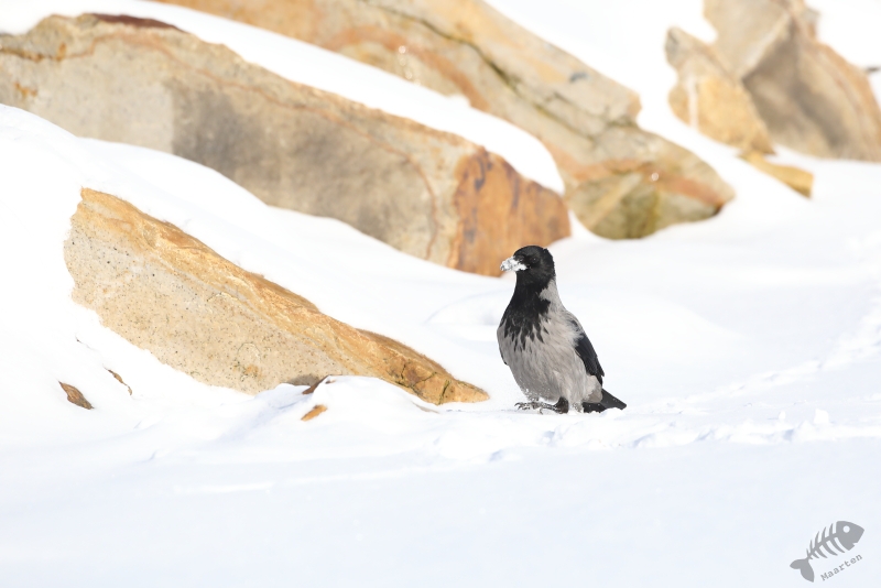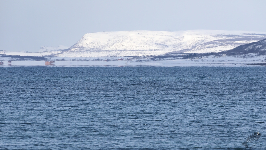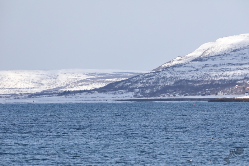 Om weer even rustig verder te gaan, ben ik “sfeerplaatjes” gaan maken van het Varangerfjord met daarop minuscuul verschillende vogels en de bergen op de achtergrond. Ik vind het altijd heel mooi de vogels in hun omgeving weer te geven, al was dit misschien wat extreem… Het lukte me ook nog een paar aardige vliegbeelden te maken van met name IJseenden en kreeg bezoek van een Bonte Kraai die niet ver van me vandaan op de pier ging zitten. Zo had ik deze noordelijke krachtpatser ook een keer mooi in beeld.