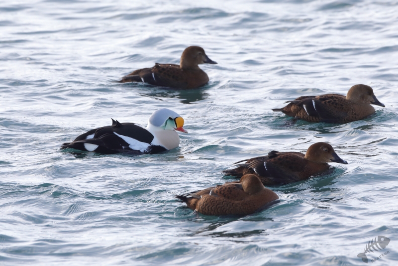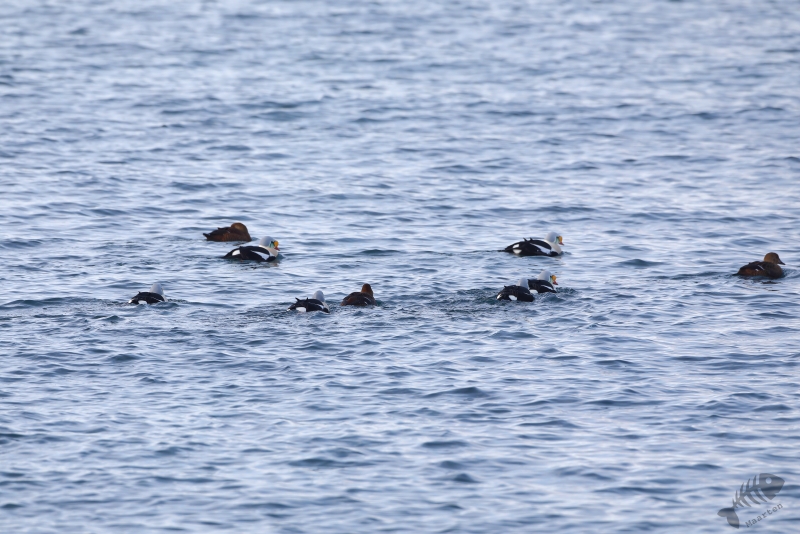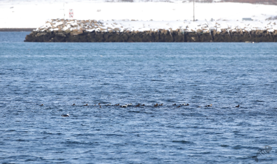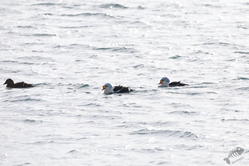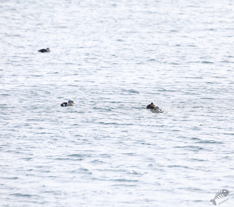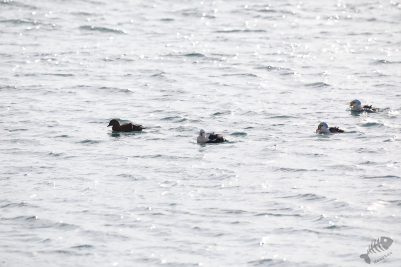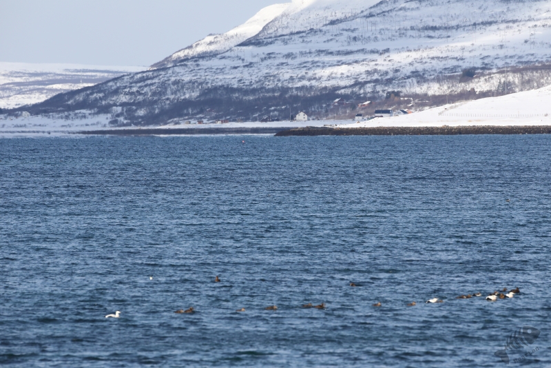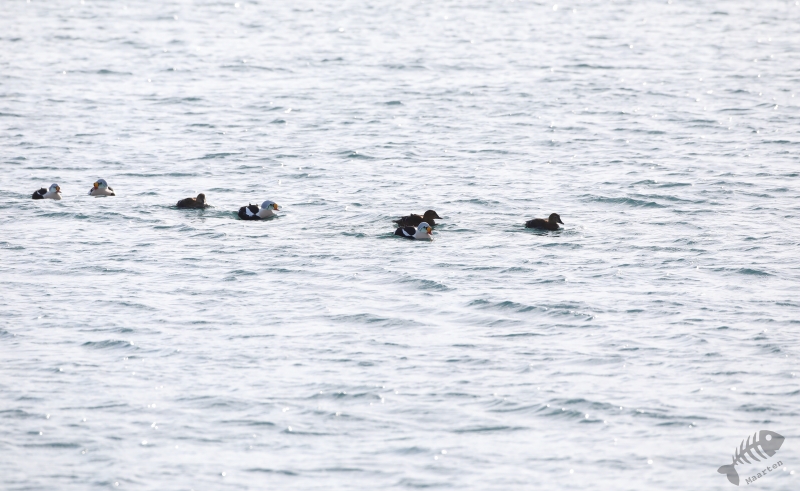 Om 9 uur stond ik weer op de pier, klaar om aan de slag te gaan. Wat ik vaak doe wanneer ik op zo’n plek aankom, is even rustig met de verrekijker het water afzoeken om te zien wat er zoal zit. Toen ik de haven inkeek in oostelijke richting (net voor de benzinepomp waar ze lekkere broodjes hebben), zag ik in de verte een groepje Eiders. Maar wat ik gisteren had, had ik vandaag weer: vorm en grootte pasten nét niet bij de “Gewone” Eider en zeker niet bij de Stellers… Het zou toch niet een hele groep Koningseiders zijn!? Héél langzaam zwom de groep mijn richting uit waardoor ik ze steeds beter kon zien: het waren Koningseiders! Een groepje van zo’n 10 dieren zwom rustig door de haven en leken dus steeds dichterbij te komen! Het ging tergend langzaam, maar wel zeker: ze zwommen richting de pier, waarschijnlijk om het open Fjord in te gaan. Ik durfde bijna niet meer te bewegen en heb me half verscholen achter m’n camera op statief, steeds maar foto’s maken van steeds beter zichtbare Koningseiders. En ze kwamen echt recht op me af… Na 10 minuten, wat écht wel langer leek, zwommen ze op zo’n kleine 10 meter onder de pier langs, vlak voor mij langs! Wat een geweldig moment en een geweldig gezicht! Ik vind Eiders mooi, maar moet toch toegeven dat de Koningseiders wel iets extra’s hebben. Die kleuren in de kop zijn niet normaal zo mooi en ik kreeg de kans dit van zo dichtbij te zien. Waanzinnig! De verloren rit naar Båtsfjord was meteen vergeten (al zal ik de Sperweruil natuurlijk niet vergeten…). Hier zat ik op een openbare pier dezelfde foto’s te maken als vanuit de schuilhut (in ieder geval min of meer dan). In het zelfde rustige tempo als waarin ze naar me toe waren gezwommen, zwommen ze ook weer verder naar het Fjord. Na nog eens 10 minuten waren ze zo goed als uit het zicht verdwenen. Ik heb nog wel foto’s gemaakt van het groepje terwijl het steeds verder verdween en op een gegeven moment niet meer te zien was. Ik had weer even tijd om bij te komen…