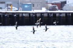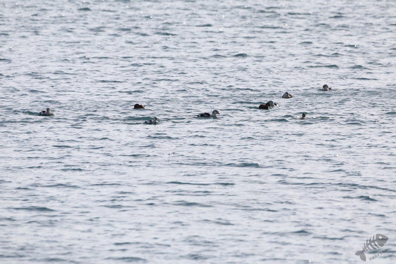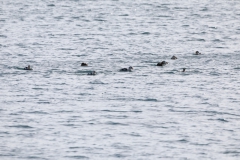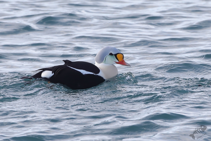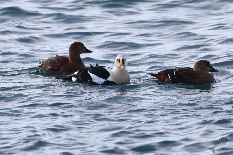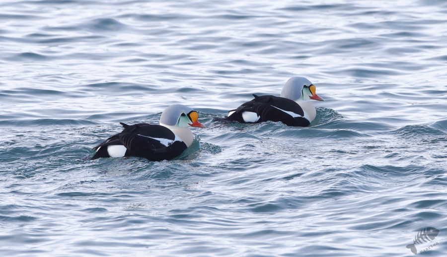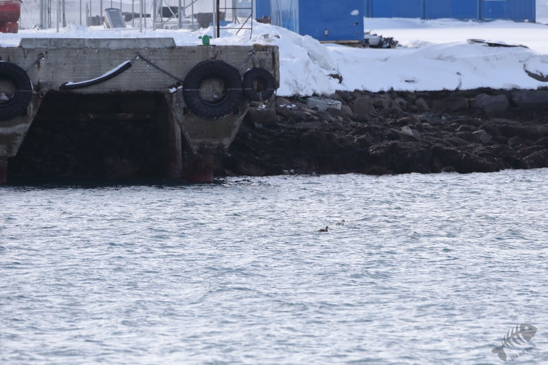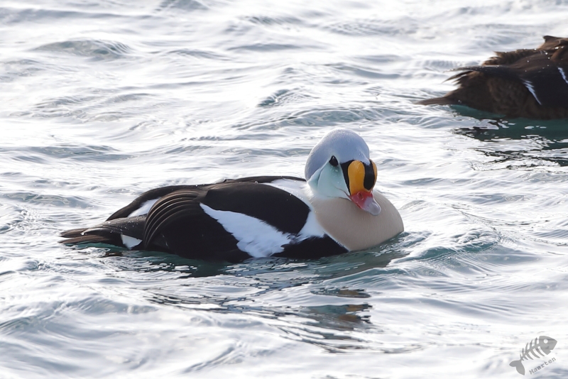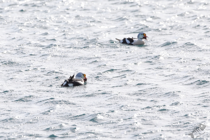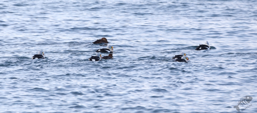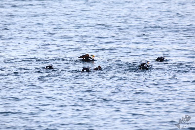 Om 9 uur stond ik weer op de pier, klaar om aan de slag te gaan. Wat ik vaak doe wanneer ik op zo’n plek aankom, is even rustig met de verrekijker het water afzoeken om te zien wat er zoal zit. Toen ik de haven inkeek in oostelijke richting (net voor de benzinepomp waar ze lekkere broodjes hebben), zag ik in de verte een groepje Eiders. Maar wat ik gisteren had, had ik vandaag weer: vorm en grootte pasten nét niet bij de “Gewone” Eider en zeker niet bij de Stellers… Het zou toch niet een hele groep Koningseiders zijn!? Héél langzaam zwom de groep mijn richting uit waardoor ik ze steeds beter kon zien: het waren Koningseiders! Een groepje van zo’n 10 dieren zwom rustig door de haven en leken dus steeds dichterbij te komen! Het ging tergend langzaam, maar wel zeker: ze zwommen richting de pier, waarschijnlijk om het open Fjord in te gaan. Ik durfde bijna niet meer te bewegen en heb me half verscholen achter m’n camera op statief, steeds maar foto’s maken van steeds beter zichtbare Koningseiders. En ze kwamen echt recht op me af… Na 10 minuten, wat écht wel langer leek, zwommen ze op zo’n kleine 10 meter onder de pier langs, vlak voor mij langs! Wat een geweldig moment en een geweldig gezicht! Ik vind Eiders mooi, maar moet toch toegeven dat de Koningseiders wel iets extra’s hebben. Die kleuren in de kop zijn niet normaal zo mooi en ik kreeg de kans dit van zo dichtbij te zien. Waanzinnig! De verloren rit naar Båtsfjord was meteen vergeten (al zal ik de Sperweruil natuurlijk niet vergeten…). Hier zat ik op een openbare pier dezelfde foto’s te maken als vanuit de schuilhut (in ieder geval min of meer dan). In het zelfde rustige tempo als waarin ze naar me toe waren gezwommen, zwommen ze ook weer verder naar het Fjord. Na nog eens 10 minuten waren ze zo goed als uit het zicht verdwenen. Ik heb nog wel foto’s gemaakt van het groepje terwijl het steeds verder verdween en op een gegeven moment niet meer te zien was. Ik had weer even tijd om bij te komen…