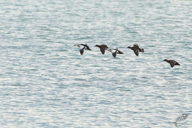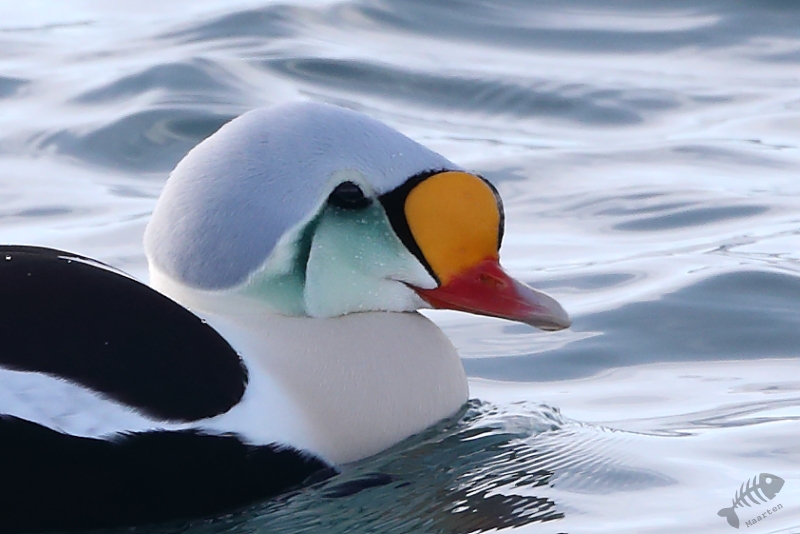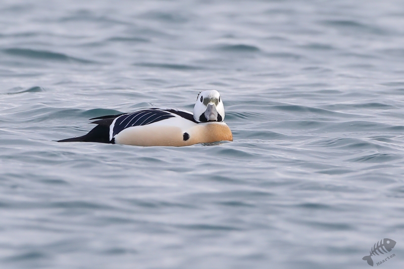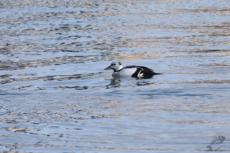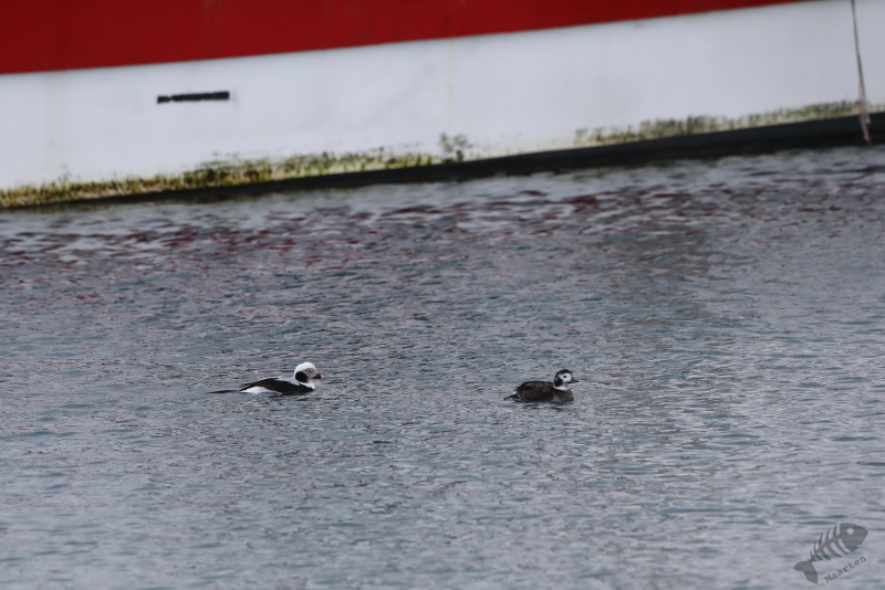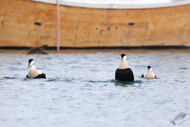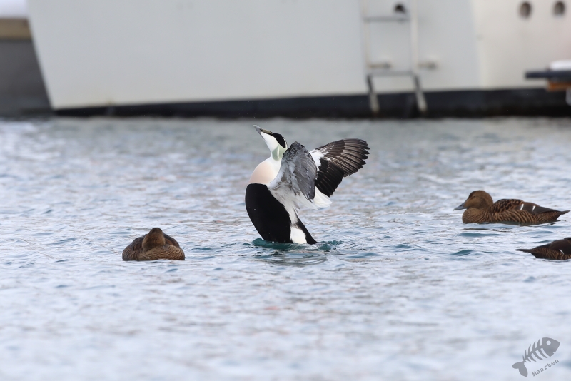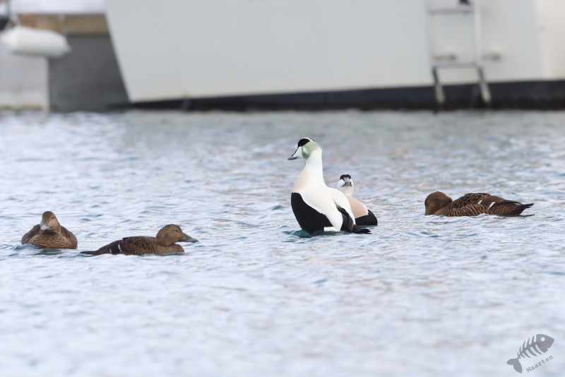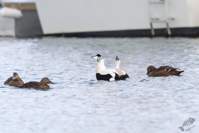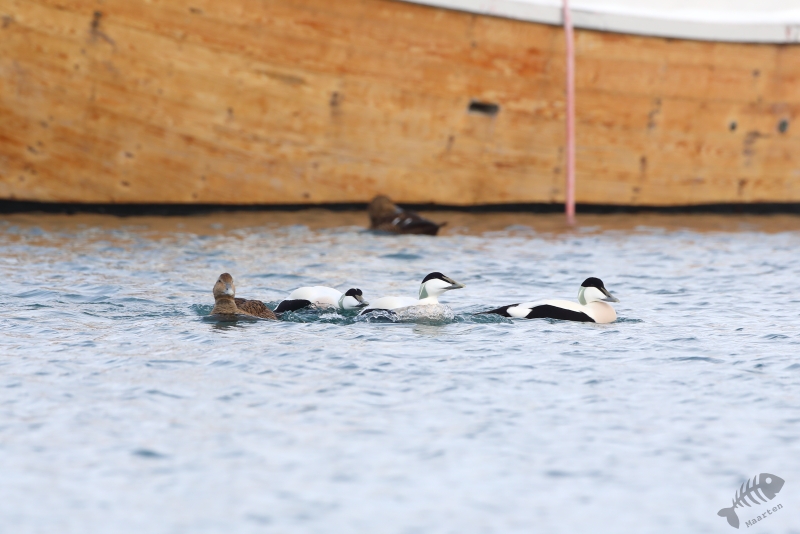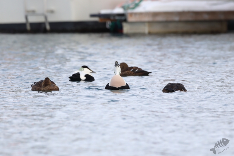 Na een tijdje ben ik weer naar de “havenpier” gelopen (daar waar de vissersboten aangemeerd liggen) om toch wat dichter bij de vogels te zijn. Een Stellers Eider kwam even kijken wat ik aan het doen was, en ik deed hetzelfde met hem, en kreeg zo ook weer mooie plaatjes van dit fraaie mannetje. Ik ben daarna naar het einde van de pier gelopen en ben weer de “vlonder” opgegaan die op het water drijft en waar 2 boten aan vast lagen. Ik zit daar een beetje verdekt, dicht op het water en dichter bij de vogels (als ze dicht genoeg bijkomen natuurlijk). Vanaf deze plek kon ik heel mooi wat Meeuwen fotograferen, een groepje IJseenden en een vrouwtje van deze prachtige Eenden die wat nieuwsgieriger was. Maar uiteindelijk werd de show gestolen door een mannetjes Eider. In het meest mooie licht zwom hij steeds dichterbij en begon zich niet ver van me uitgebreid te poetsen. Ik kreeg de kans hem in allerlei mooie poses af te beelden waarbij zijn kleuren ontzettend mooi te zien waren. Dan begin je je foto-dag met schitterende Koningseiders en dan eindigt het met zo’n geweldenaar! Wat is de natuur hier toch geweldig! Als laatste heb ik nog een hele serie geschoten van een koppeltje IJseenden, waarbij ik ze ook een aantal keer duikend te pakken had, en besloot ik daarna maar weer naar huis te gaan. Wat had ik nog meer te wensen: ik had Koningseiders, IJseenden, Stellers Eiders en Eiders in al hun pracht kunnen vastleggen! Wat wil een vogelliefhebber nog meer?