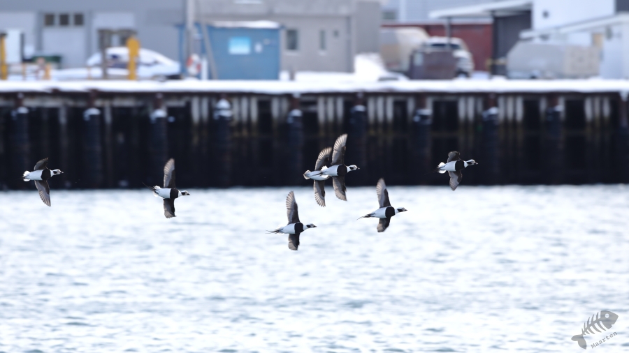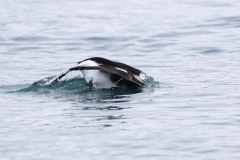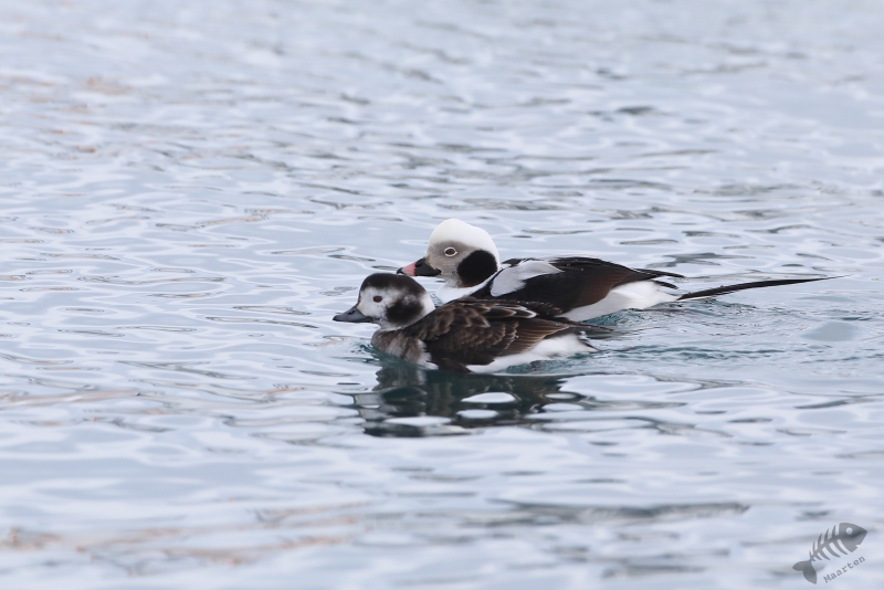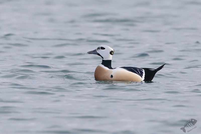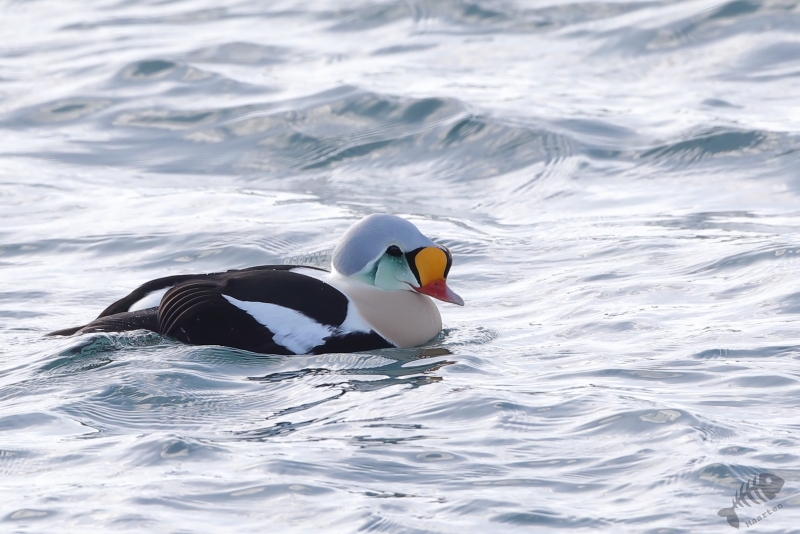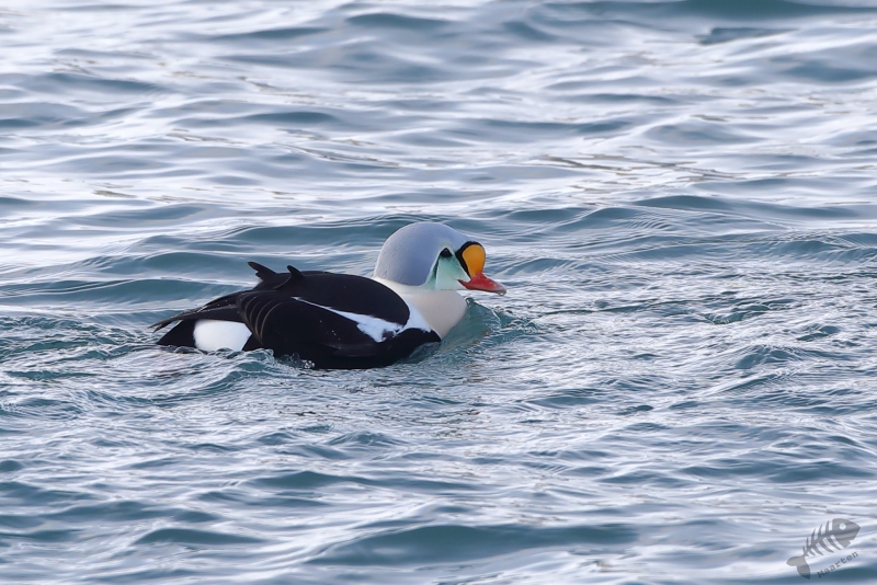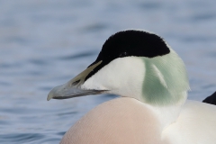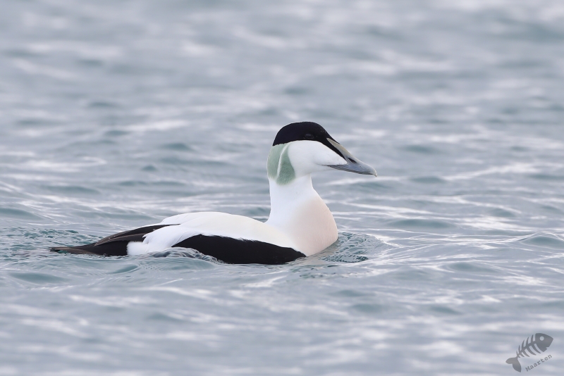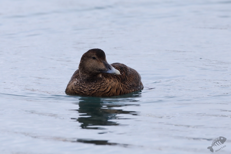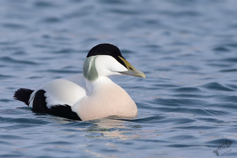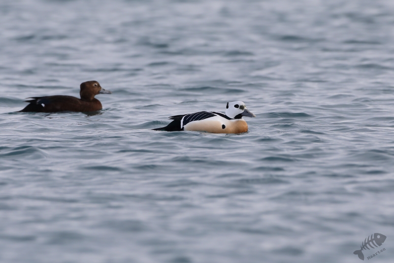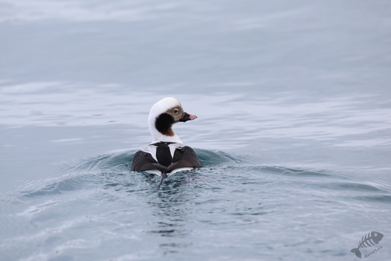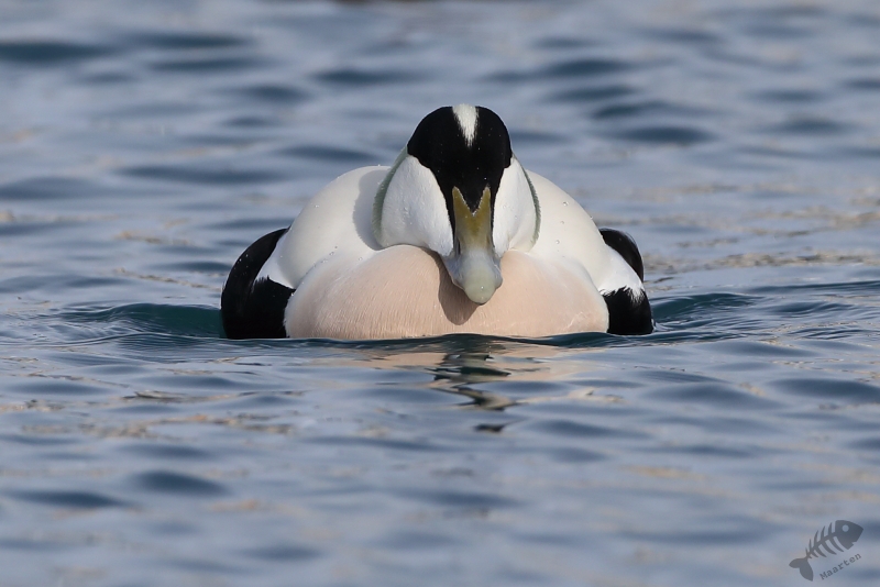 Na een tijdje ben ik weer naar de “havenpier” gelopen (daar waar de vissersboten aangemeerd liggen) om toch wat dichter bij de vogels te zijn. Een Stellers Eider kwam even kijken wat ik aan het doen was, en ik deed hetzelfde met hem, en kreeg zo ook weer mooie plaatjes van dit fraaie mannetje. Ik ben daarna naar het einde van de pier gelopen en ben weer de “vlonder” opgegaan die op het water drijft en waar 2 boten aan vast lagen. Ik zit daar een beetje verdekt, dicht op het water en dichter bij de vogels (als ze dicht genoeg bijkomen natuurlijk). Vanaf deze plek kon ik heel mooi wat Meeuwen fotograferen, een groepje IJseenden en een vrouwtje van deze prachtige Eenden die wat nieuwsgieriger was. Maar uiteindelijk werd de show gestolen door een mannetjes Eider. In het meest mooie licht zwom hij steeds dichterbij en begon zich niet ver van me uitgebreid te poetsen. Ik kreeg de kans hem in allerlei mooie poses af te beelden waarbij zijn kleuren ontzettend mooi te zien waren. Dan begin je je foto-dag met schitterende Koningseiders en dan eindigt het met zo’n geweldenaar! Wat is de natuur hier toch geweldig! Als laatste heb ik nog een hele serie geschoten van een koppeltje IJseenden, waarbij ik ze ook een aantal keer duikend te pakken had, en besloot ik daarna maar weer naar huis te gaan. Wat had ik nog meer te wensen: ik had Koningseiders, IJseenden, Stellers Eiders en Eiders in al hun pracht kunnen vastleggen! Wat wil een vogelliefhebber nog meer?