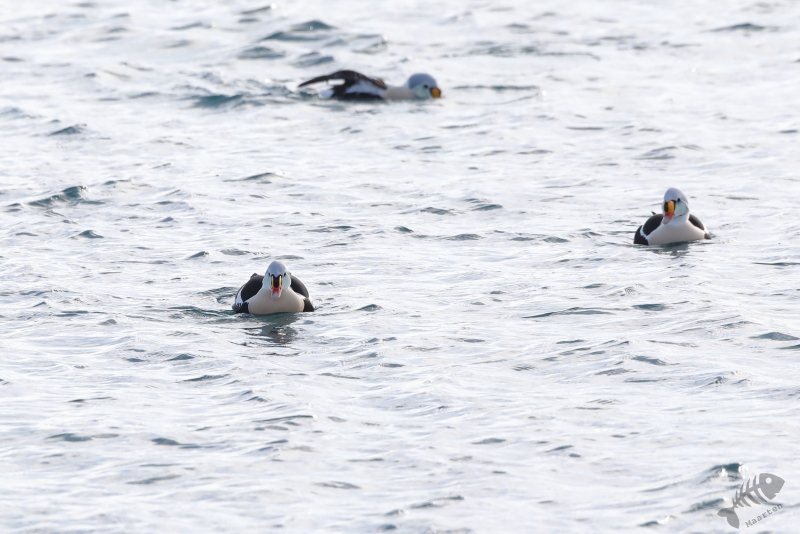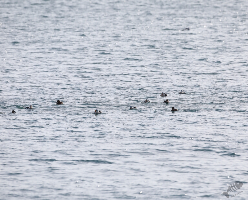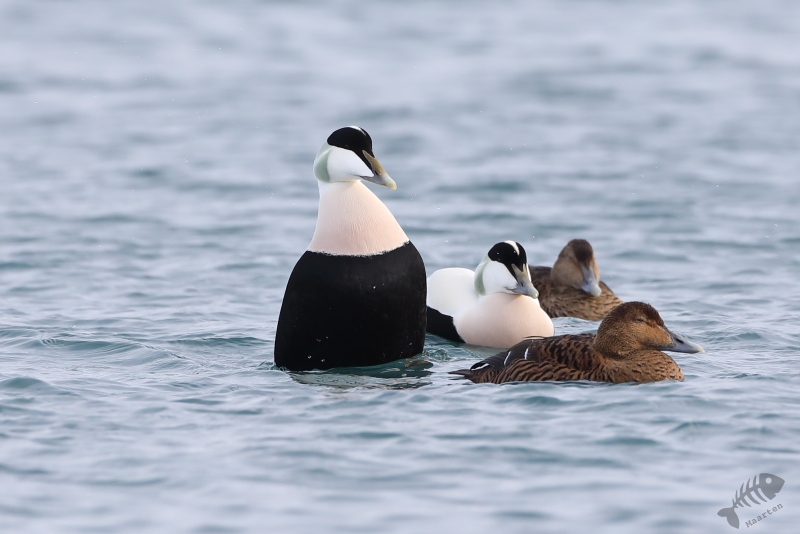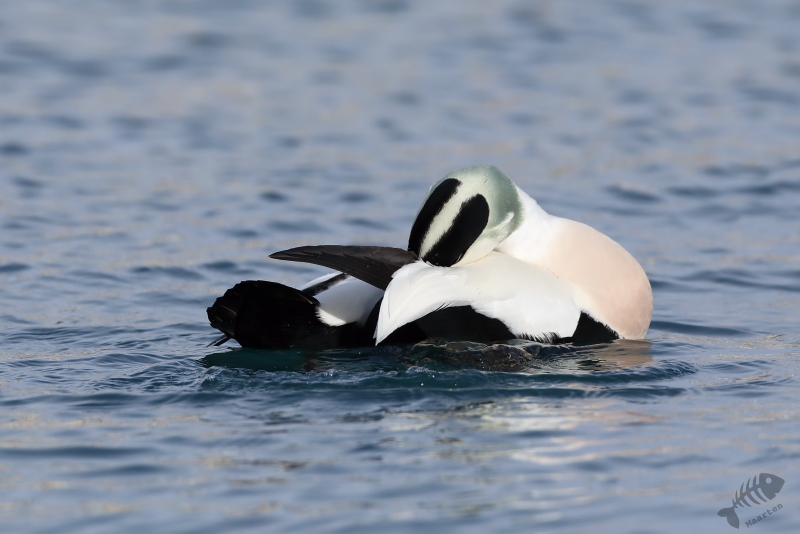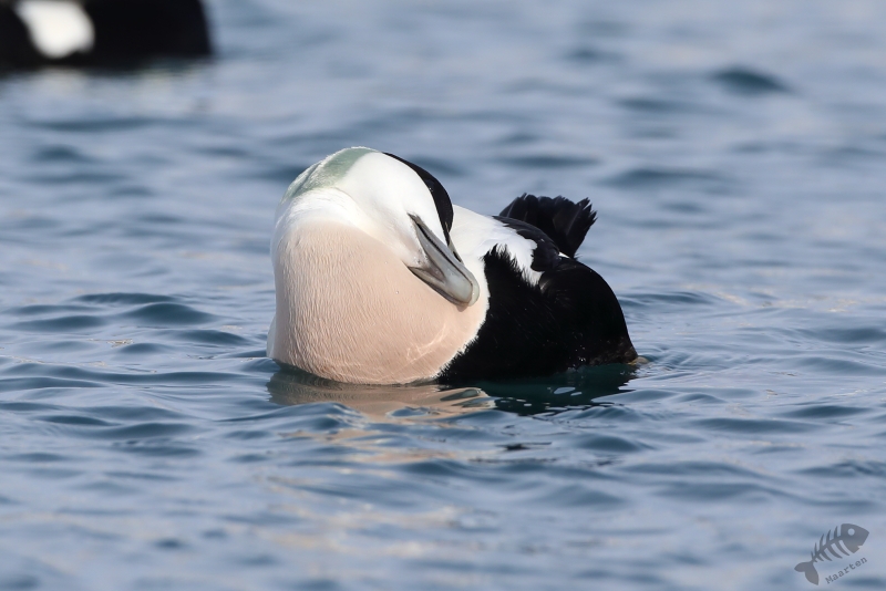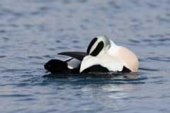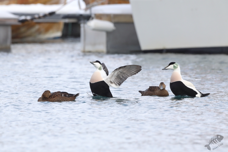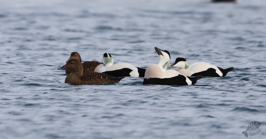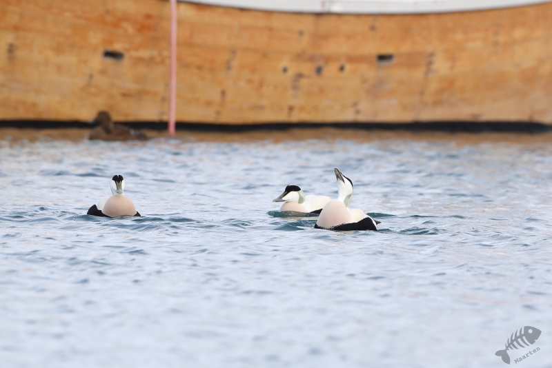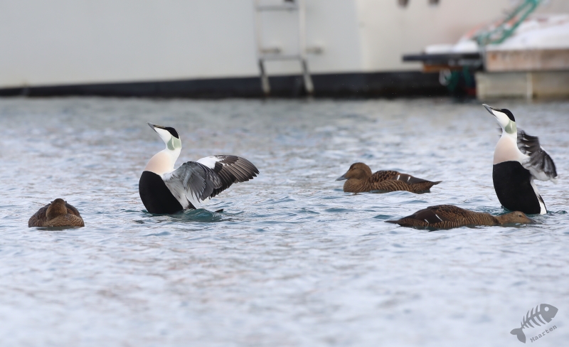 Misschien was het het mooie weer, maar op een gegeven moment zag ik dat de Eiders ook druk waren met baltsen. Hierbij hebben ze verschillende bewegingen die ze afwisselend uitvoeren. Ze gooien bijvoorbeeld hun kop naar achter waarbij ze zo’n oer, noordelijk geluid maken (zoals Duikers en andere Eiders en IJseenden ook doen). Of ze richten zich op en klepperen even met hun vleugels: dat moet toch indruk wekken op de dames? En als dat niet zo is, zwemmen ze er achteraan waarbij ze ook weer luid roepen. Heerlijke taferelen om naar te kijken.