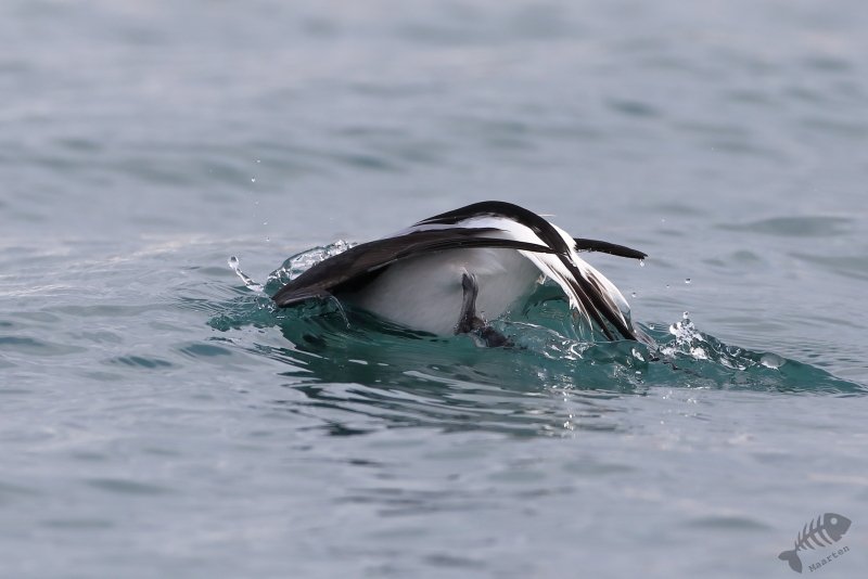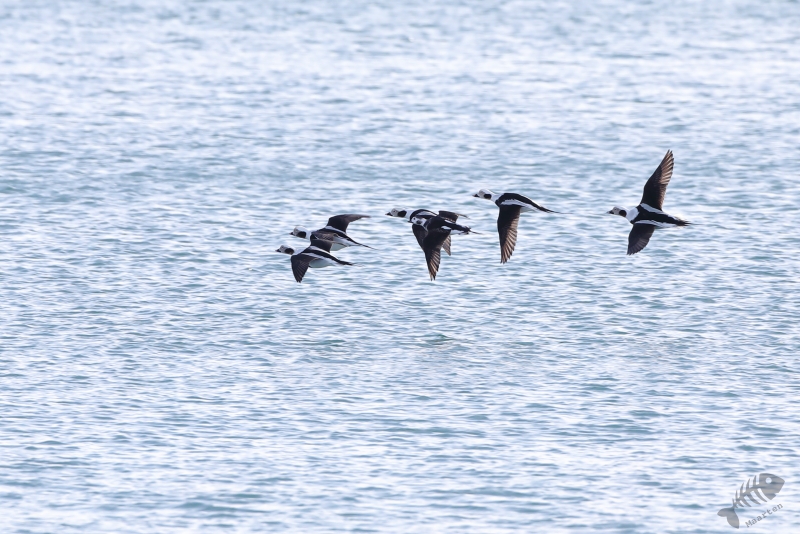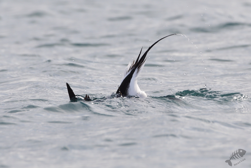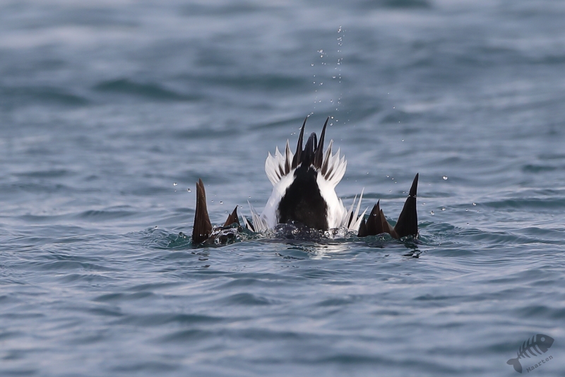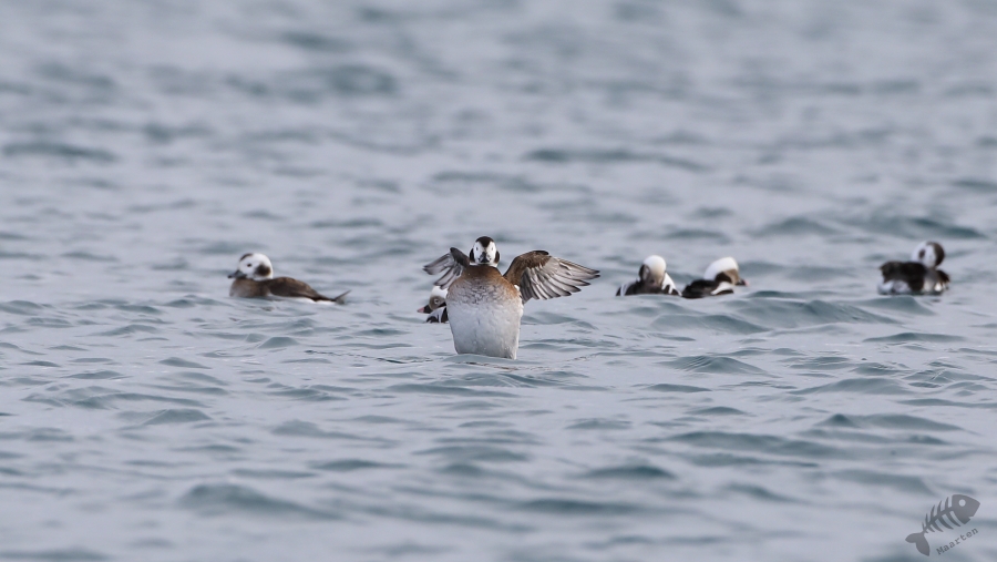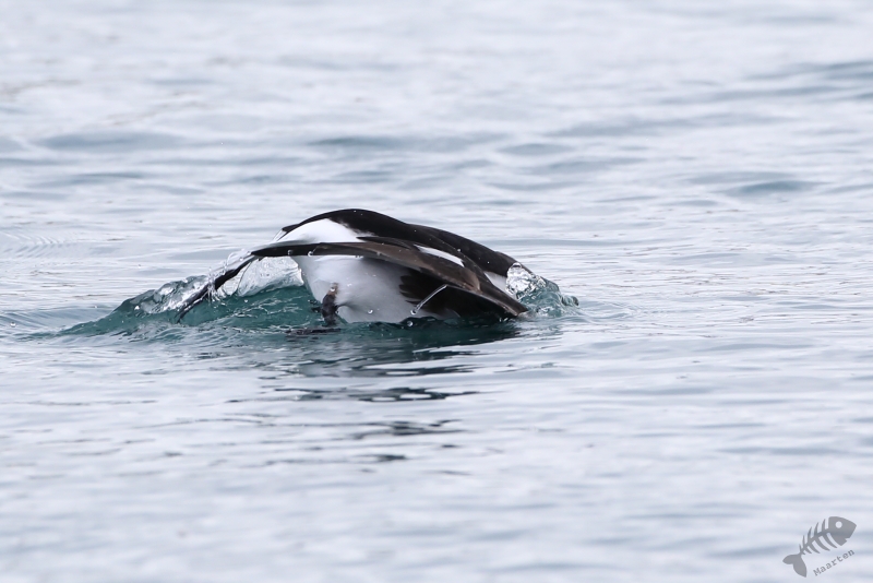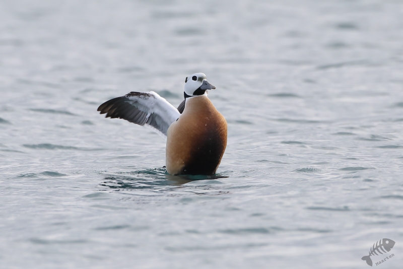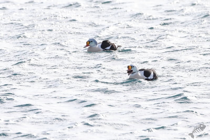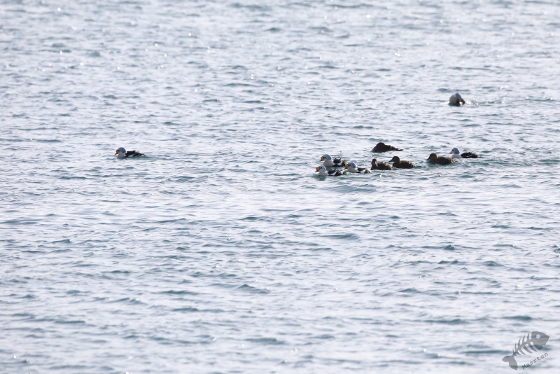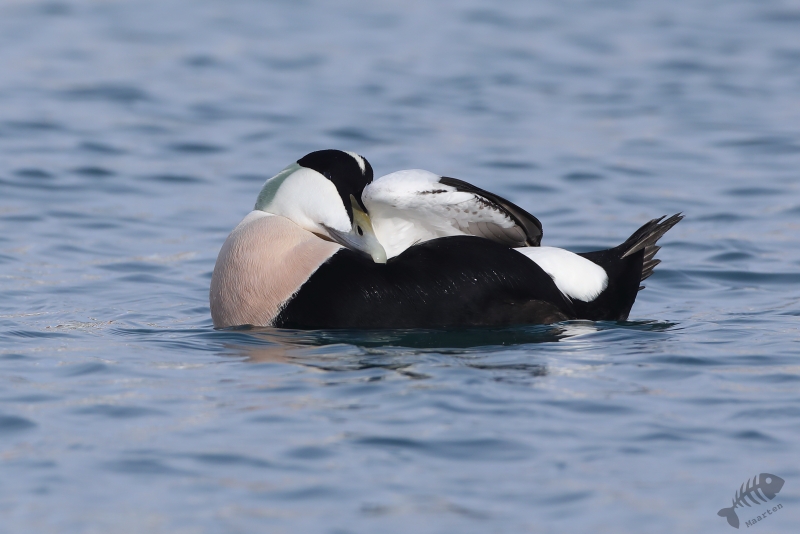 Misschien was het het mooie weer, maar op een gegeven moment zag ik dat de Eiders ook druk waren met baltsen. Hierbij hebben ze verschillende bewegingen die ze afwisselend uitvoeren. Ze gooien bijvoorbeeld hun kop naar achter waarbij ze zo’n oer, noordelijk geluid maken (zoals Duikers en andere Eiders en IJseenden ook doen). Of ze richten zich op en klepperen even met hun vleugels: dat moet toch indruk wekken op de dames? En als dat niet zo is, zwemmen ze er achteraan waarbij ze ook weer luid roepen. Heerlijke taferelen om naar te kijken.