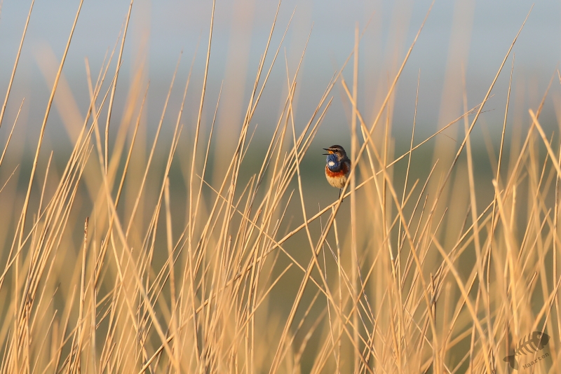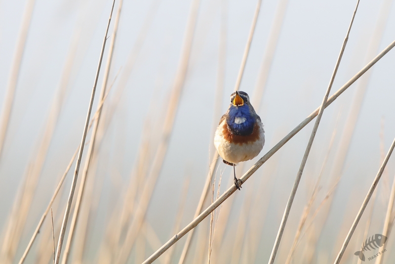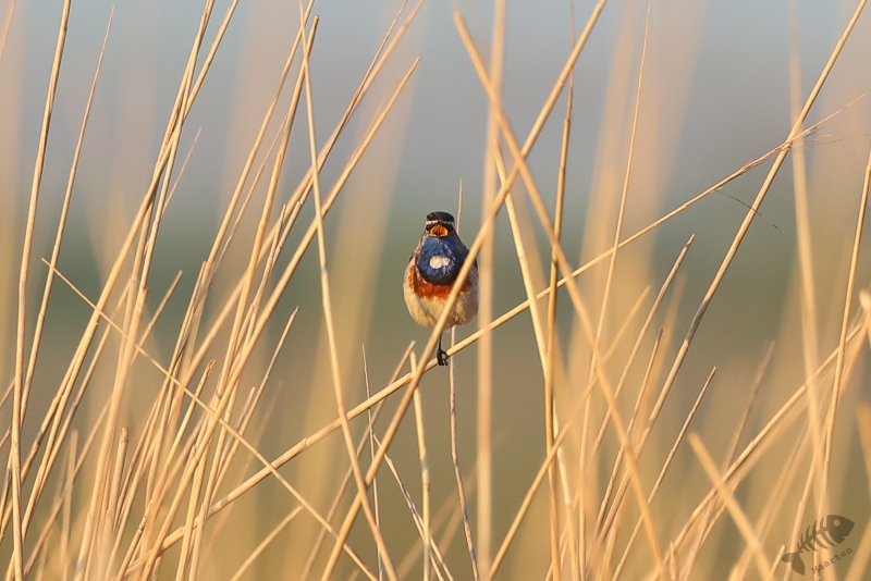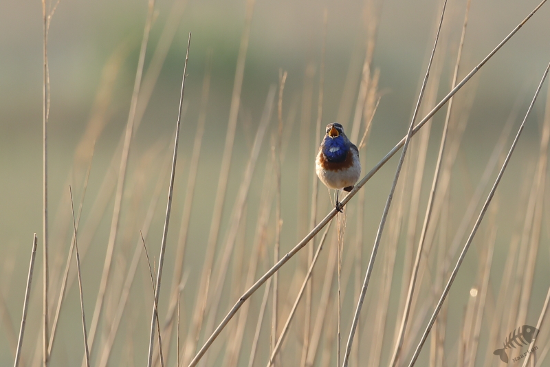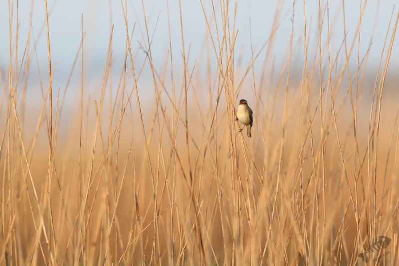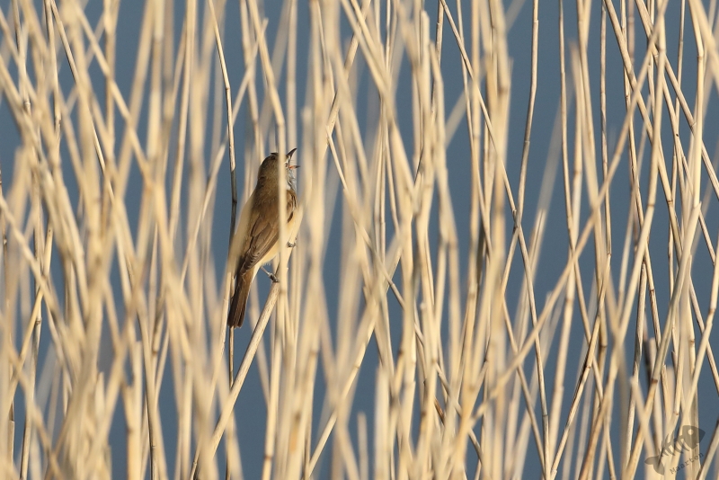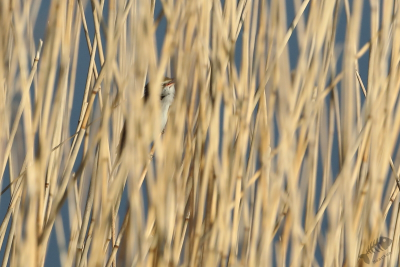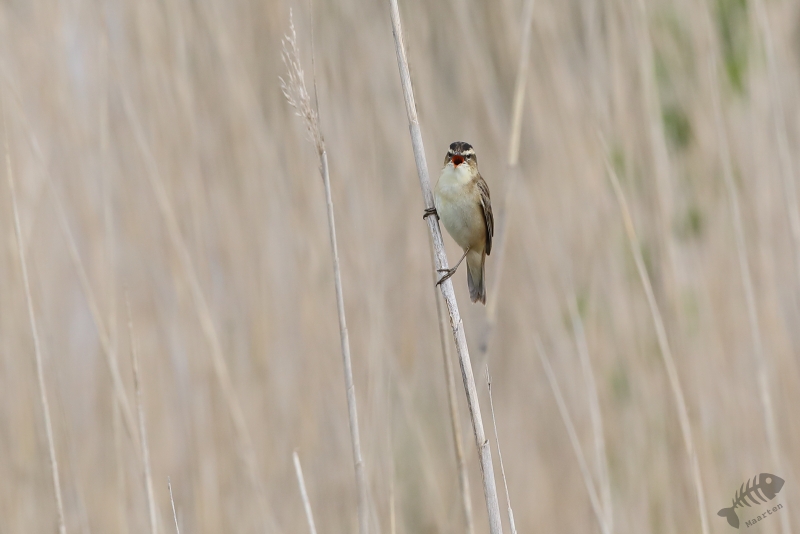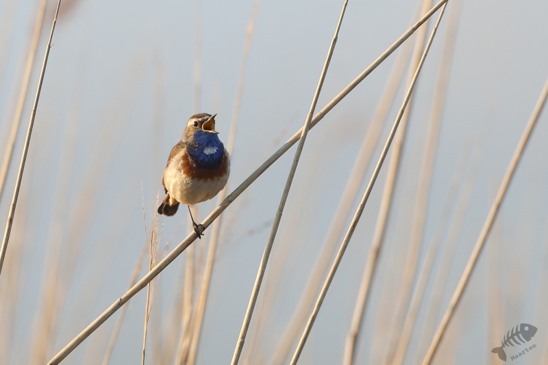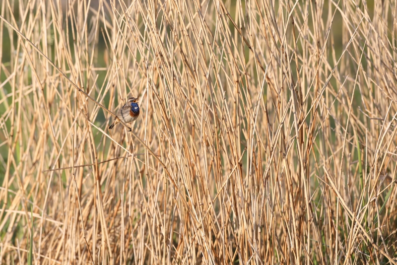 Ik wilde dus beginnen bij het Gemaal en vandaar de rietkraag aflopen opzoek naar alle mogelijke rietzangertjes: Rietzanger, Blauwborst, Rietgors en verder alles wat zich maar wilde laten zien. En het begon meteen goed: Helemaal vooraan zat al een Rietzanger die erg enthousiast was en regelmatig bovenin de rietstengels klom om zich goed te laten zien, maar zich vooral goed liet horen. Dwars door deze over-enthousiaste zanger hoorde ik ineens een bekende aanzet tot een ander absoluut voorjaar geluid. Ook een Blauwborst liet zich goed horen én zien, zodat ik binnen het kwartier al 2 van de wenssoorten van vandaag te pakken had. Deze 2 rietzangers kreeg ik afwisselend mooi in beeld, maar 1x werd mijn aandacht afgeleid en heb ik ook nog een Rietgors vastgelegd.