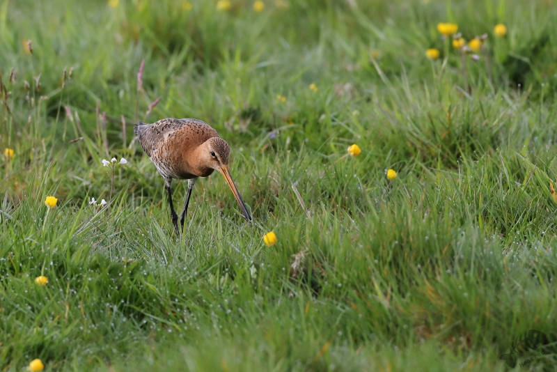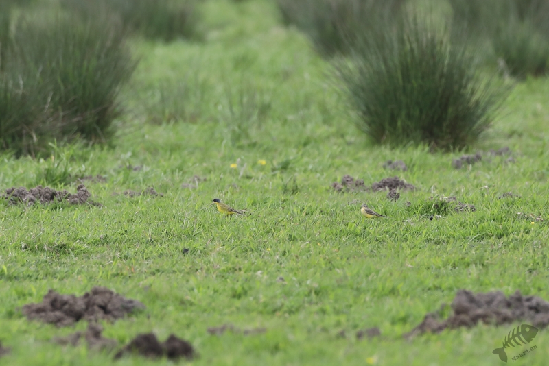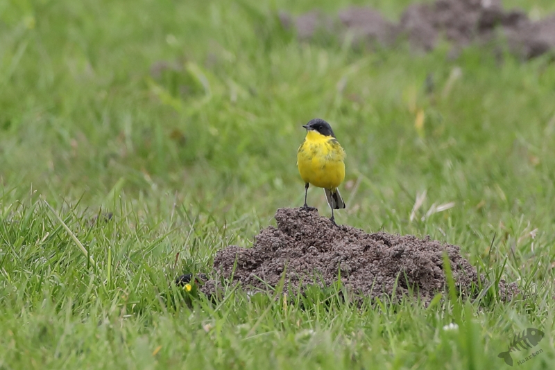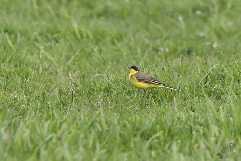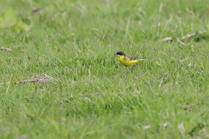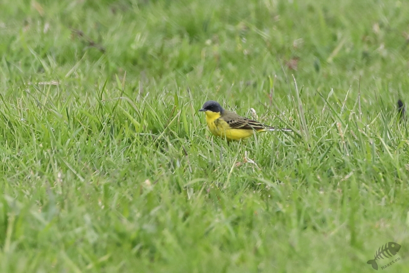 Op waarneming.nl had ik gezien dat er ook bijna dagelijks een Steenuiltje gezien werd bij de boerderij die onderaan de dijk ligt aan het begin van het fietspad (tenminste, daar waar ik altijd begin…). Ik hoefde niet eens lang te zoeken: Het Uiltje bleek een beetje soezend van het mooie weer te genieten. Na nog een paar foto’s van een Kleine Karekiet gemaakt te hebben (een dag in het voorjaar is natuurlijk niet compleet zonder deze lekkere rietzanger), ben ik weer in de auto gestapt en heb de weg die de polder doorkruist afgereden. Op waarneming.nl stond niet alleen een melding van een Steenuil of Porseleinhoen, maar ook van een Noordse Gele Kwikstaart. Heel langzaam rijdend heb ik de weiden afgespeurd en al vrij snel vond ik een aantal Gele Kwikstaarten vergezeld van een stel Tapuiten. Da’s geen verkeerd groepje! Toen ik de Gele Kwikstaarten beter bekeek, bleek er inderdaad een afwijkende soort bij te zitten. Een Gele Kwikstaart met een zwarte kop. Het was de Noordse variant! Helaas bleven ze behoorlijk op afstand, maar na behoorlijk lang wachten kwam juist de Noordse redelijk in de buurt en ik heb er best aardige plaatjes van kunnen maken.