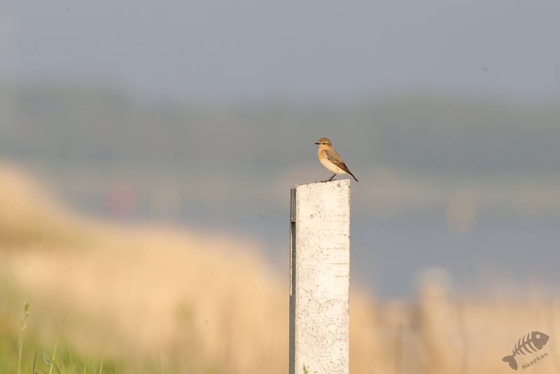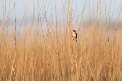 Dit zijn altijd zulke dankbare voorjaars zangers die vaak in weer en wind de moeite nemen hoog in een rietstengel te gaan zitten zingen, zodat ik altijd wel een leuke foto van het riet mee naar huis kan nemen. Een Rietgors mag dus niet ontbreken… Toen ik dacht dat ik wel voldoende plaatjes van deze soorten had, ben ik over de dijk gaan wandelen om te zien of ik inderdaad een Grote Karekiet kon vinden. Bij de eerste rietkraag buitendijks zat hij niet. Wel vond ik een Tapuit, wat natuurlijk ook altijd een dankbare fotografie-soort is. En terwijl ik zo met de Tapuit bezig was, hoorde ik uit de verte, bij de tweede rietkraag buitendijks, de heerlijke, raspende zang van de Grote Karekiet. Ik heb de Tapuit even gelaten voor wat hij is en ben snel naar die tweede rietkraag gelopen. Het was lastiger dan vorig jaar, maar ook nu lukte het me weer om hem te zien en een om een klein filmpje te maken met de zanger in actie. Helaas leek dit individu wat schuwer en verdween hij regelmatig onderin het riet. Om hem niet te lang te storen, besloot ik maar terug te lopen naar de auto.
