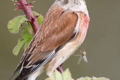 Een soort die zich in de Polder ook vaak van zijn beste kant laat zien is de Kneu. Gelukkig was dat ook nu weer het geval. In de Bramenstruiken waren ze regelmatig zingend te zien en kreeg ik de plaatjes waar ik in het begin van deze hobby alleen maar van kon dromen… Toen ik de foto’s aan het uitwerken was, bleek 1 van de Kneutjes een bezoeker te hebben. Wat een monster vergeleken bij zo’n vogeltje!