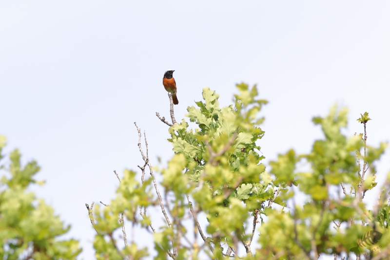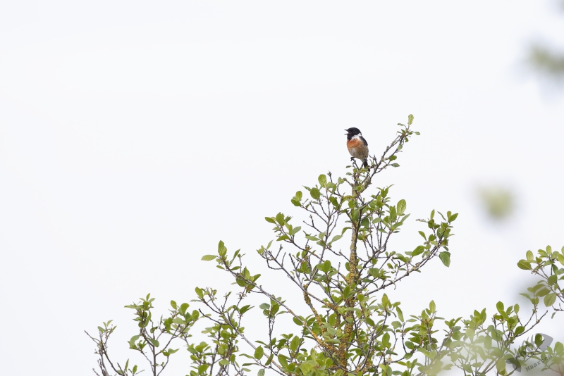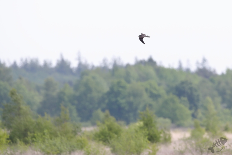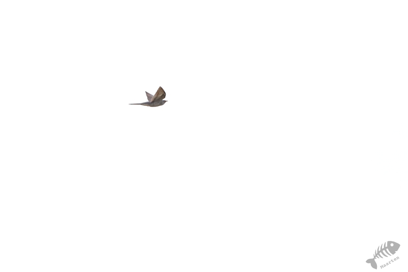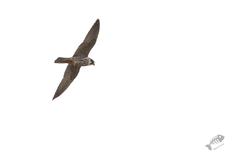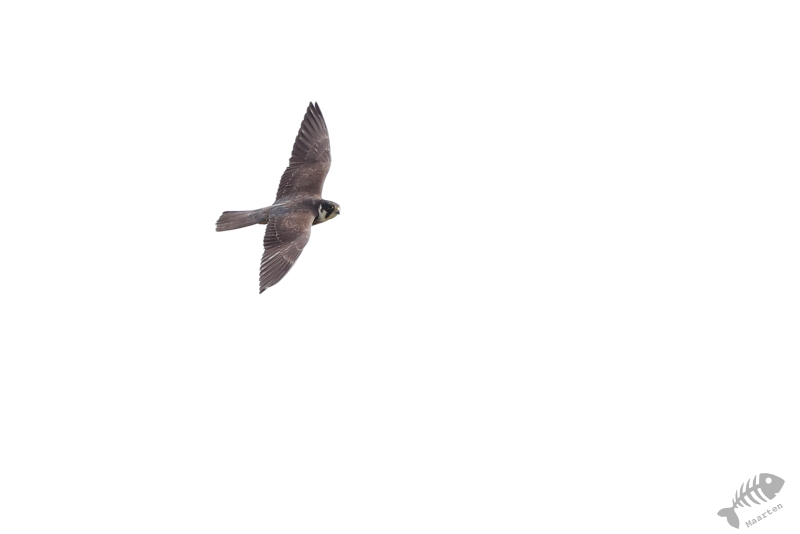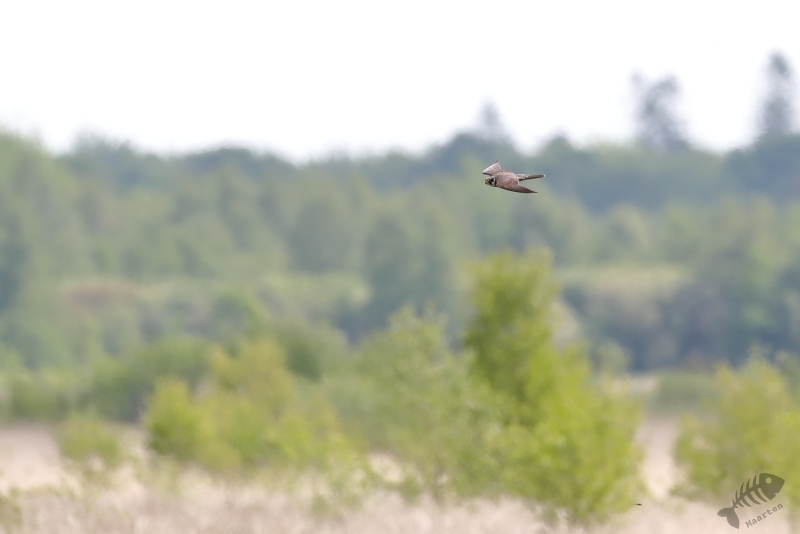Terwijl we zo naar de Kraanvogels stonden te kijken, bleken ook de Boomvalken het luchtruim weer gekozen te hebben. Alleen lukte het me niet ze boven dit veld vast te leggen. Daarom gingen we weer terug naar de dijk en heb ik van daaraf geprobeerd deze super-jagers weer eens mooi vast te leggen. Na een half uurtje kreeg ik de eerste resultaten, eerst nog op behoorlijke afstand, maar even daarna vlogen ze ook weer wat dichterbij en werden de plaatjes steeds beter. Ik had pas wat later in de gaten dat ik een hele tijd, terwijl ik bezig was met de Boomvalken, een zang op de achtergrond had. Opeens drong het tot me door dat er een Gekraagde Roodstaart in de top van een belendende boom zat te zingen. Op precies dezelfde plek als waar ik vorig jaar een Geelgors wist vast te leggen, lukte dit nu met deze kleurrijke zanger.