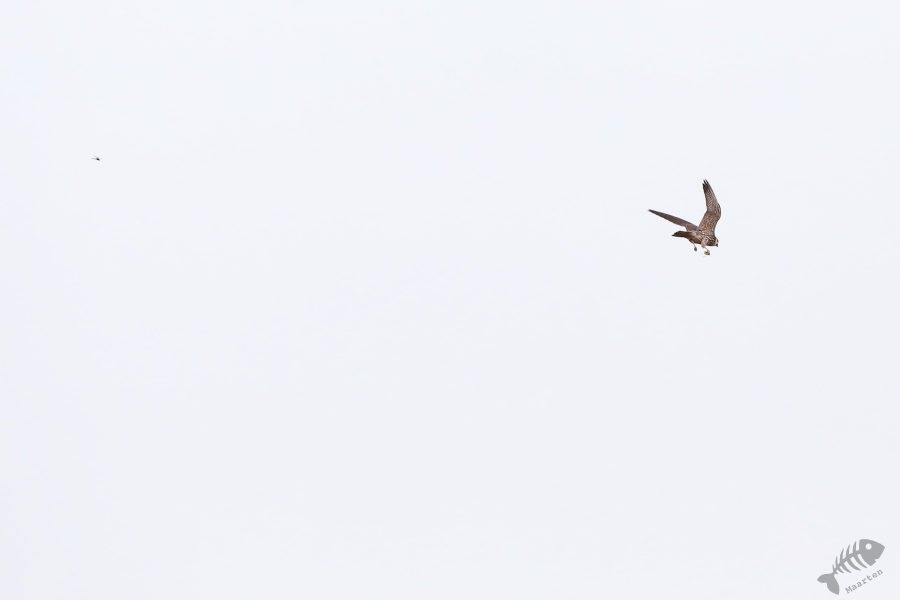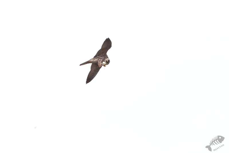 Ik had bedacht om weer terug naar de dijk te gaan om toch even te kijken of de Boomvalken nog nét wat mooier te zien zouden zijn. Arie vond het prima, hij zag zich al even onderaan de dijk liggen om te rusten terwijl ik druk stond te doen. Toen we er aankwamen en alles opgesteld was (mijn camera en statief en Arie in het gras), heb ik welgeteld een kwartier kunnen fotograferen. Daarna begon het te regenen… Gelukkig had ik nog wat plaatjes kunnen maken, maar de lol ging er een beetje vanaf. Omdat we ook het hele stuk naar huis nog moesten rijden, hebben we besloten maar richting huis te gaan. Het was een mooie dag geweest, met prachtige waarnemingen én leuke resultaten.