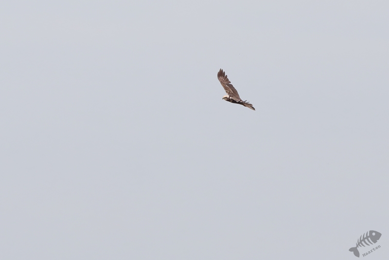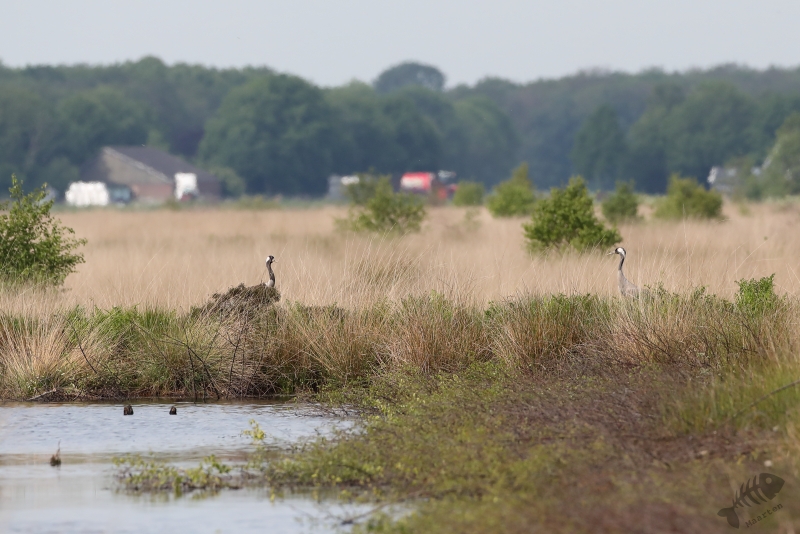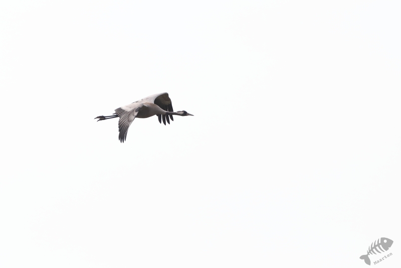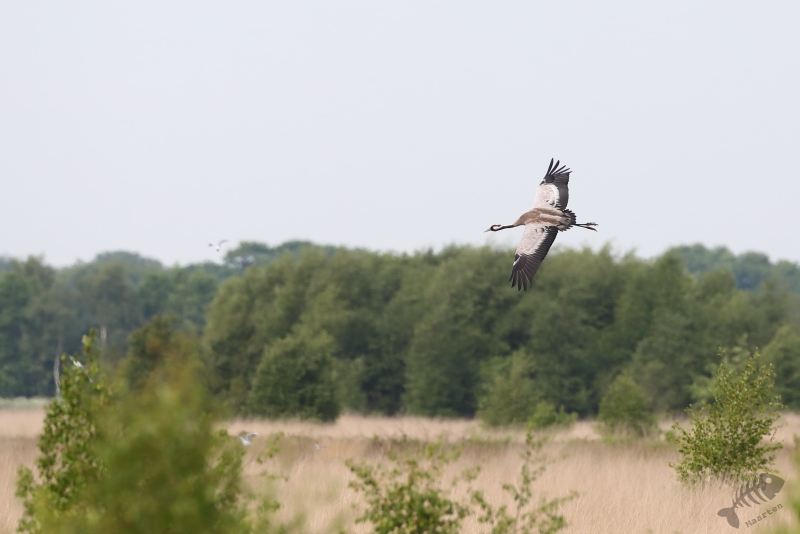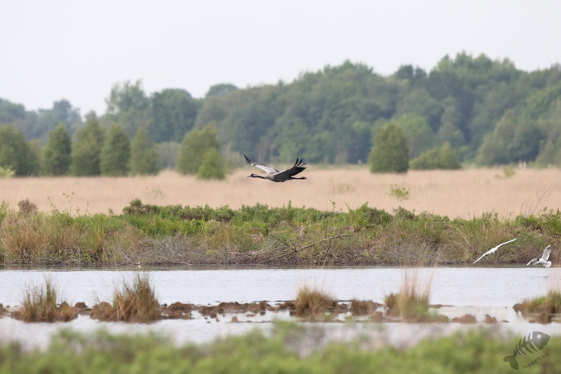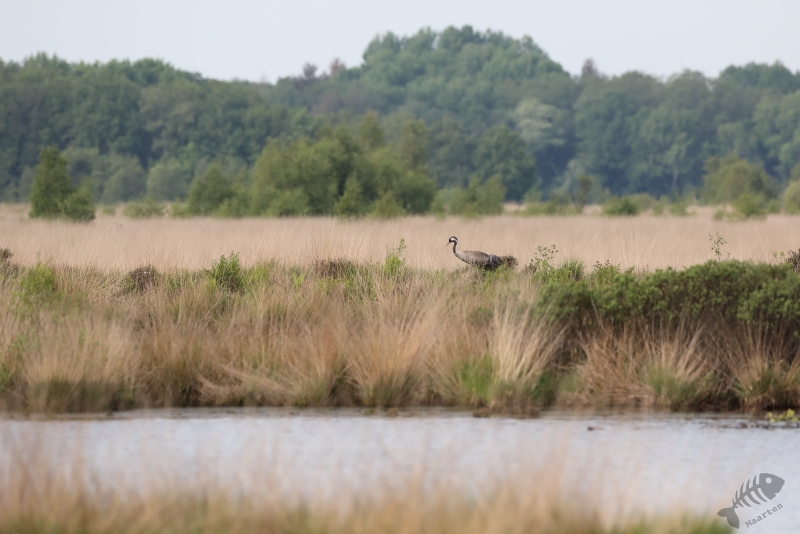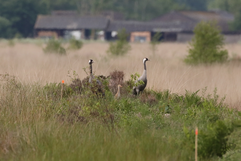 Helaas bleek het dijkje, waar we tijdens een eerder bezoek heel mooie Libellen konden zien, weer afgesloten, zodat we niet heel dichtbij de Libellen konden komen. Ook bleken de Boomvalken een pauze te hebben, dus was er eigenlijk niet zo heel veel te zien vanaf de dijk. Een jagende Bruine Kiekendief is natuurlijk ook een heel mooi gezicht, dus helemaal voor niets was deze trip zeker niet. We besloten weer richting het bezoekerscentrum te rijden, maar moesten al heel snel de auto weer aan de kant zetten. Aan de overkant van een plassig gebied liep een Kraanvogel! Toen we daar met de nodige aandacht naar aan het kijken waren, stopte er een paar fietsers bij ons. Het bleken Belgen te zijn die veel reisden om vogels te zien en nu hierheen gekomen waren om Kraanvogels te spotten. Ze hadden dus geluk want de vogel liet zich in eerste instantie goed op de grond zien, maar na een tijdje steeg hij op en vloog niet ver van ons voorbij. Na een rondje gevlogen te hebben met de zo kenmerkende, luide roep roepend , landde hij weer op de plek waar hij vandaan kwam en toen bleken er ineens 2 te zitten! De De Belgen waren inmiddels weer vetrokken en wij stonden ook op het punt toen Arie ontdekte dat een gezinnetje was! Er liep ook nog een jong rond. Dat hadden we allebei nog nooit gezien, en met ons heel veel mensen niet, dus we genoten nog even van dit speciale moment.