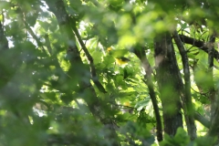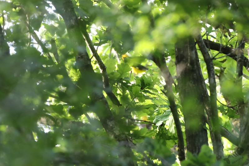 We hadden het zo uitgekiend dat we rond 7 uur in het Veen zouden zijn, wat betekende dat we om kwart over 5 in de auto zaten om de reis te beginnen. Deze ging heel voorspoedig en zo waren we inderdaad rond 7 uur bij het Fochteloërveen. We reden direct door richting de eerste schuilhut en werden verwelkomd door wel iets heel moois: er bleken verschillende Wielewalen in de bosjes bij de hut te zitten. Deze waren volop aan het zingen: het was echt een prachtig gehoor en we hebben er dan ook een tijdje van staan te genieten. Natuurlijk bestond mijn uitdaging eruit dat ik ze fotografisch wilde vastleggen en dat bleek inderdaad een enorme uitdaging te zijn. Heel af en toe kwamen de felgekleurde zangers even in beeld, maar hoe we de boomkruinen ook afspeurden, goed in beeld kwamen ze eigenlijk niet. Op een bepaald moment had ik een glimp van ze opgevangen en heb ik 2 foto’s kunnen maken. Als je heel goed zoekt, kun je zien dat er 2 mannetjes te zien zijn… Wat ik achteraf erg dom van mezelf vond, was dat ik geen filmpje gemaakt heb. Ik ben dus ook geluiden aan het verzamelen en hier had ik wel heel mooi de kans de Wielewaal ook zo vast te leggen. Maar omdat ik zó bezig was met het maken van een foto, heb ik er niet aan gedacht en daar heb ik nu heel erg spijt van.