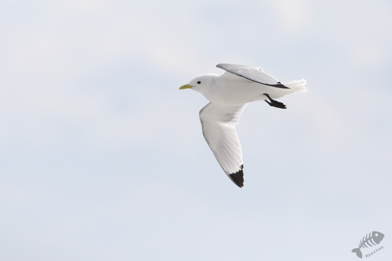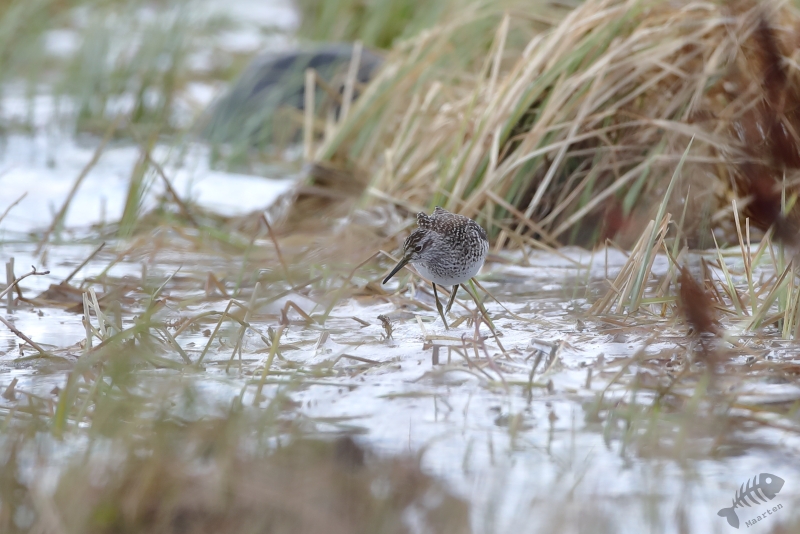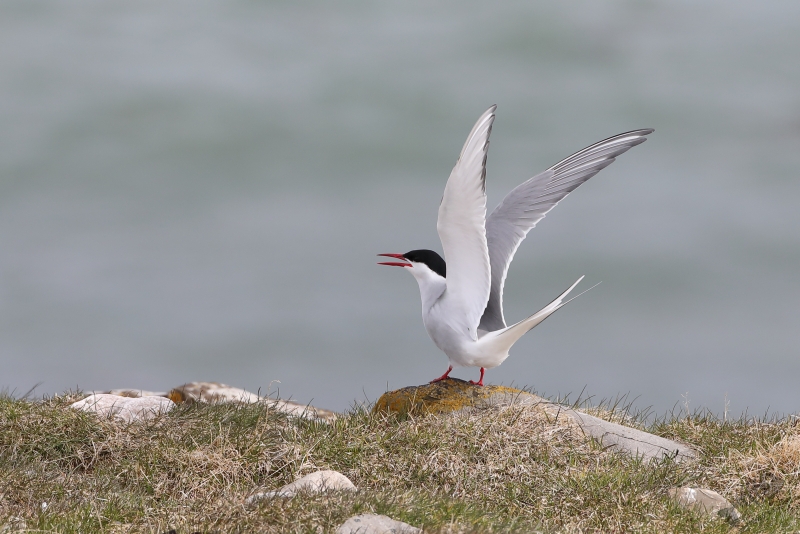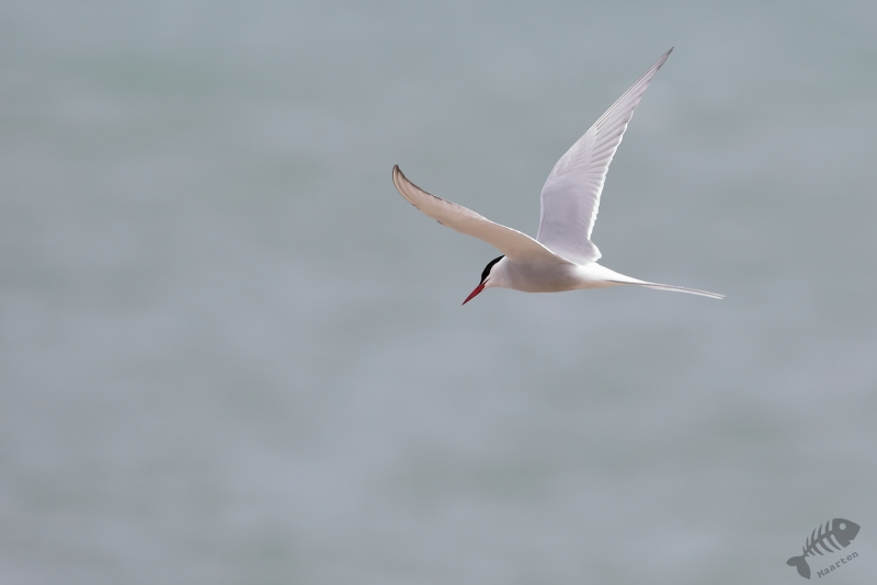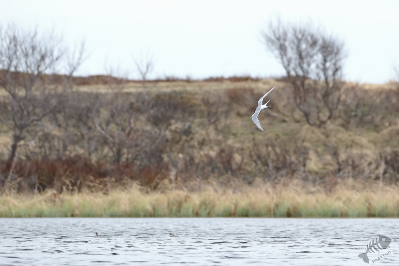Terwijl ik daar maar druk mee was, hoorde ik een bekend, heerlijk geluid: het “schrieken” van Sterntjes! Het klonk achter me, aan de rand van het eiland, en ik besloot daar toch maar even te gaan kijken. Sterntjes kan ik zeker niet voorbij laten gaan, en zeker geen Noordse! En die zaten er: het was een hele vlucht, misschien net aangekomen vanuit het zuiden, die boven het fjord en aan de rand van het eiland druk bezig was indruk op elkaar, en daarmee ook op mij, te maken. Een aantal keer gingen er op de rand zitten en ik kreeg de mogelijkheid deze wereldreizigers mooi vast te leggen. Als er dan ook nog een Stormmeeuw heel mooi voor gaat zitten, kun je wel stellen dat de vertraging niet voor niets was. Na een lekkere tijd daar bezig te zijn geweest, vond ik het wel weer mooi en wilde weer verder. Ik ben aan de buitenkant van het eiland weer richting de auto gelopen even opgehouden door een aantal Sneeuwhazen en Bonte Strandlopertjes die zelfs bleven zitten toen ik ze voorzichtig benaderde. Daarna was ik redelijk vlot weer bij de auto, maar ook nu hoorde ik weer Sterntjes. Een aantal was aan het jagen op het water rond de brug naar het eiland en ook nu liet ik me weer verleiden om te proberen ze weer nét iets mooier in beeld te krijgen. Deze keer heb ik het alleen niet meer zo lang geprobeerd en ben ik maar snel in de auto gestapt om verdere vertraging te voorkomen.