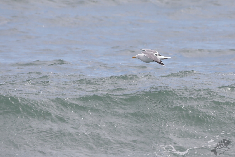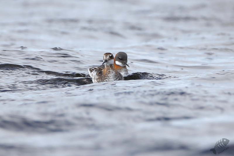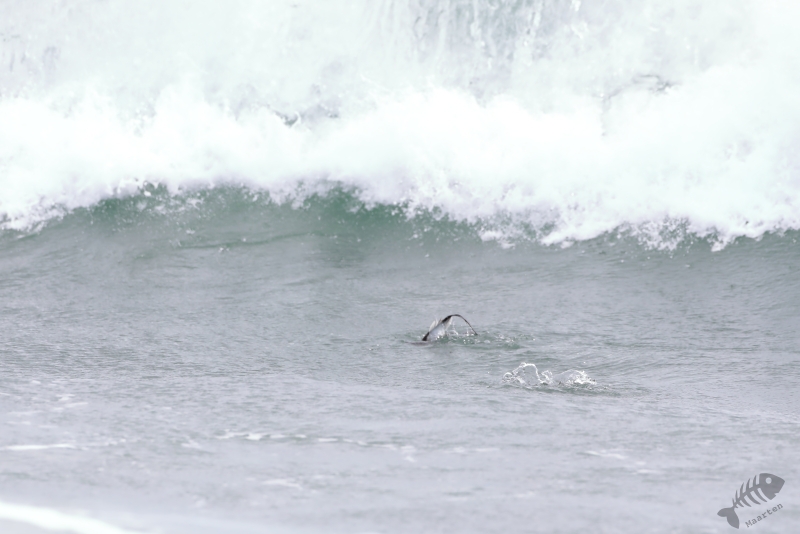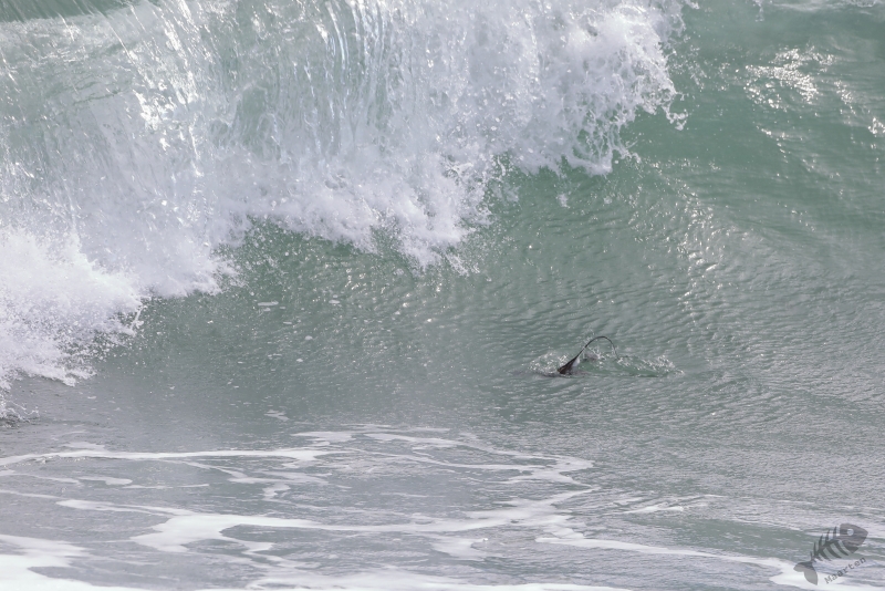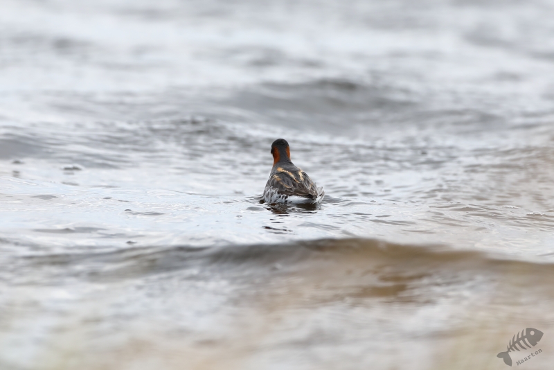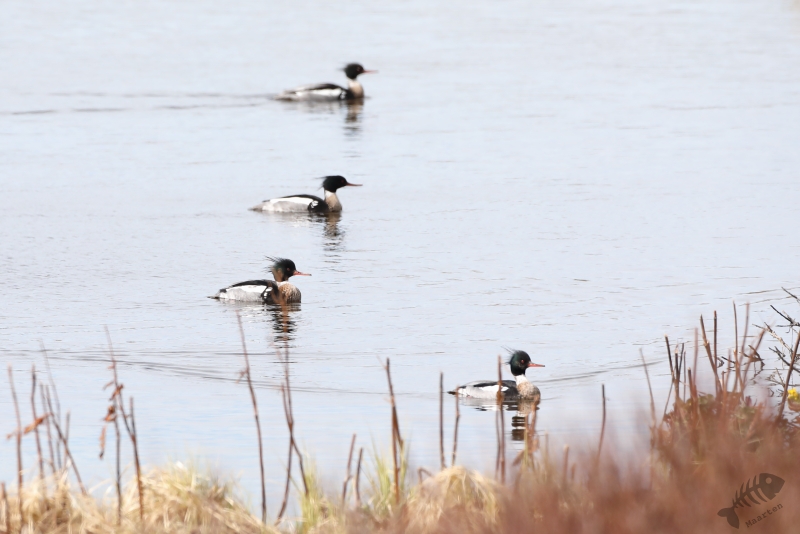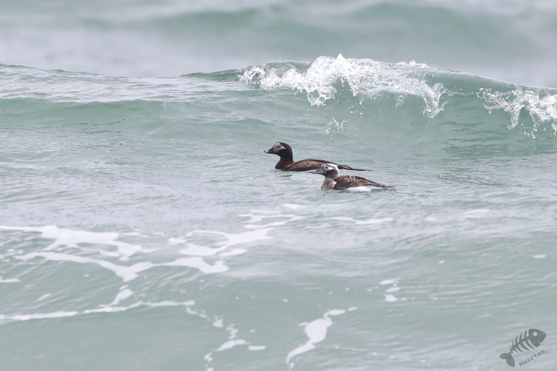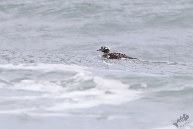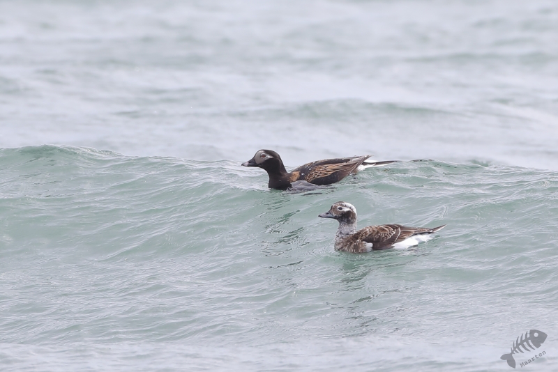 Nadat de Franjepootjes uit m’n beeld verdwenen waren, ben ik naar de rand van het eiland gelopen. De kust werd geteisterd door flinke golven waarin een koppeltje IJseenden rondzwom. Mooi om te zien was dat ze snel onderdoken wanneer een grote golf ze dreigde te overspoelen. Alleen de staart (“Longtailed Duck…”) was dan nog even zichtbaar. Toen ook deze prachtige Eendjes een eindje verderop gezwommen waren, ben ik weer teruggelopen naar Dammen om te proberen de Grauwe Franjepootjes nog wat mooier af te beelden, op weg naar m’n volgende bestemming. Ik kreeg ze niet meer in beeld, maar een groepje Middelste Zaagbekken wel en een luid alarmerende Scholekster.